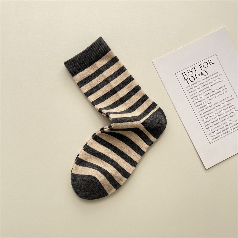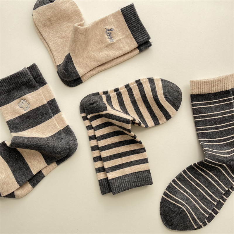 가을과 겨울 회색 복고풍 컬러 스트라이프 튜브 양말 부드럽고 섬세한 따뜻한 양말 어린이 편지 자수 더미 양말스토어 가기