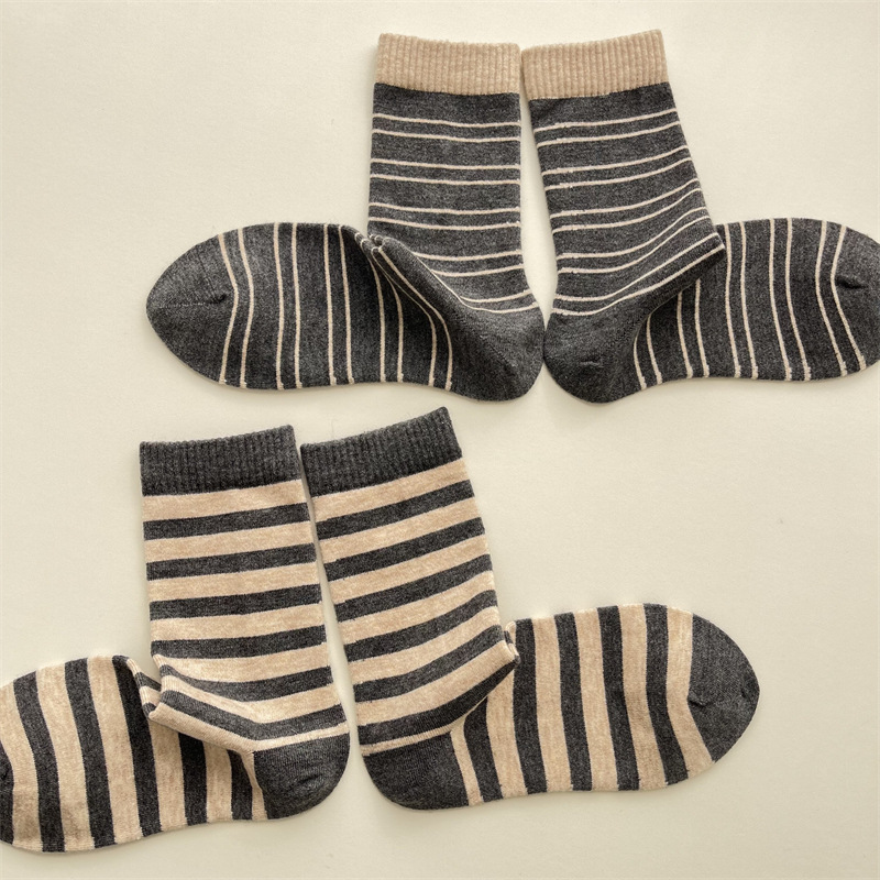가을과 겨울 회색 복고풍 컬러 스트라이프 튜브 양말 부드럽고 섬세한 따뜻한 양말 어린이 편지 자수 더미 양말