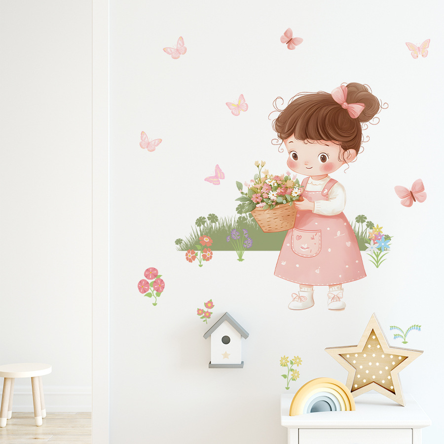 귀여운 만화 꽃 작은 소녀 나비 패턴 자기 접착 벽 스티커 캐비닛 도어 냉장고 장식 스티커 BR3332C