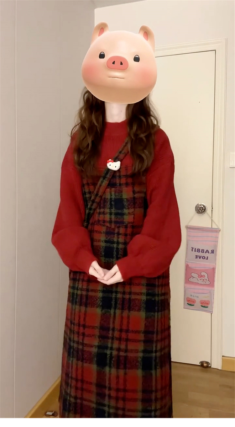 2024 년 새로운 크리스마스 레드 스웨터 격자 원피스 어린이 가을과 겨울 감각 작은 스트랩 스커트 세트스토어 가기