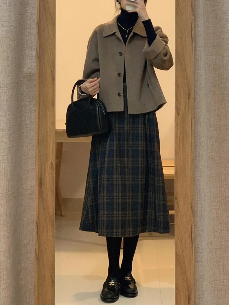 빈티지 플레이드 모직 A-라인 대형 스윙 스커트 여성의 가을 및 겨울 스웨터 높은 허리 중간 길이의 스커트 스커트 우산 스커트스토어 가기