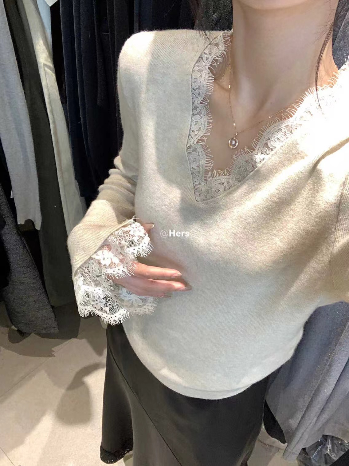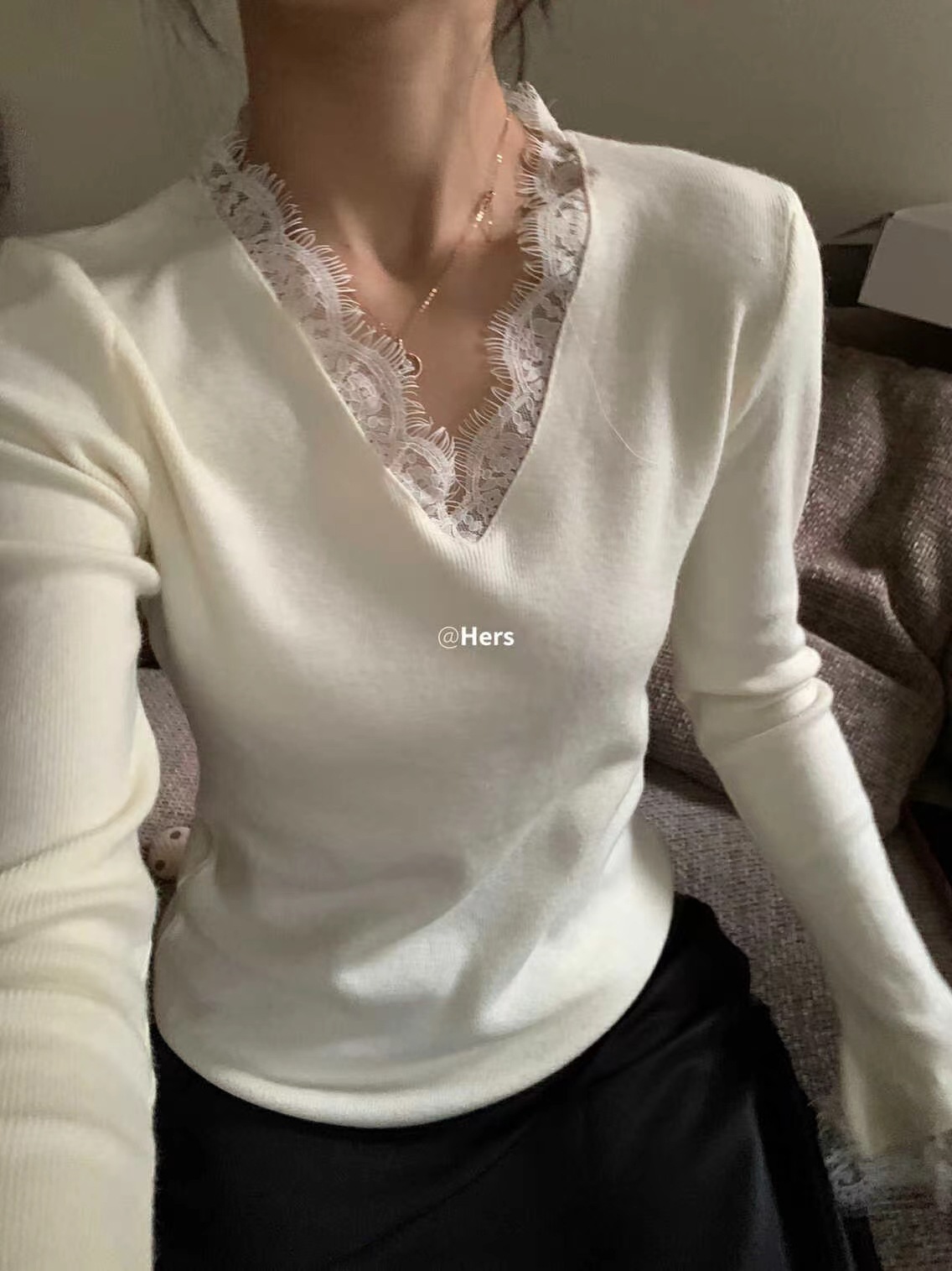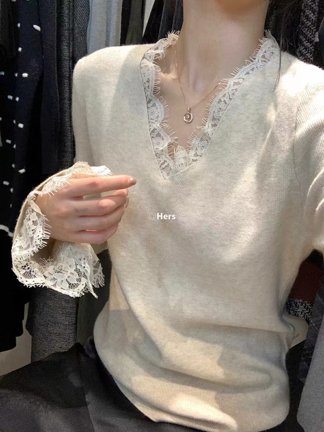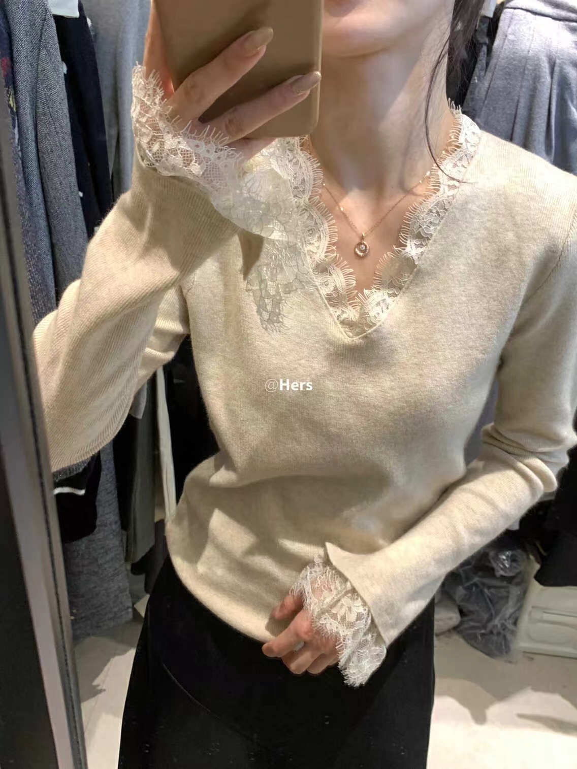 Yifantai 캐시미어 다목적 디자인 레이스 스플 라이스 솔리드 컬러 v 넥 스웨터 니트 슬림 피트 셔츠 탑 여성용스토어 가기