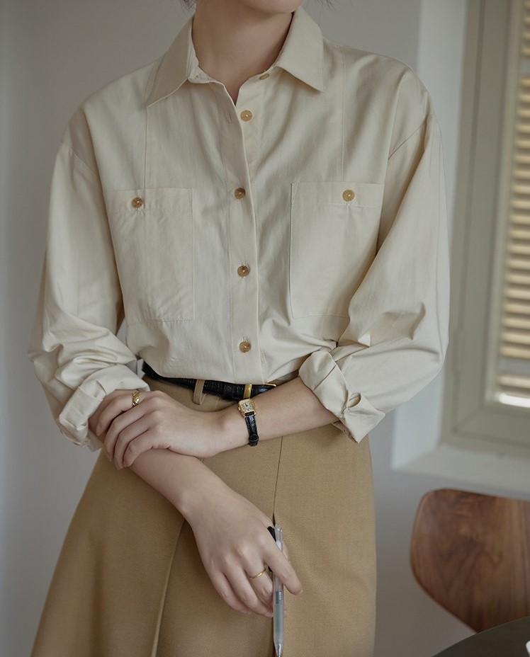 프랑스 고급 긴팔 셔츠 여성의 가을과 겨울 쌓인 내부 셔츠 디자인 소형 대형 포켓 옷깃 탑