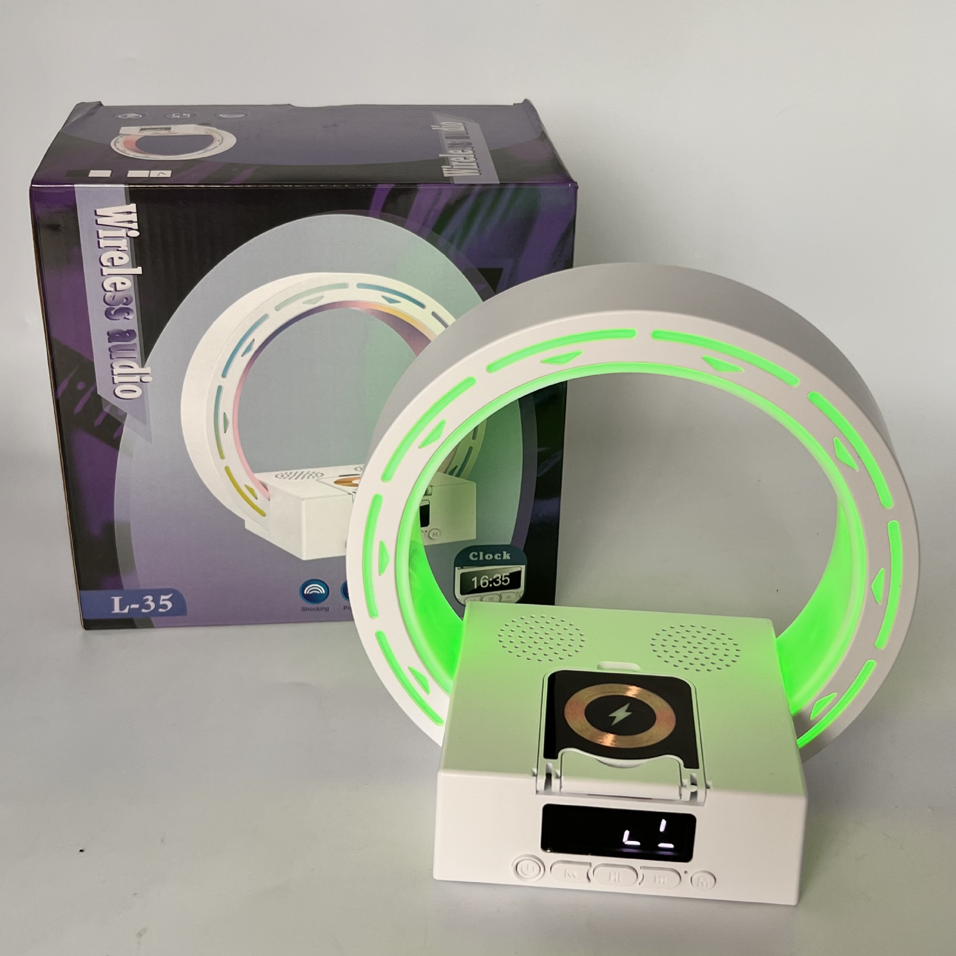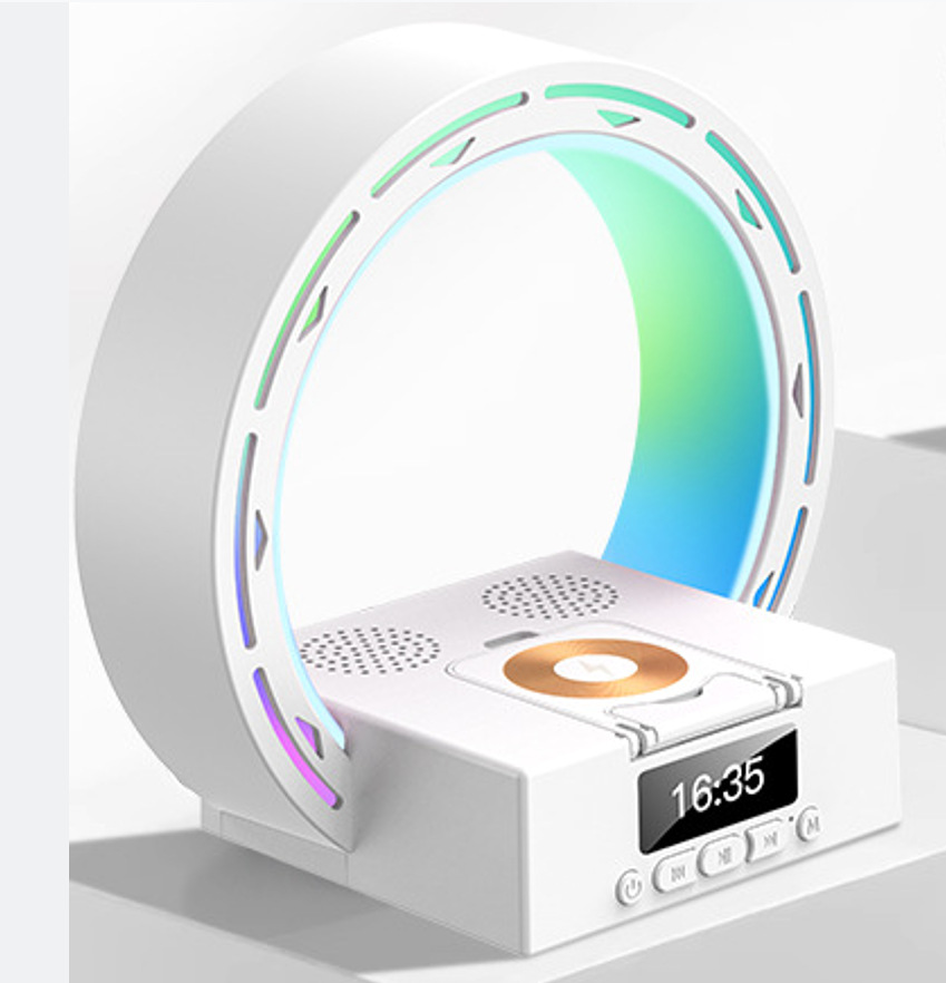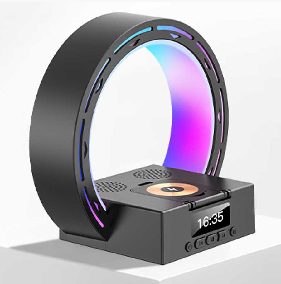 功能:蓝牙,读取TF和U盘,AUX,无线充,多彩RGB灯,时间显示,手机支架