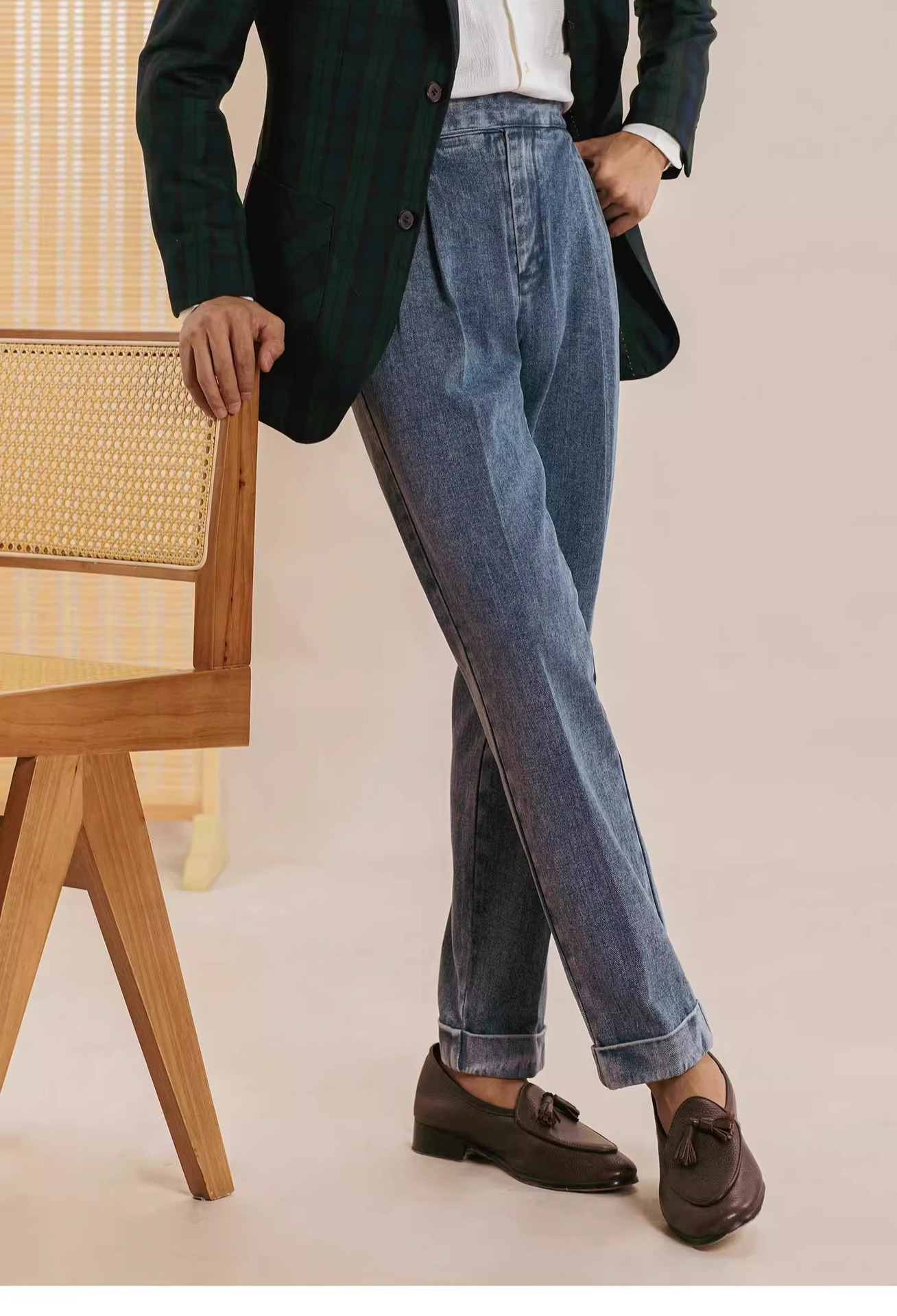 패션 트렌드 더블 주름 청바지 남성 봄과 가을 새로운 스트레이트 느슨한 세탁 캐주얼 긴 바지