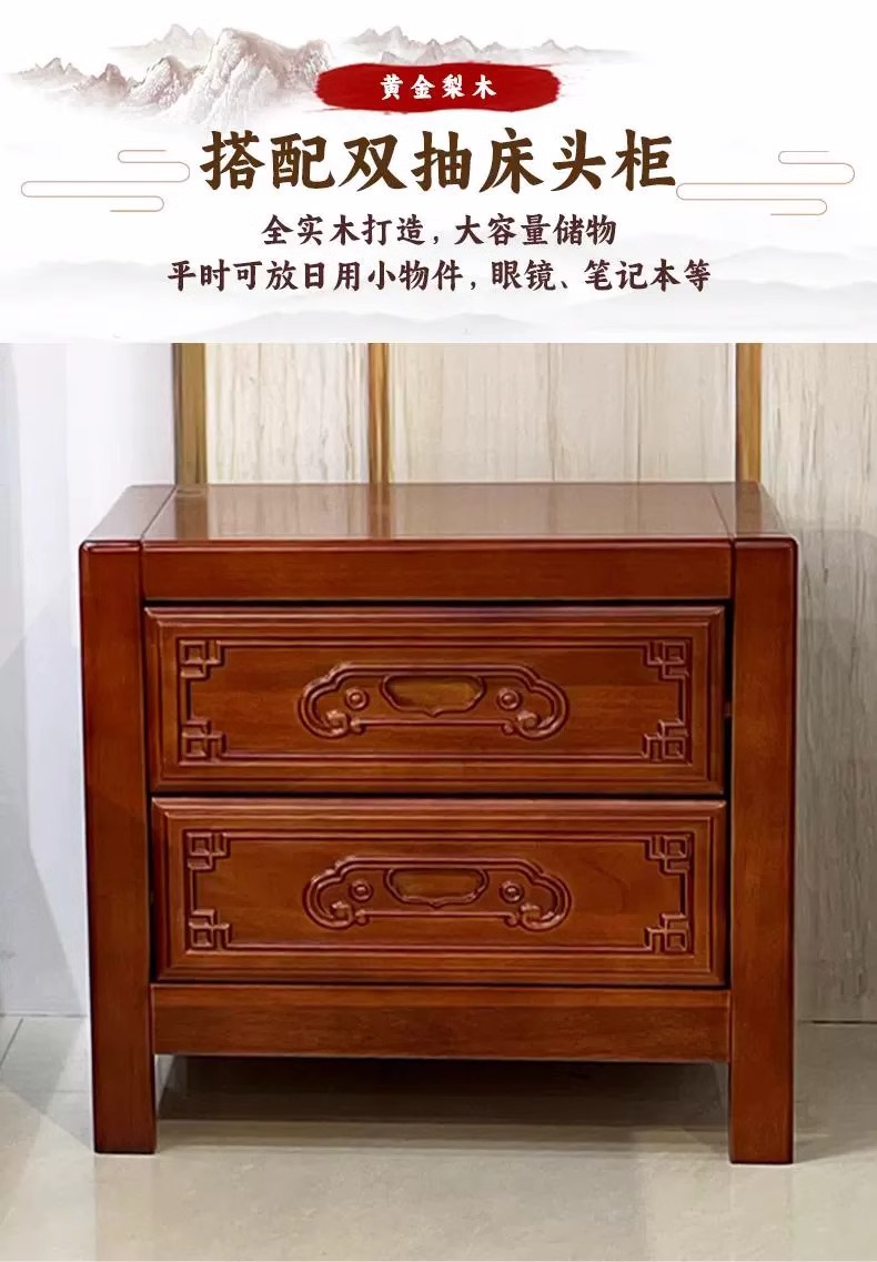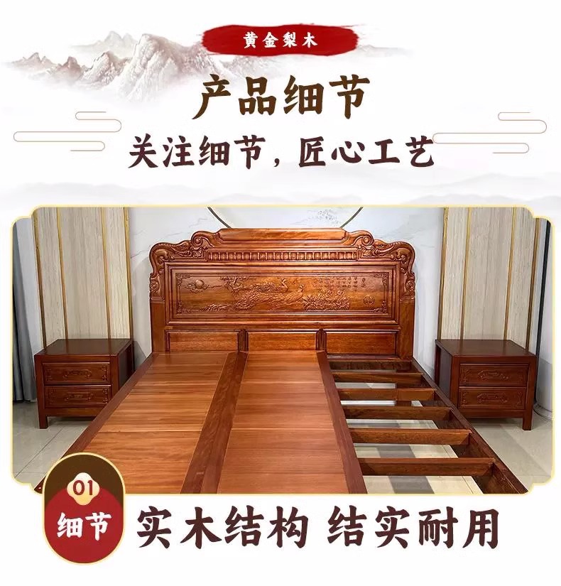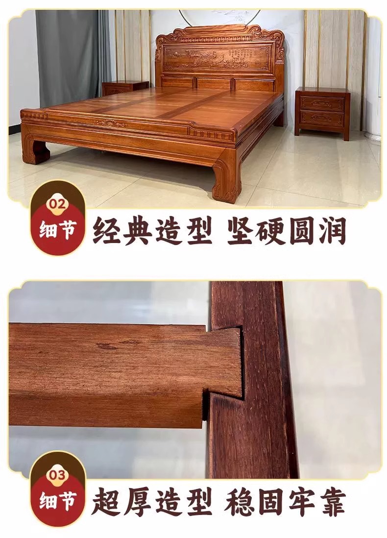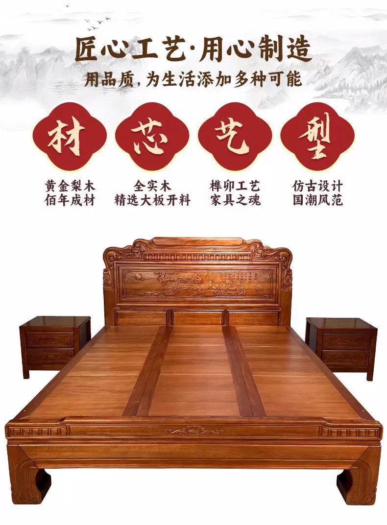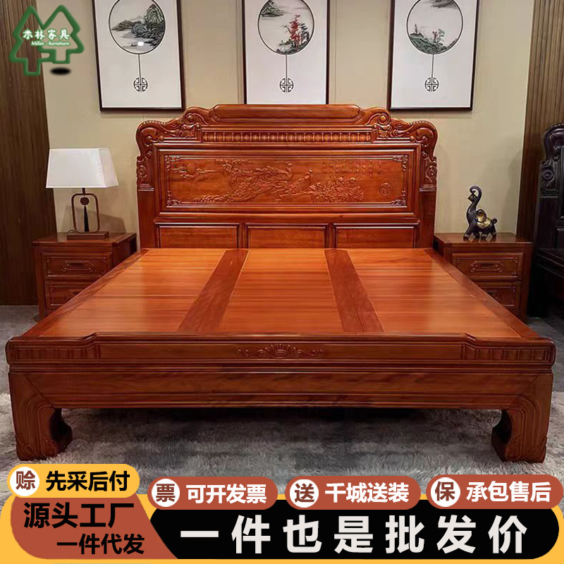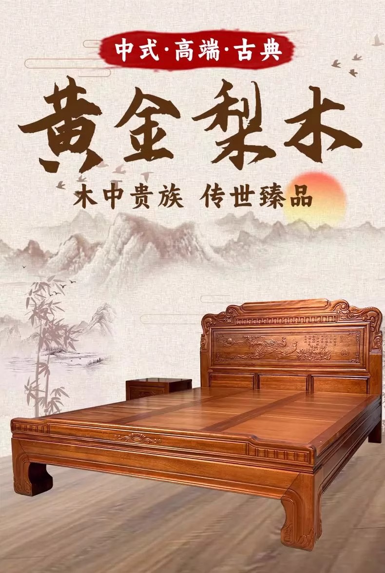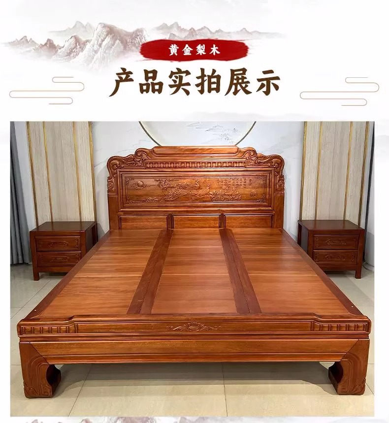 황금색 로즈우드 원목 퀸 사이즈 침대 1.8m 더블 침대 조각된 골동품 명나라 및 청나라 고전 중국식 모 끈 2M 그리드 목재 침대스토어 가기