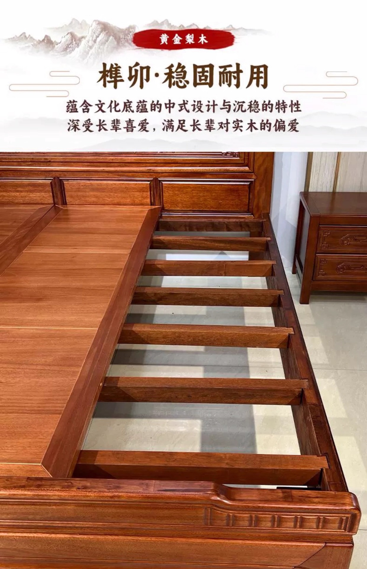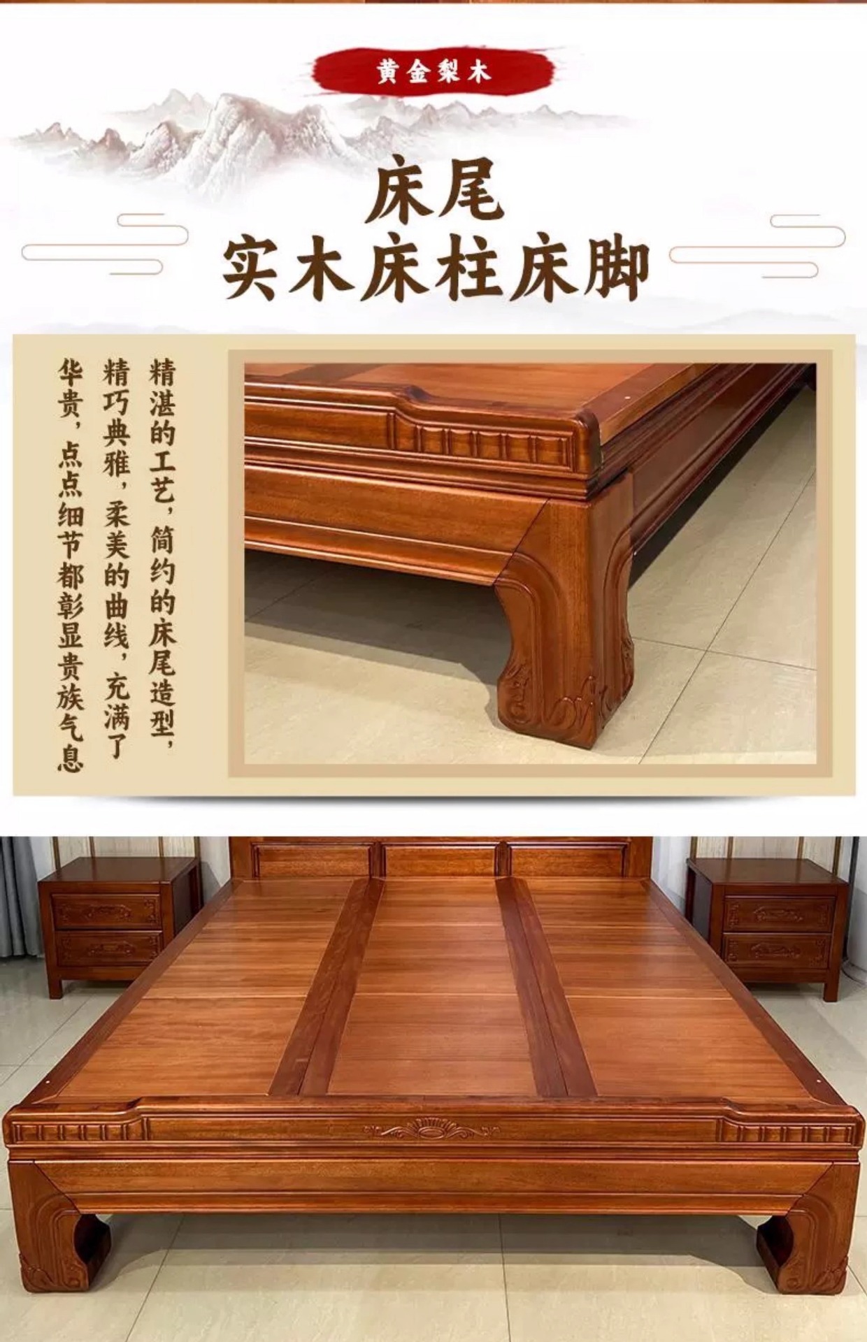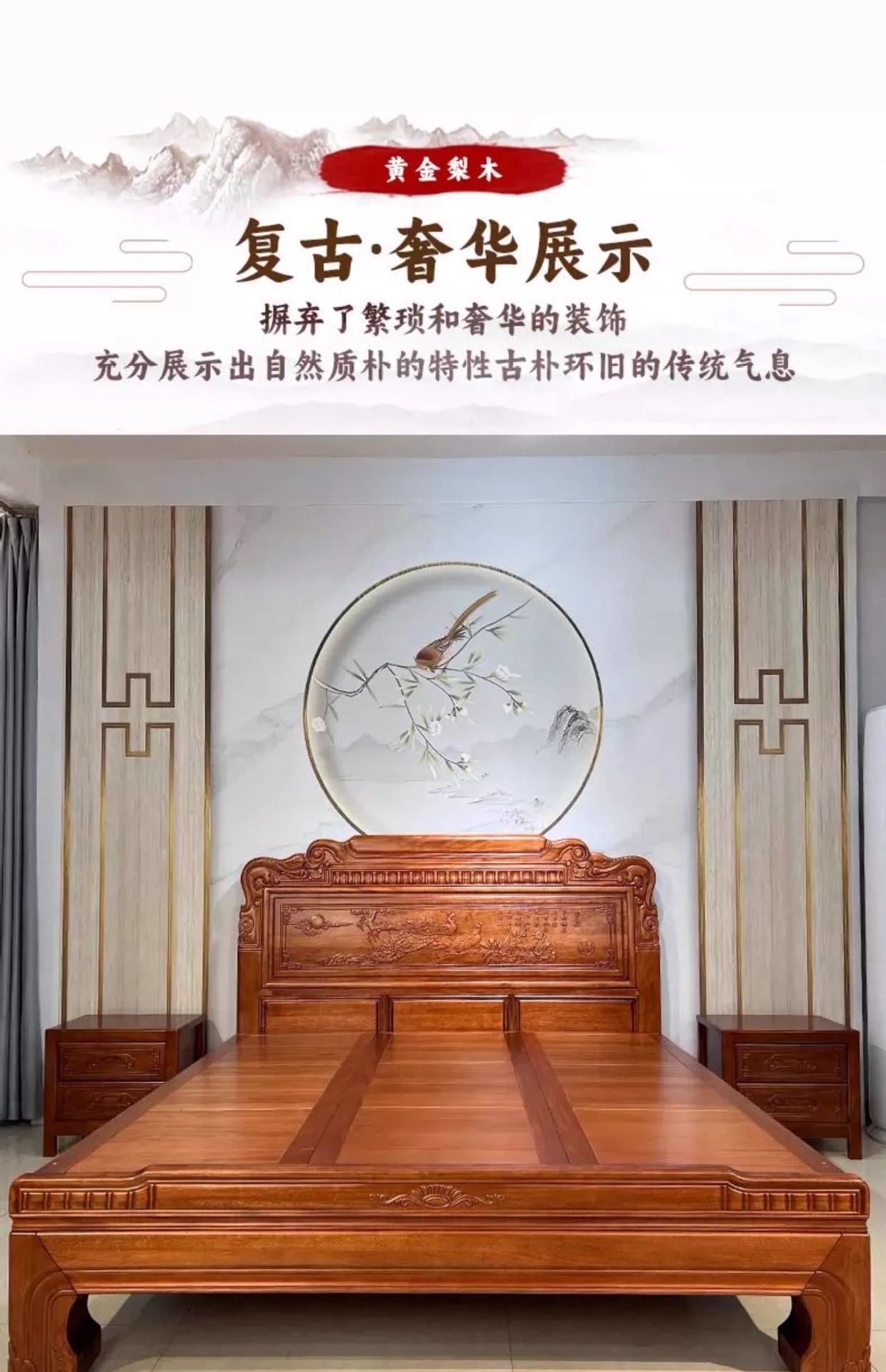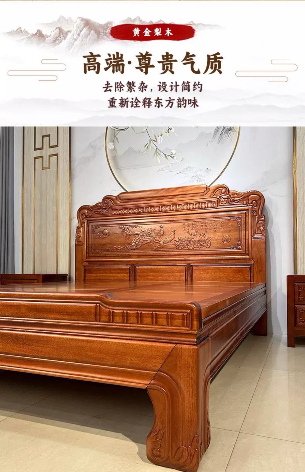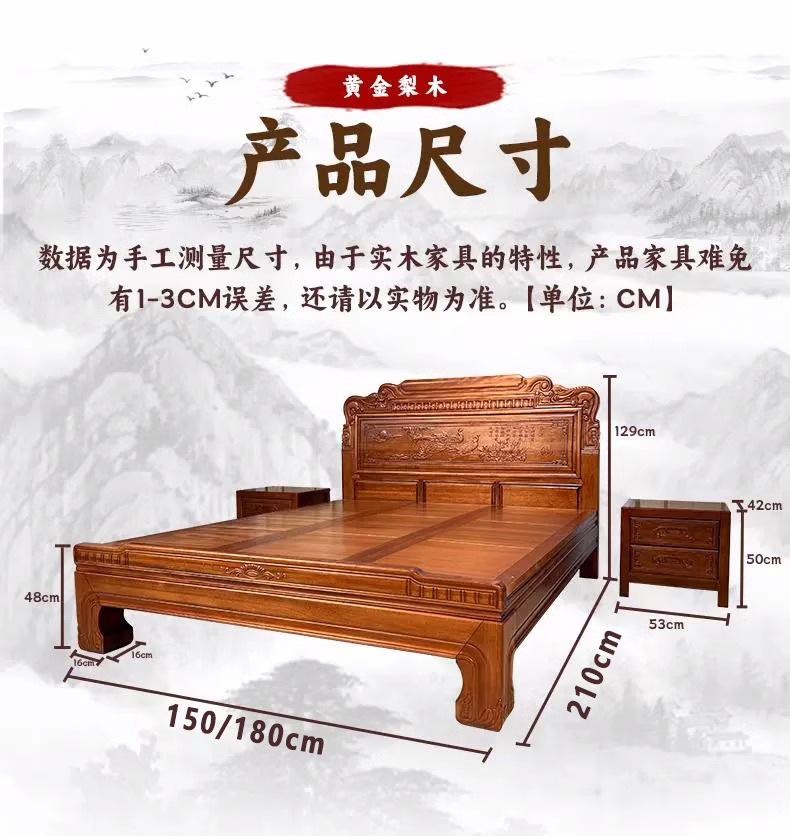 황금색 로즈우드 원목 퀸 사이즈 침대 1.8m 더블 침대 조각된 골동품 명나라 및 청나라 고전 중국식 모 끈 2M 그리드 목재 침대스토어 가기