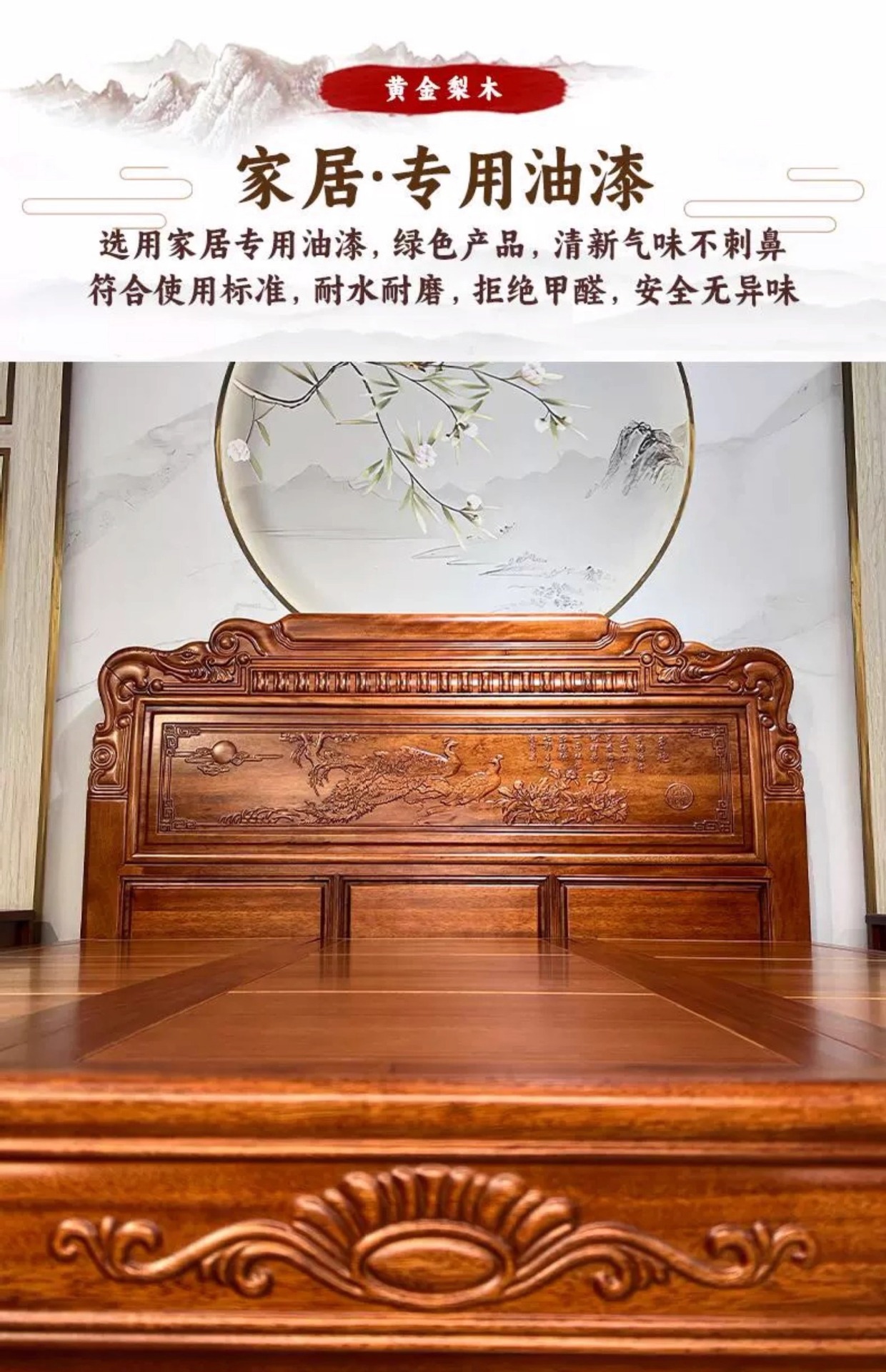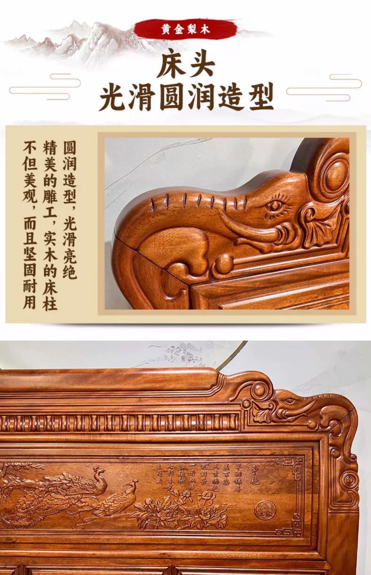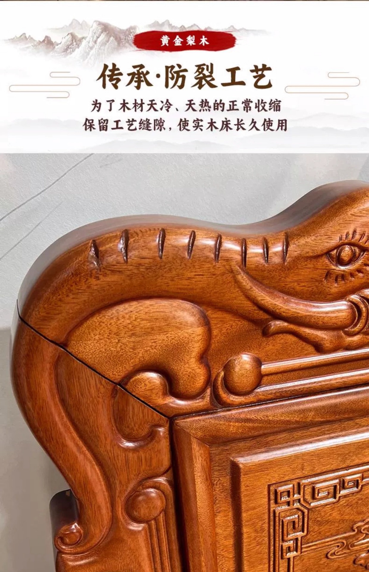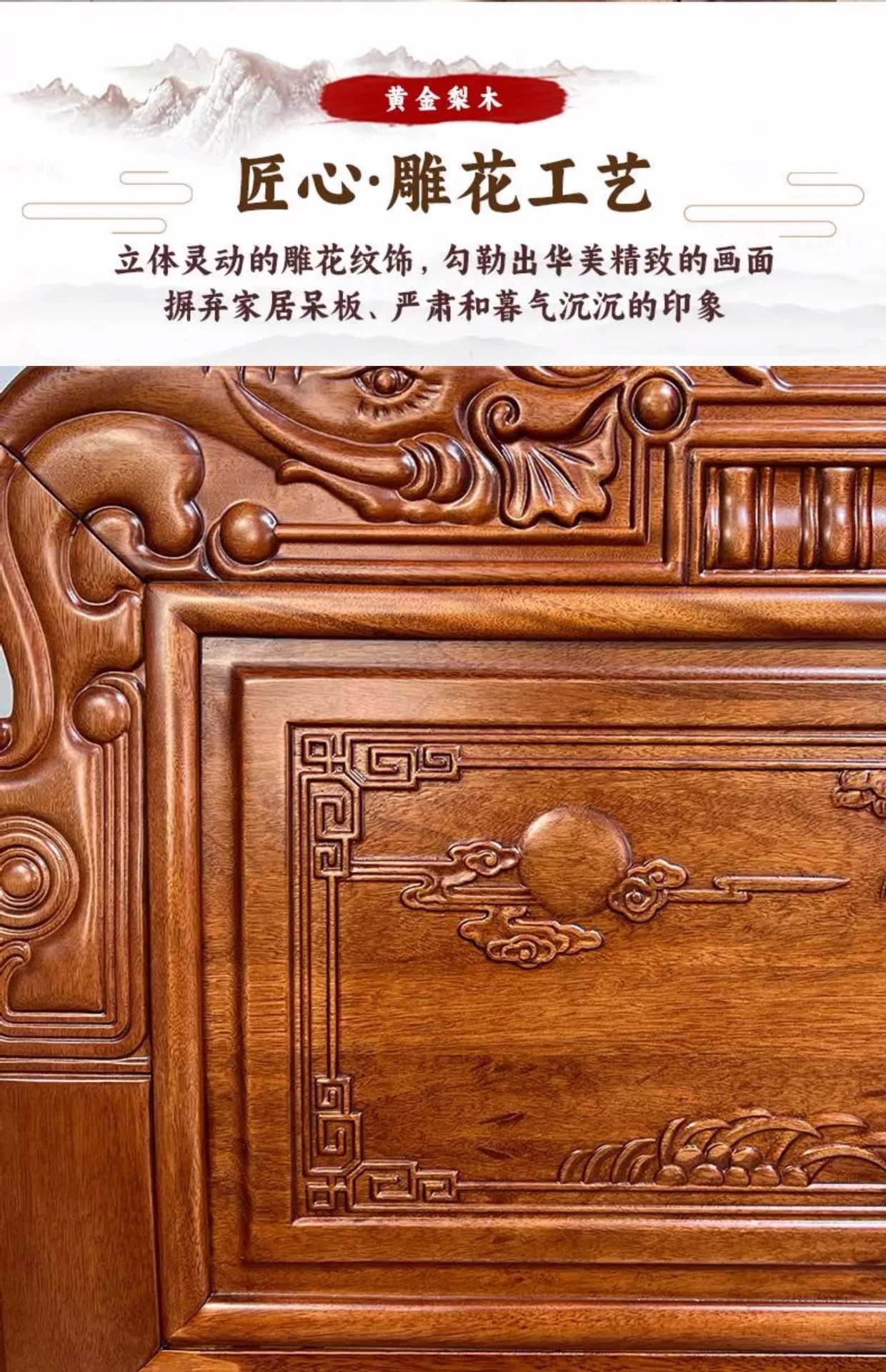 황금색 로즈우드 원목 퀸 사이즈 침대 1.8m 더블 침대 조각된 골동품 명나라 및 청나라 고전 중국식 모 끈 2M 그리드 목재 침대스토어 가기