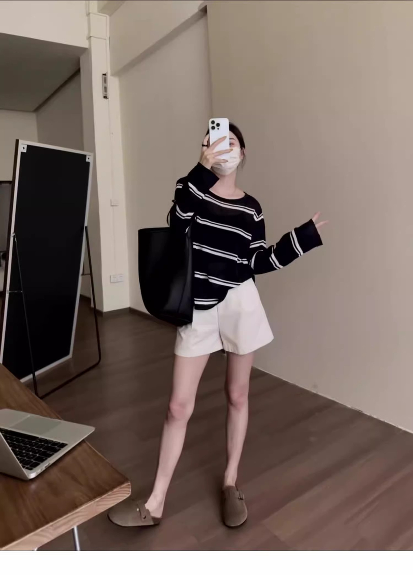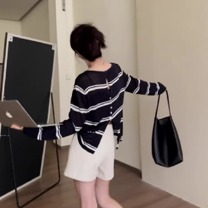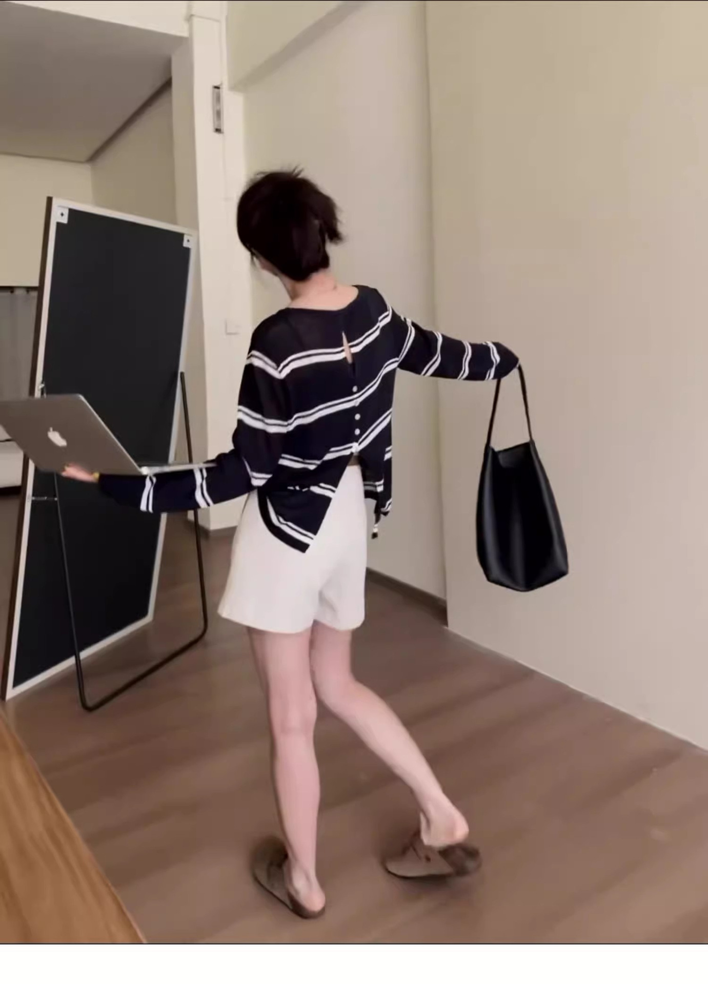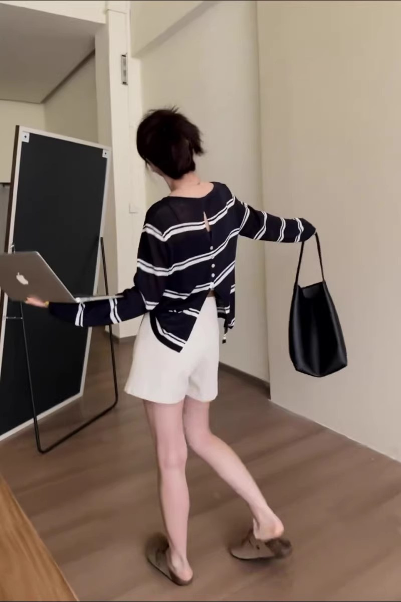 한국식 줄무늬 선스크린 긴팔 티셔츠 블라우스 여성용 여름 백 할로우 작은 셔츠 외부 어깨 탑 얇은 아이스 실크 탑스토어 가기