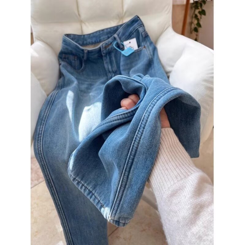 기모 청바지 여성의 가을과 겨울 두꺼운 따뜻한 높은 허리 스트레이트 튜브 느슨한 투약 레트로 블루 바지 좁은 넓은 다리 바지스토어 가기