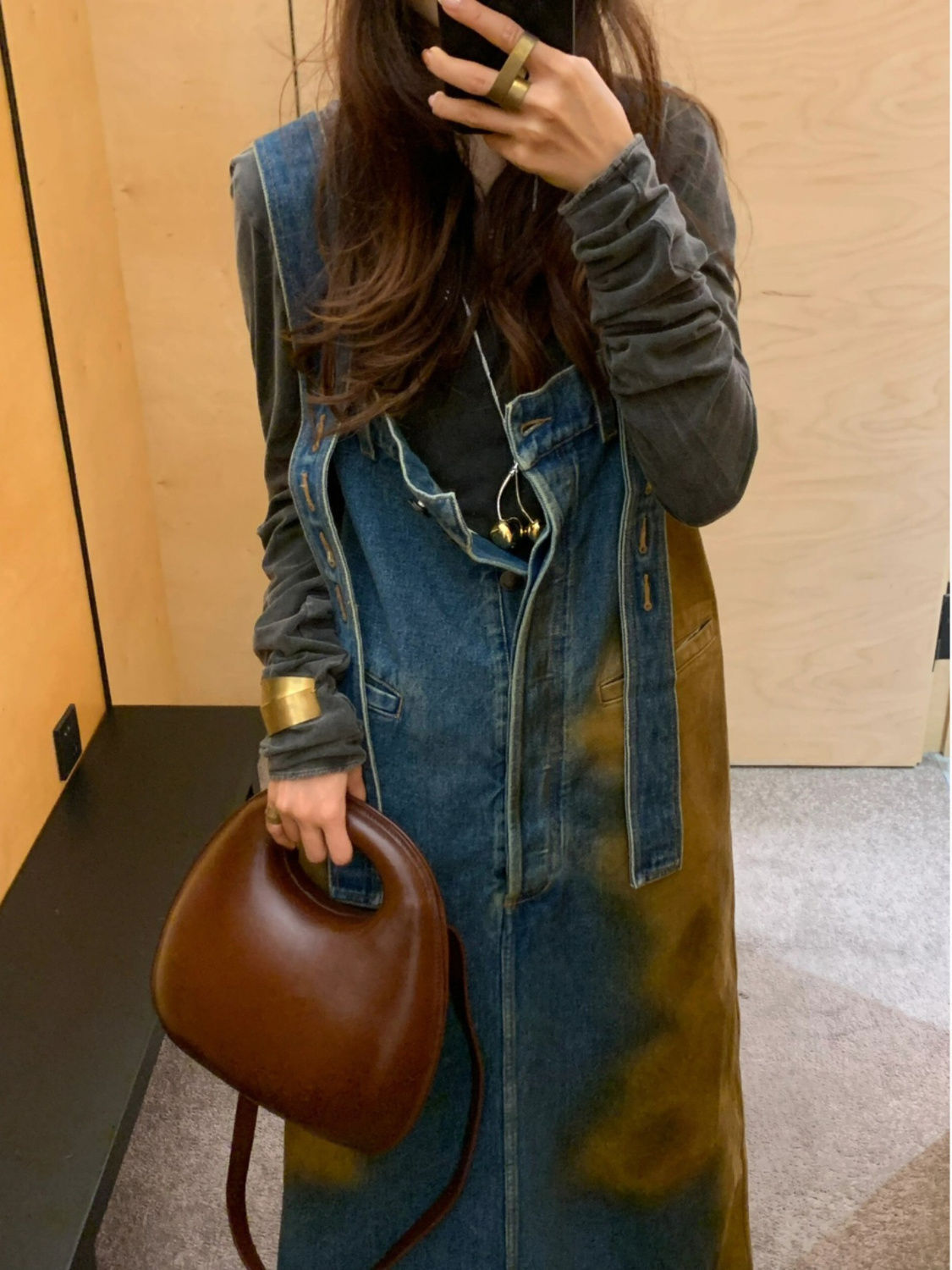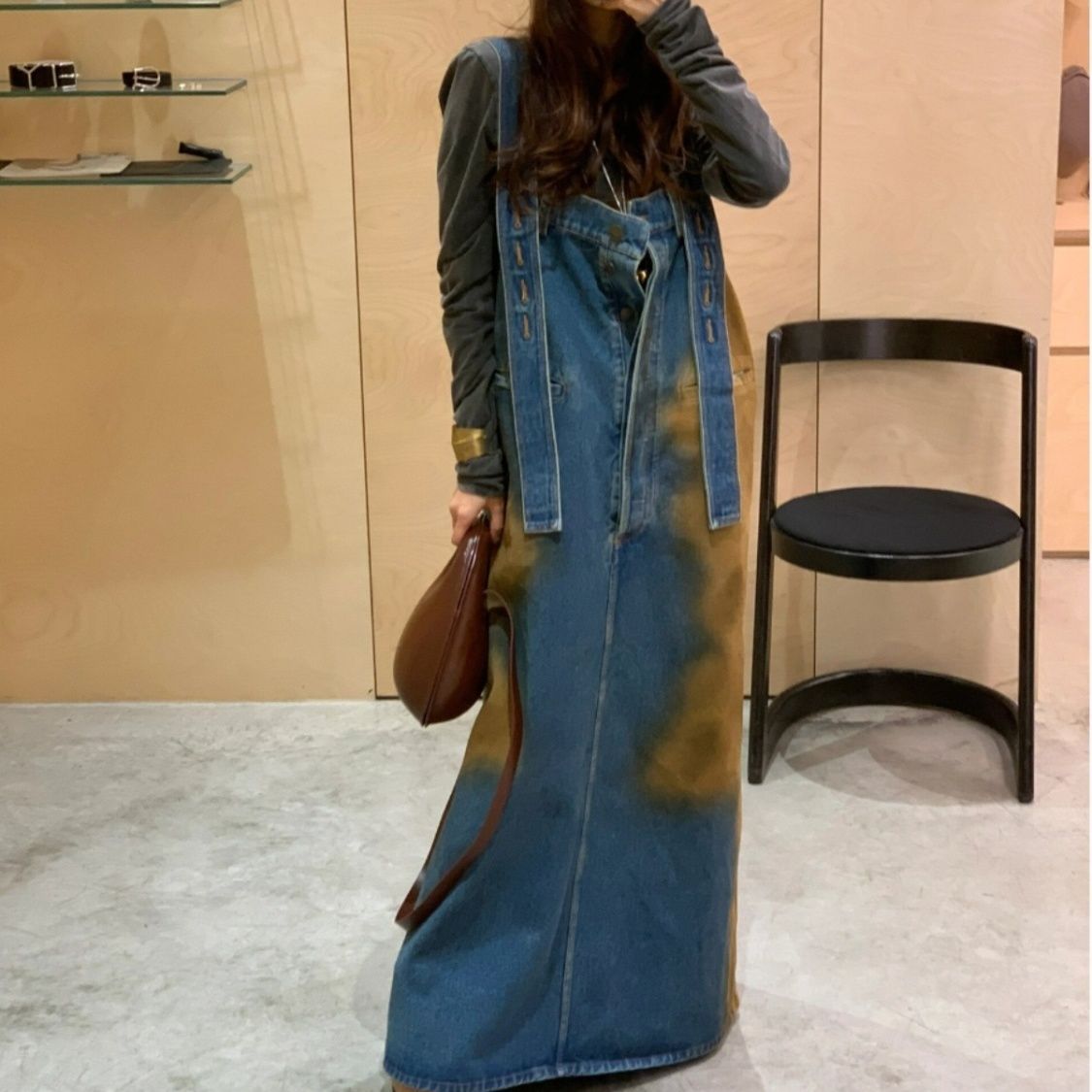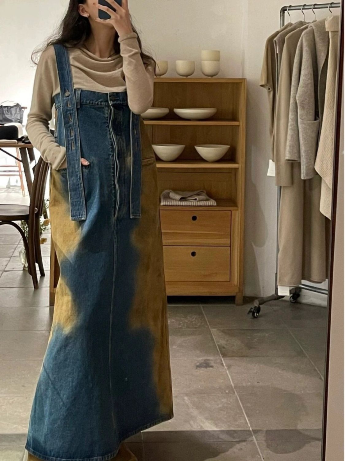 가을 2024 미국 복고풍 세척 오래된 고민 스플래시 잉크 스프레이 염색 조절 기질 데님 스트랩 원피스스토어 가기