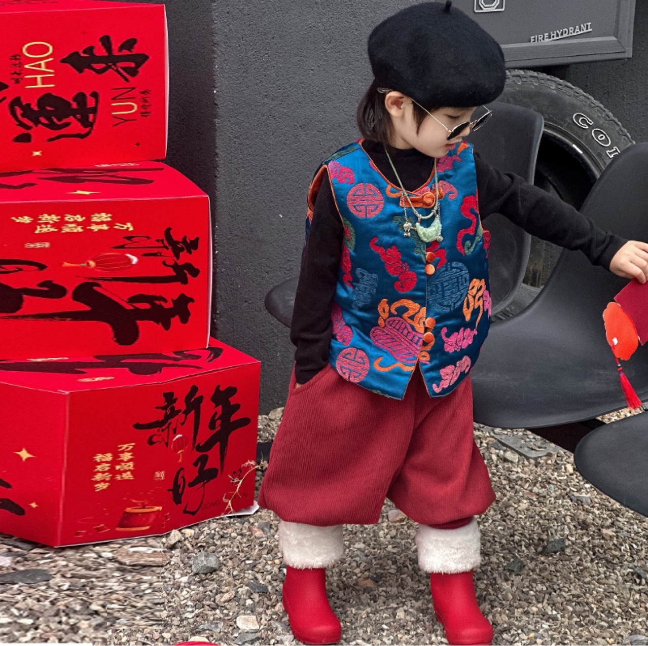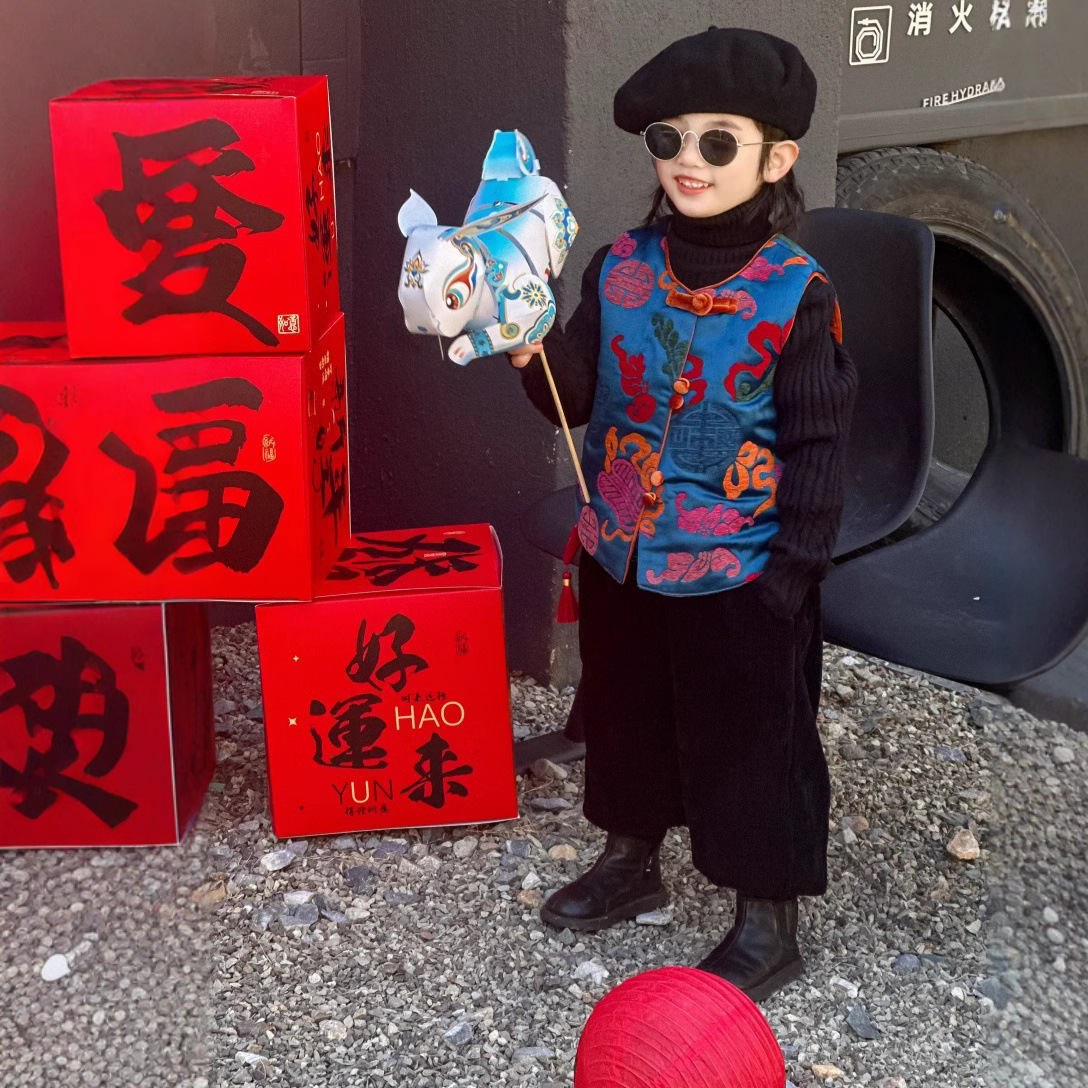 2024 새로운 소년 다채로운 풀루 조끼 신년 중국 스타일 새로운 중국 어린이 블루 조끼 재고 도매스토어 가기