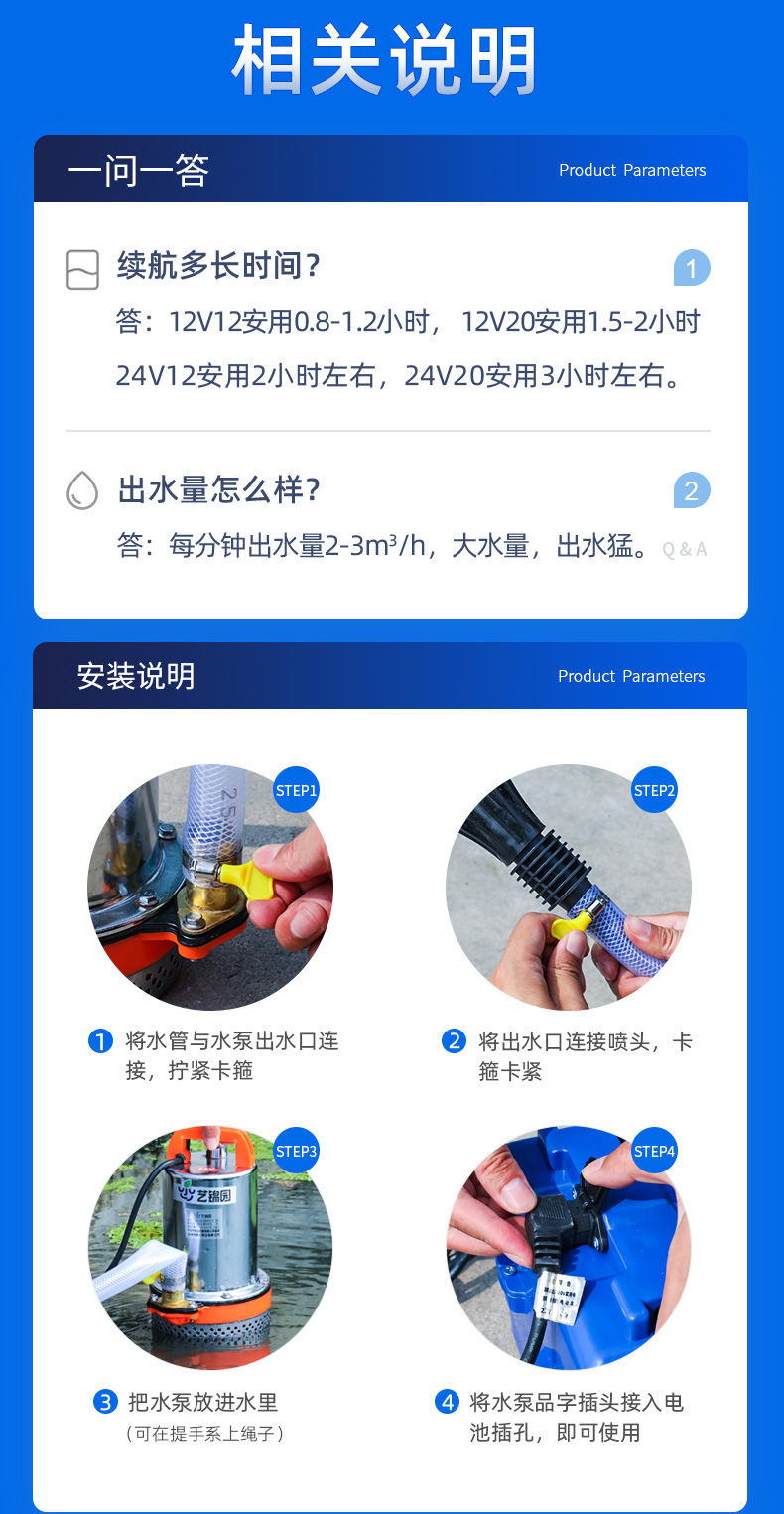 • 12AH Tianneng 배터리 + 30m 옥스포드 튜브가 장착된 12V120W 수중 펌프
