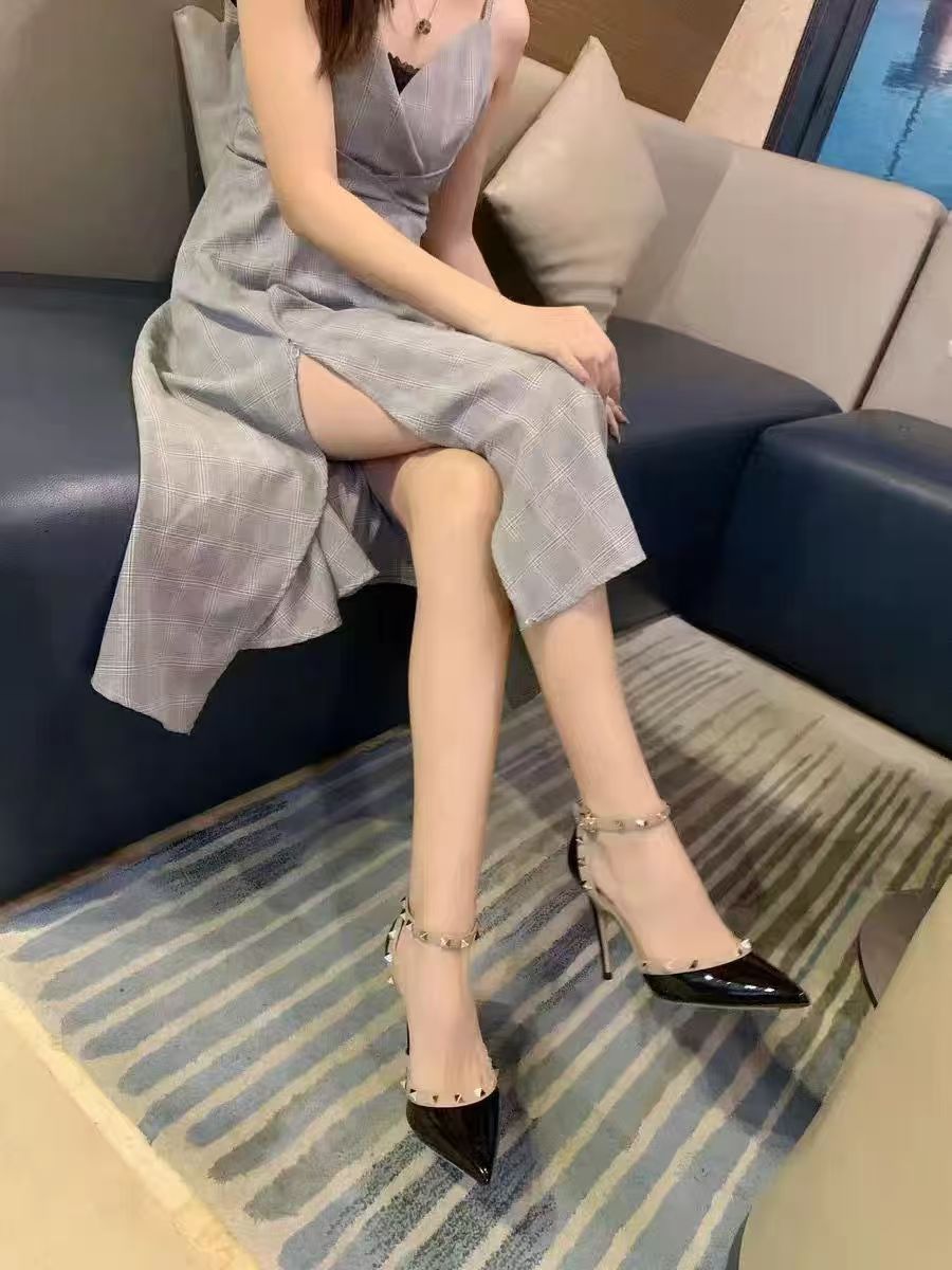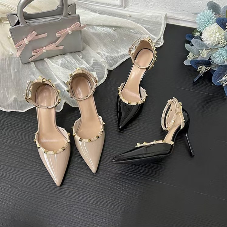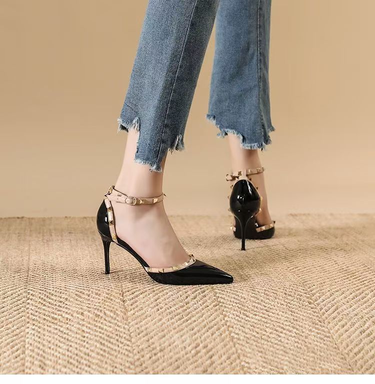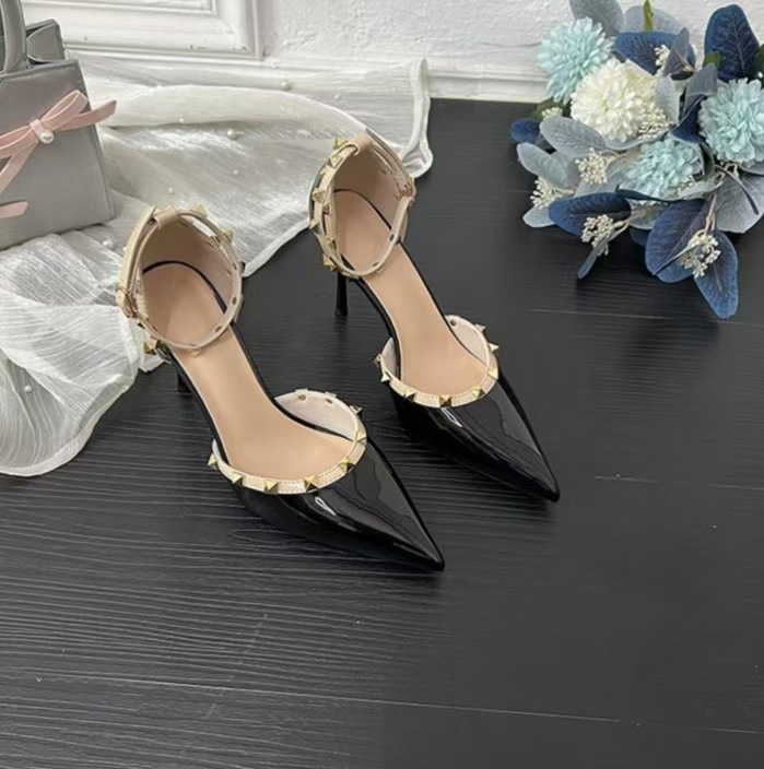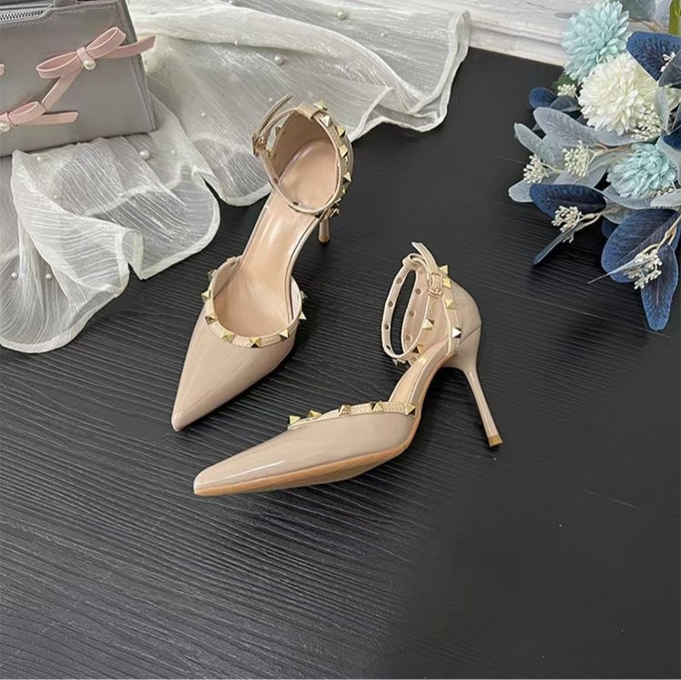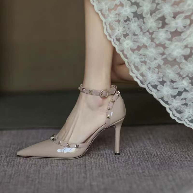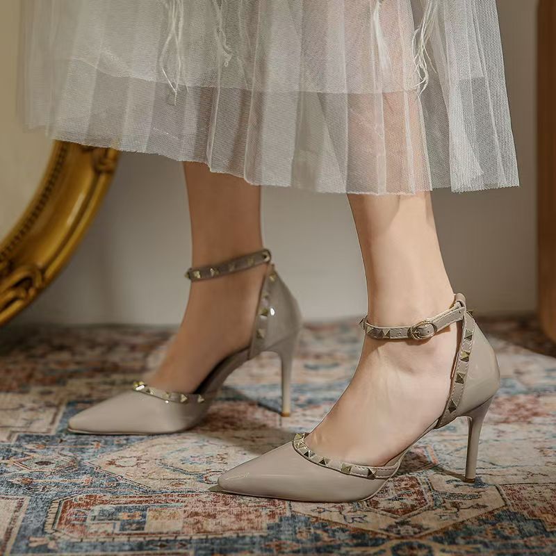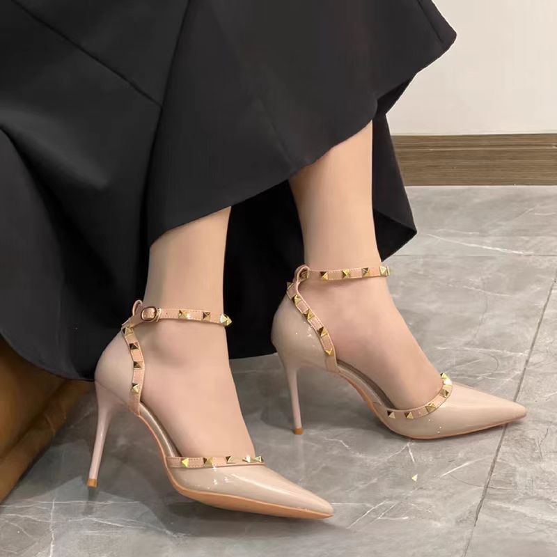 여성의 봄과 여름 Liu Ding 2024 새로운 섹시한 샌들 리벳 싱글 레이어 신발 여성용 프렌치 누드 뾰족한 하이힐 신발스토어 가기