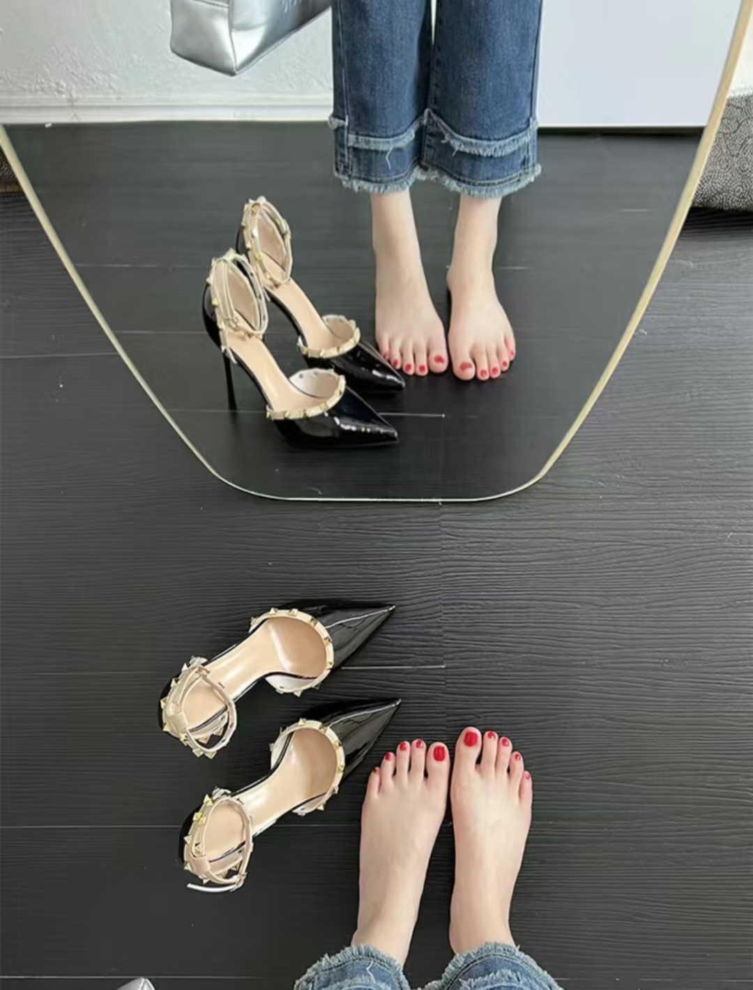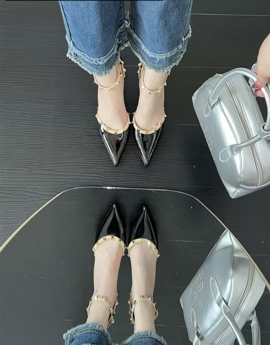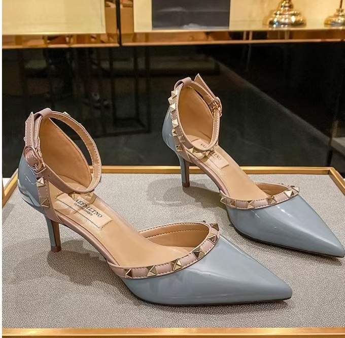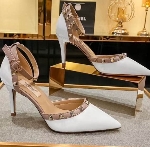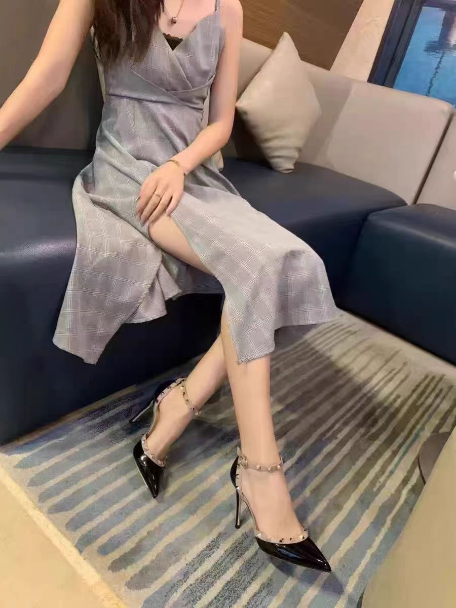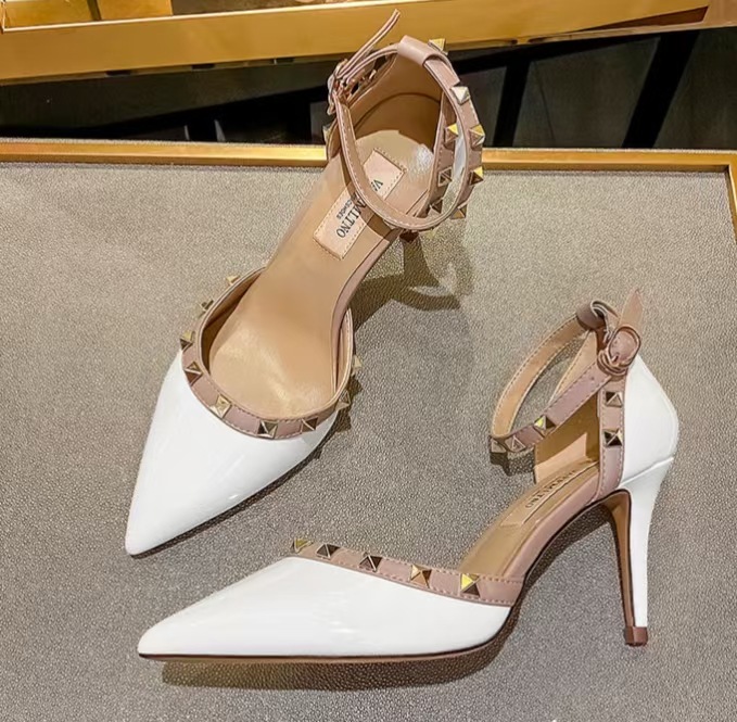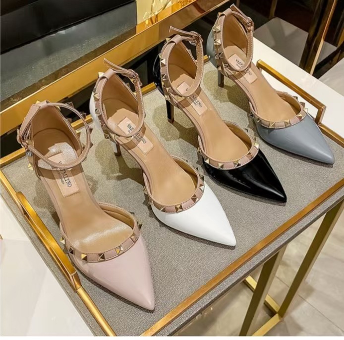 여성의 봄과 여름 Liu Ding 2024 새로운 섹시한 샌들 리벳 싱글 레이어 신발 여성용 프렌치 누드 뾰족한 하이힐 신발스토어 가기