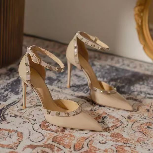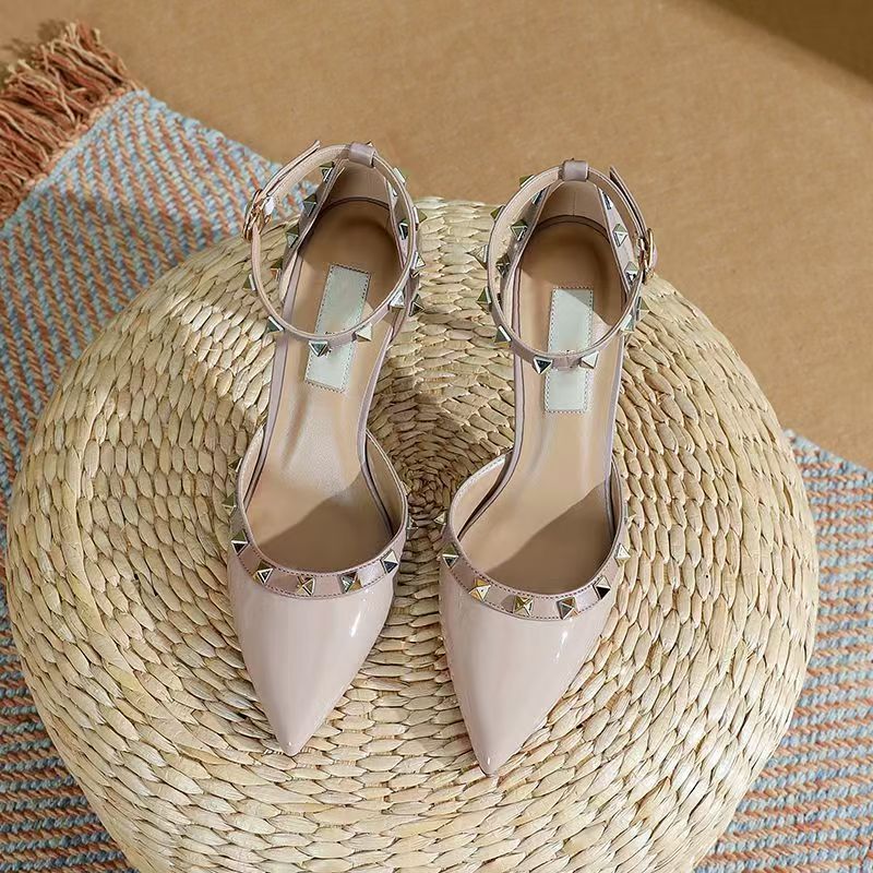 여성의 봄과 여름 Liu Ding 2024 새로운 섹시한 샌들 리벳 싱글 레이어 신발 여성용 프렌치 누드 뾰족한 하이힐 신발
