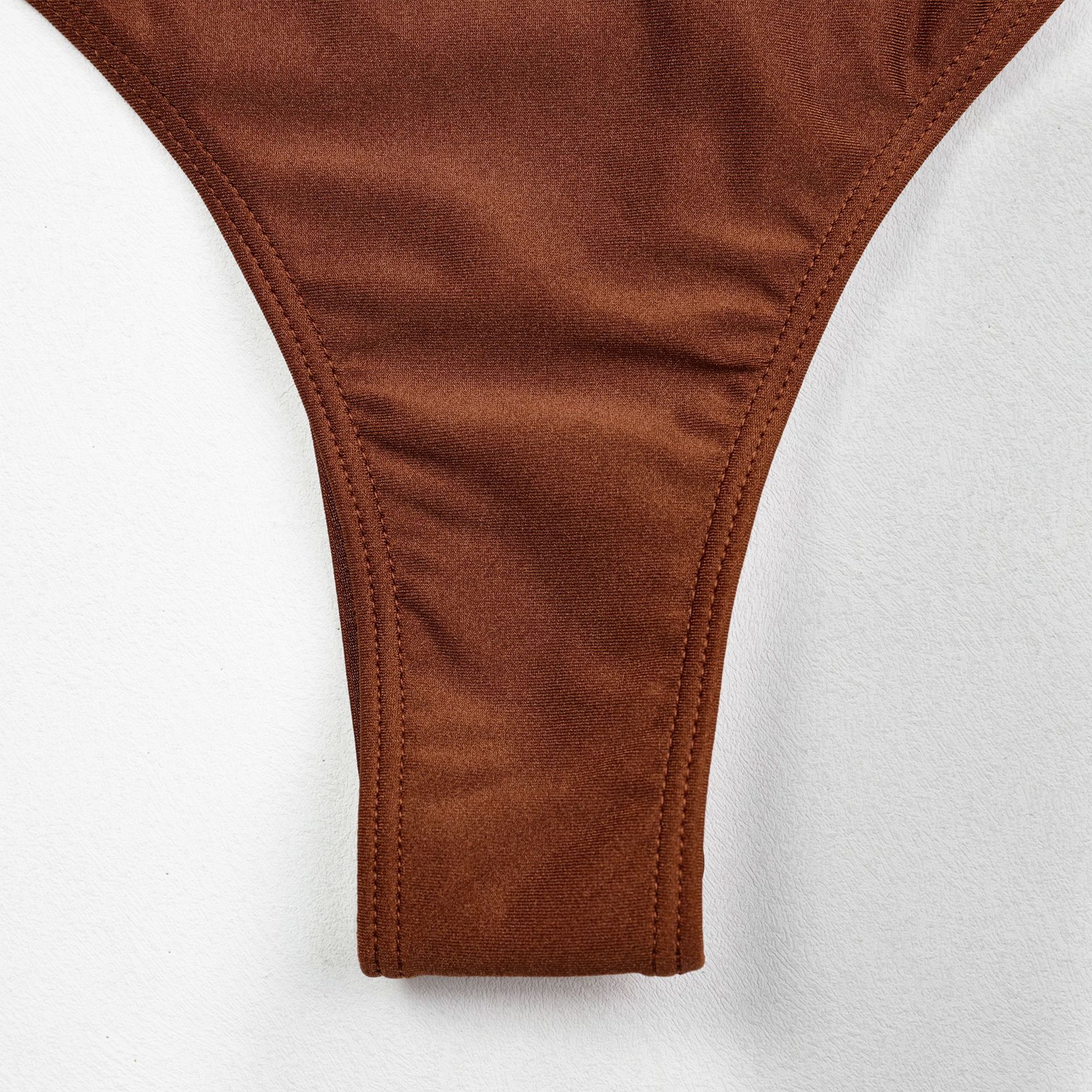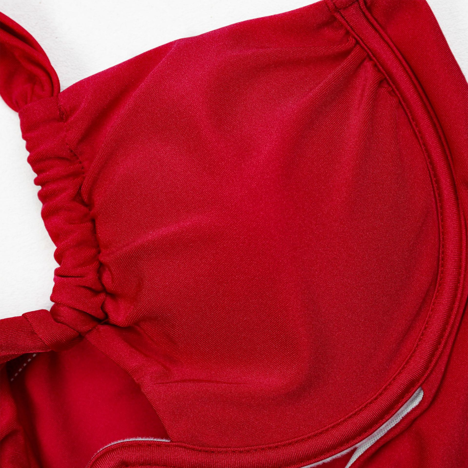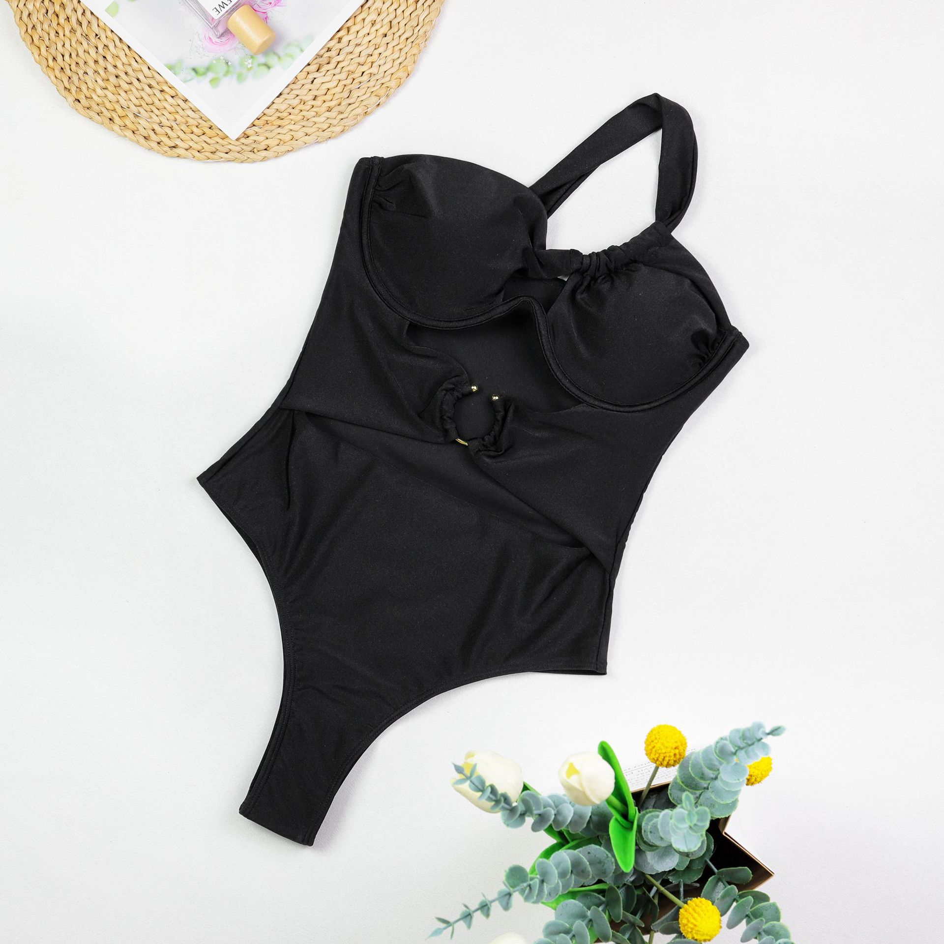欧美大码单肩拧结泳衣连体比基尼钢托聚拢镂空金属扣纯色游泳衣女