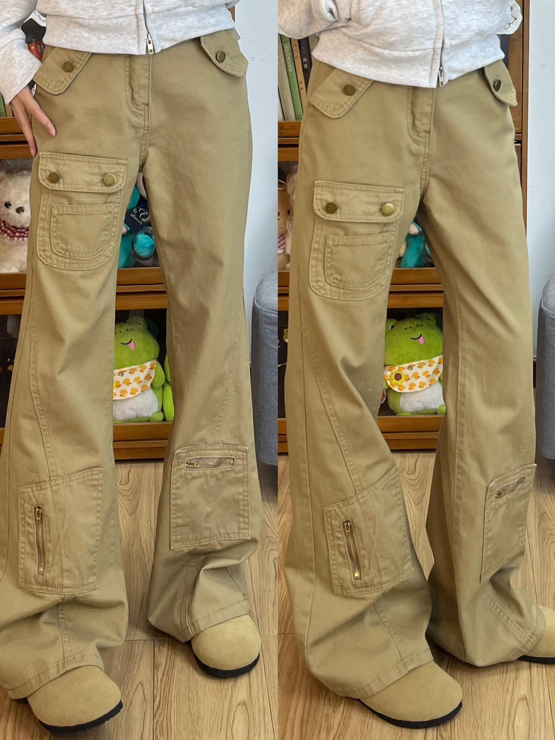 아메리칸 스타일 카키 디자인 센스 툴링 청바지 여성용 겨울 레트로 하이 웨이스트 스트레이트 슬리밍 트럼펫 바지