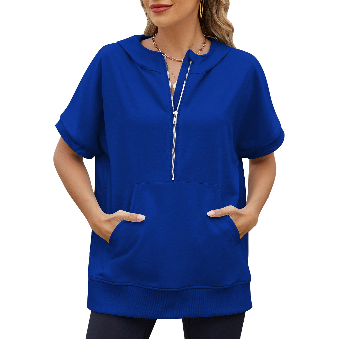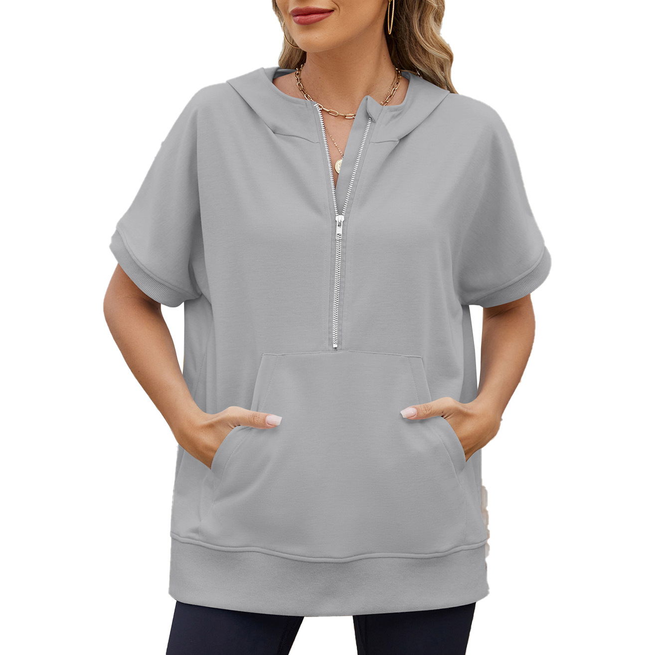 아마존 유럽과 미국 국경 대외 무역 2025 봄과 여름 후드 느슨한 반팔 지퍼 포켓 여성용 얇은 스웨터 티셔츠스토어 가기