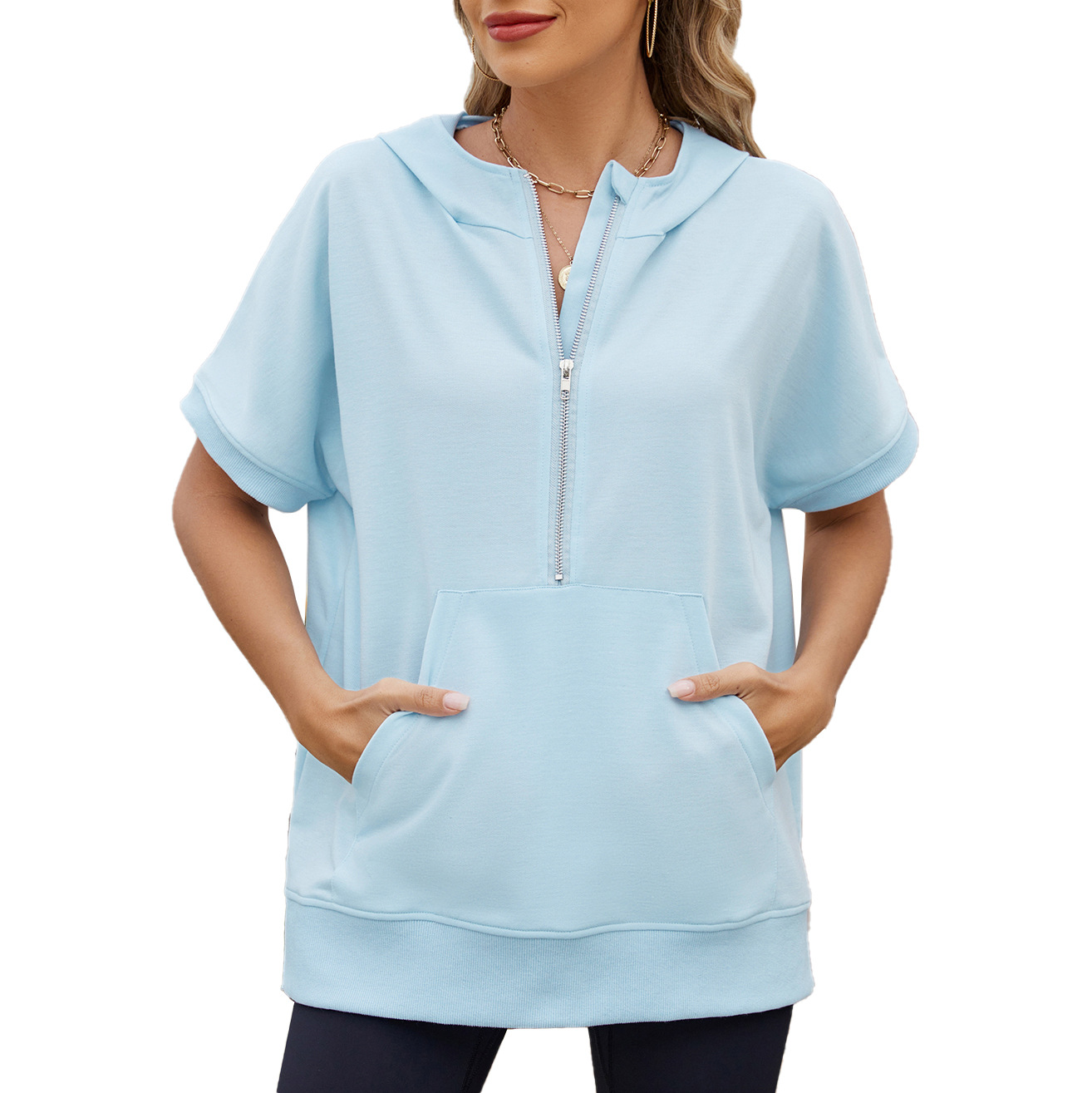아마존 유럽과 미국 국경 대외 무역 2025 봄과 여름 후드 느슨한 반팔 지퍼 포켓 여성용 얇은 스웨터 티셔츠