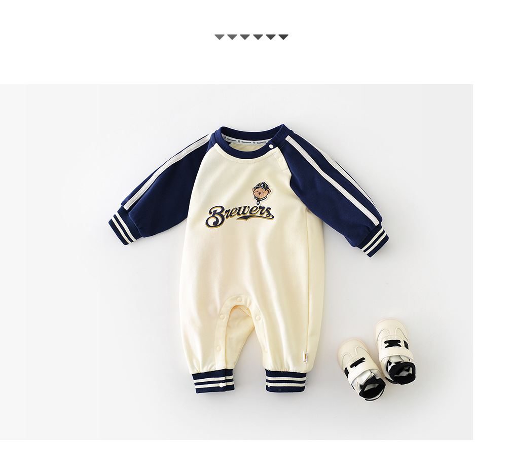 2025 봄 새로운 스타일 스플 라이스 대비 색 점프 슈트 신생아 베어 대학 스타일 외출 크롤링 슈트 51066스토어 가기