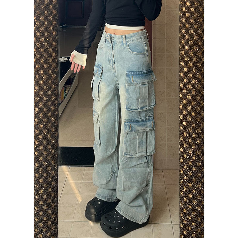 미국 스타일 하이 스트리트 레트로 오래 된 와이드 레그 청바지 2024 새로운 느슨한 높은 허리 세척 포켓 스트레이트 작업복스토어 가기