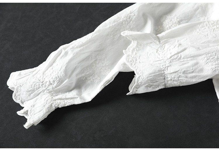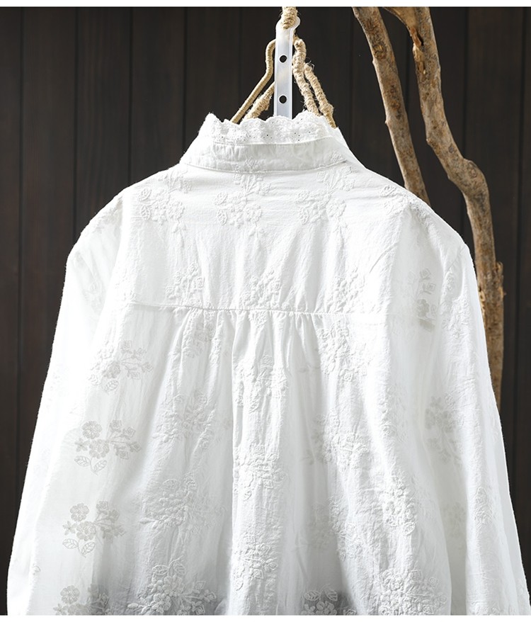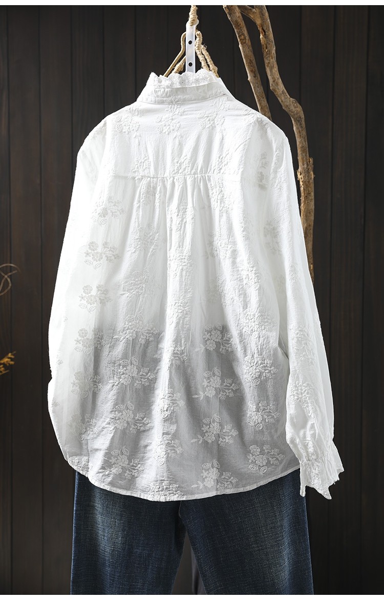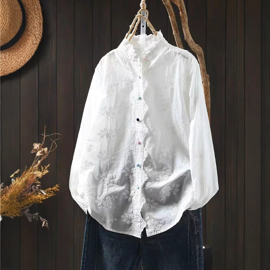 봄 새로운 느슨한 슬리밍 다채로운 버튼 레이스 귀 칼라 자수 코튼 자카드 긴 소매 셔츠 여성용 93016
