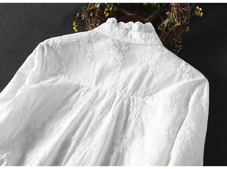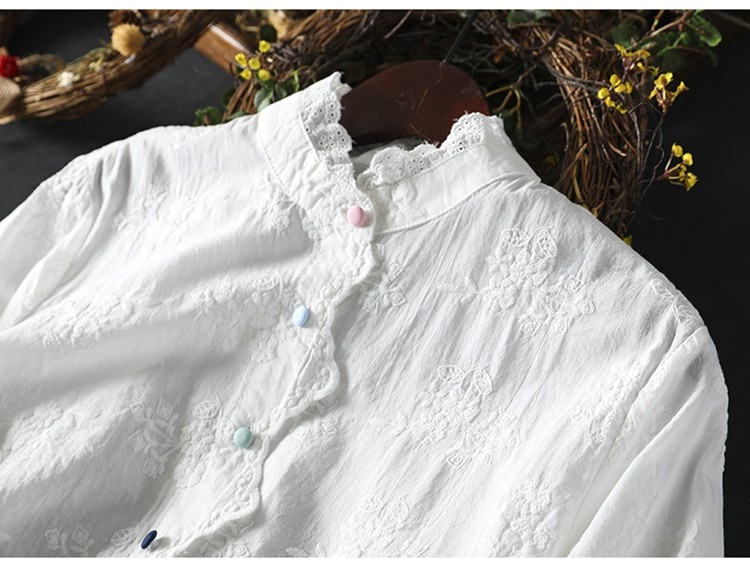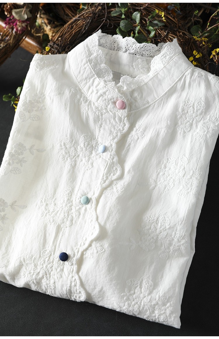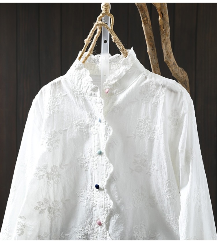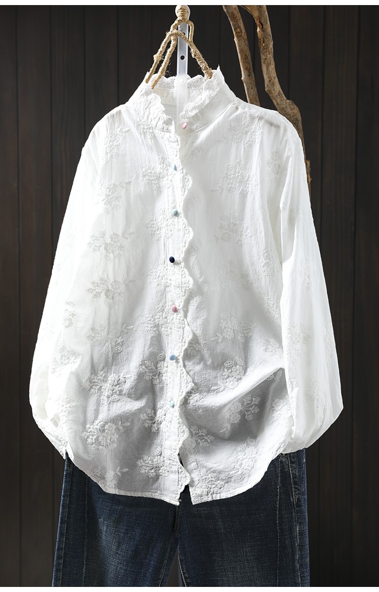 봄 새로운 느슨한 슬리밍 다채로운 버튼 레이스 귀 칼라 자수 코튼 자카드 긴 소매 셔츠 여성용 93016스토어 가기