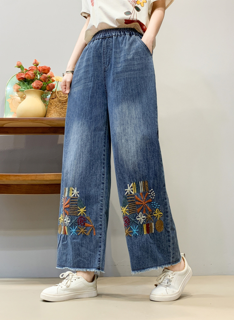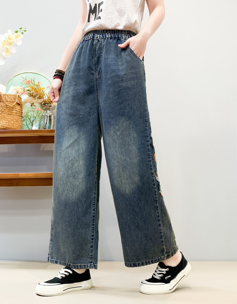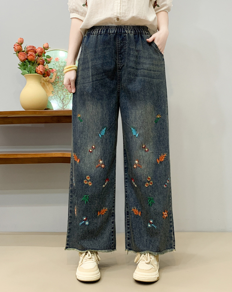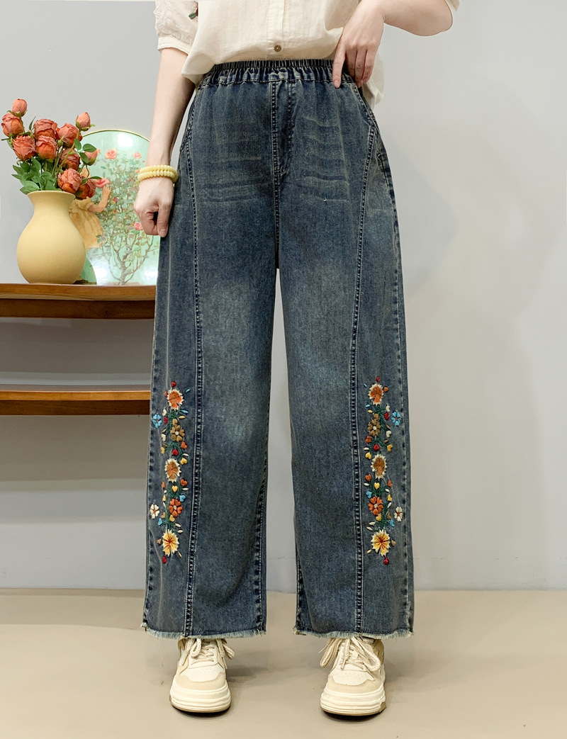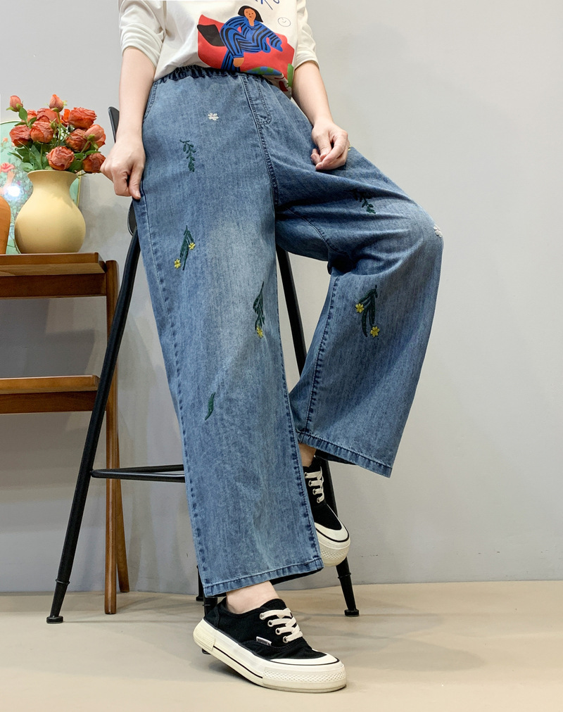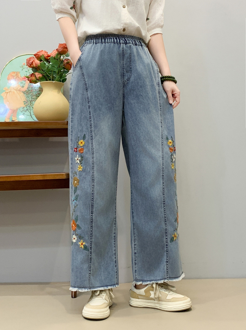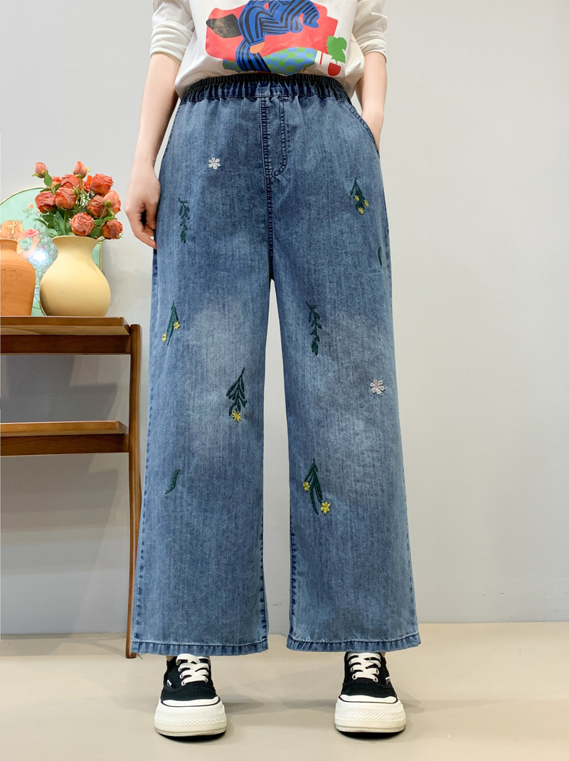 2025 봄 새로운 느슨한 큰 자수 꽃 탄성 허리 흰색 씻은 데님 바지 도매 조수스토어 가기