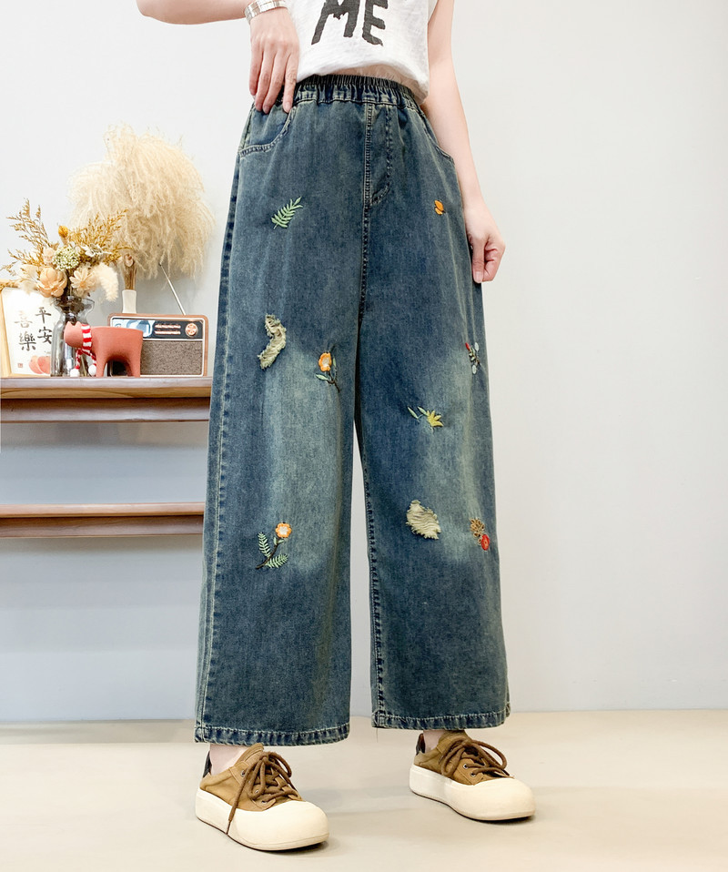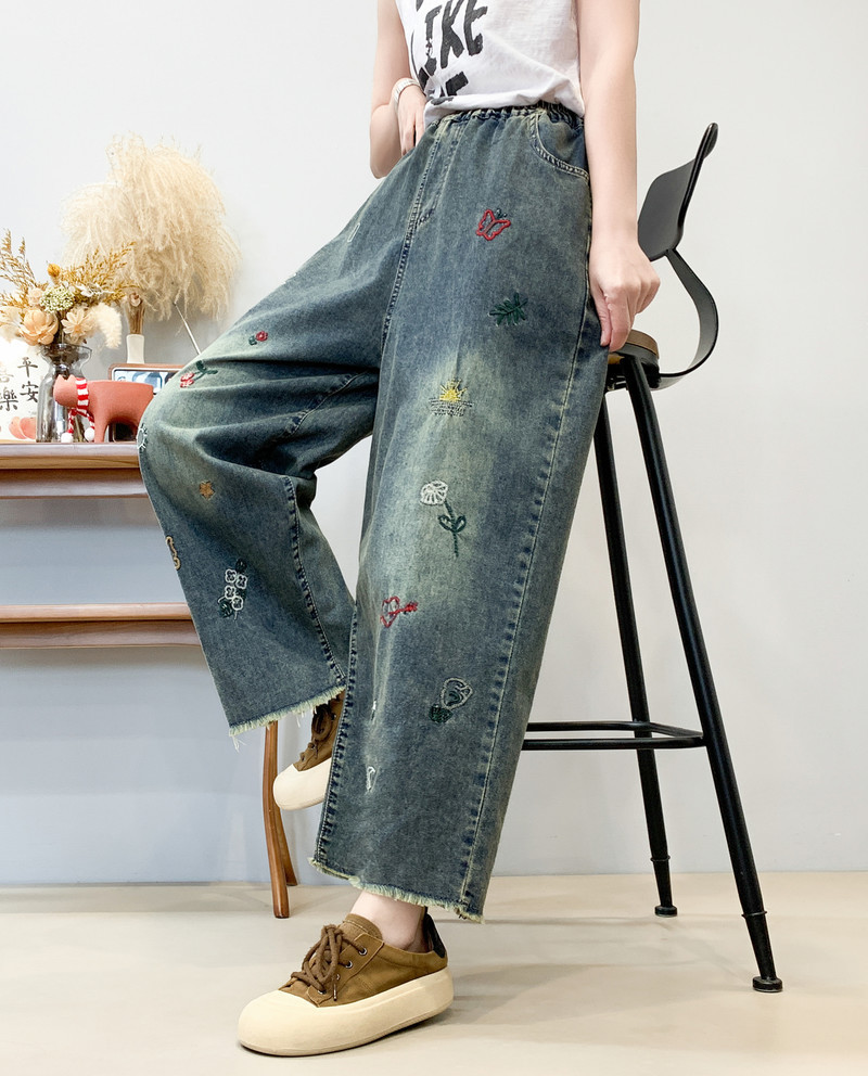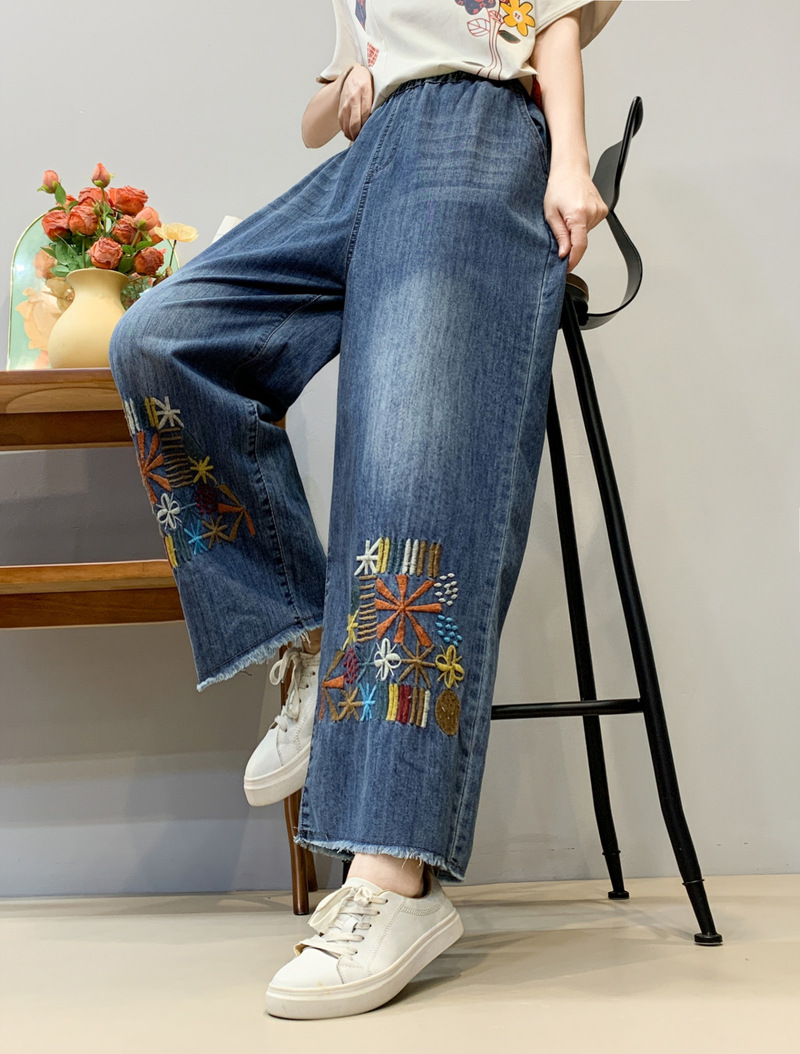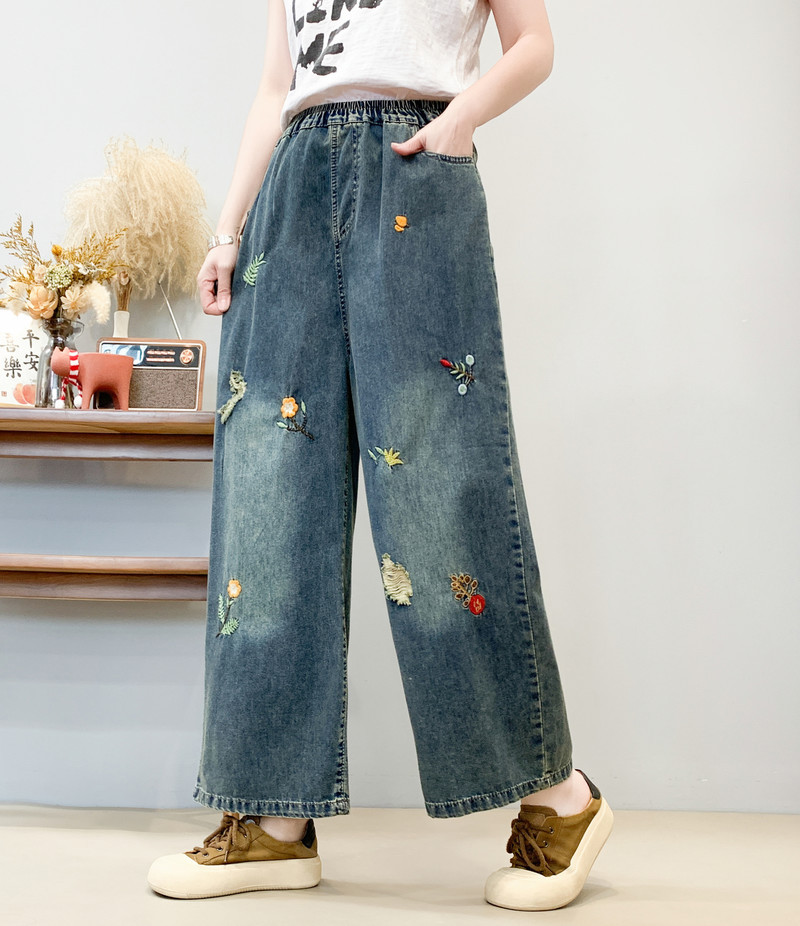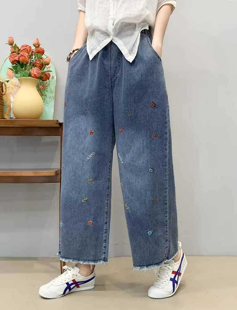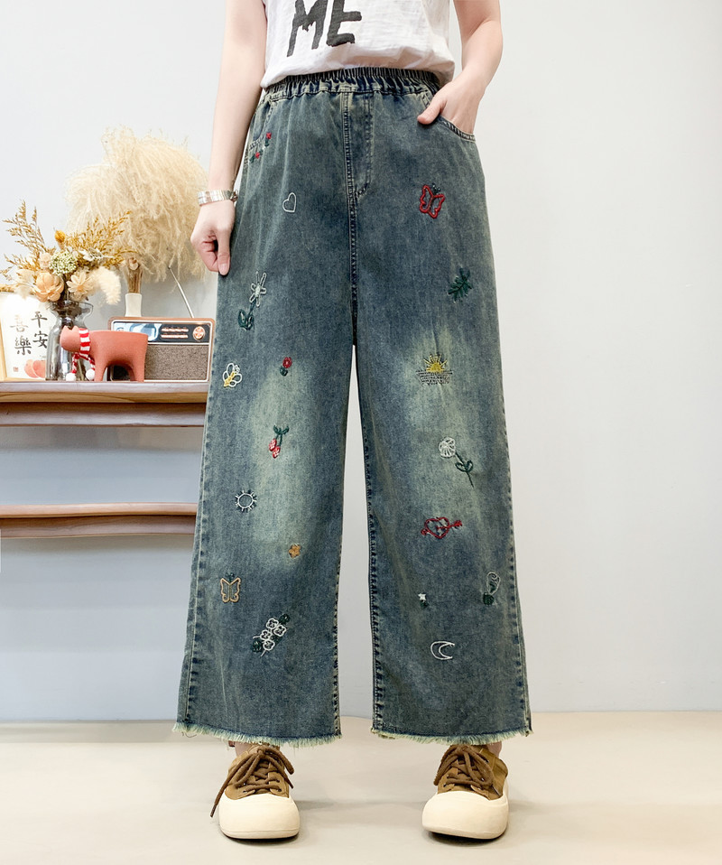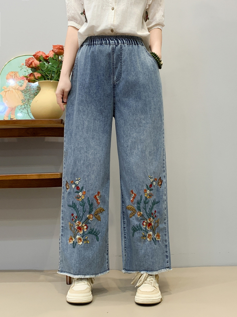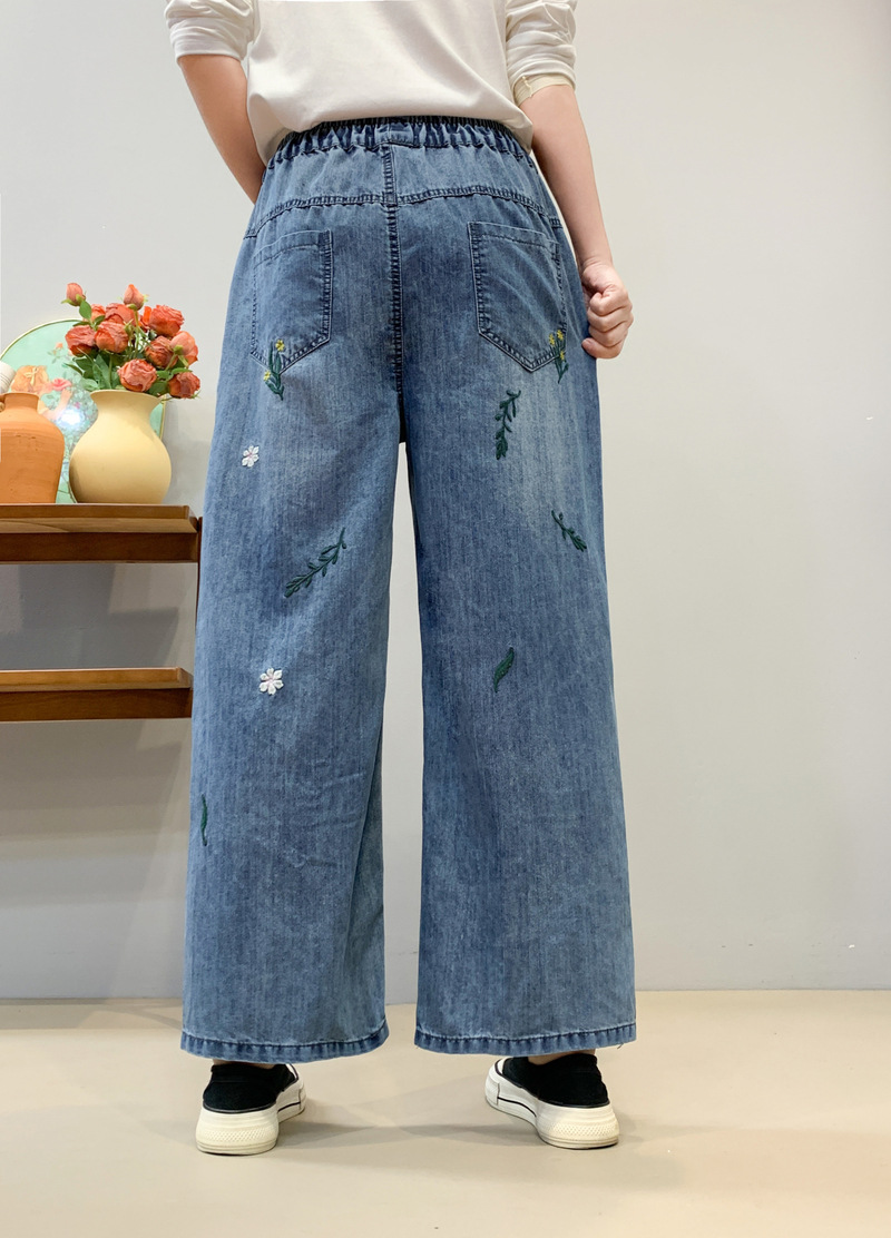 2025 봄 새로운 느슨한 큰 자수 꽃 탄성 허리 흰색 씻은 데님 바지 도매 조수스토어 가기