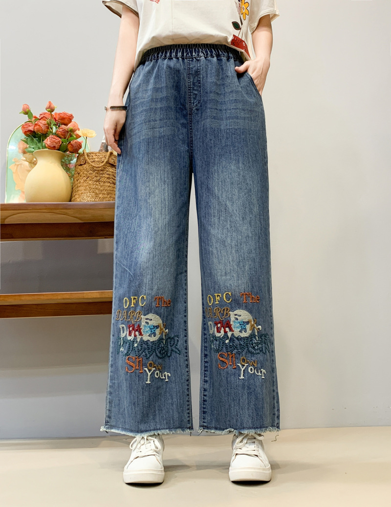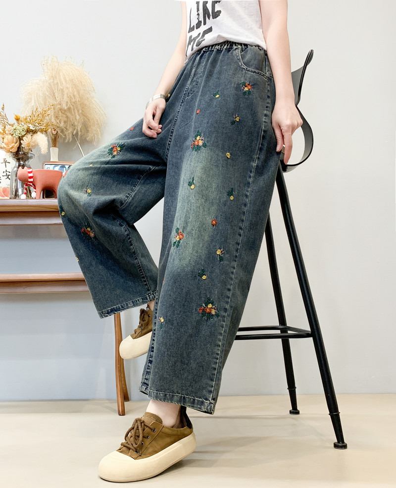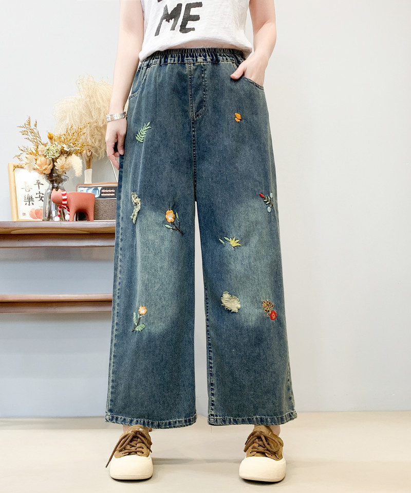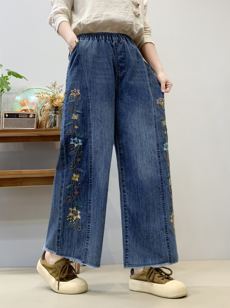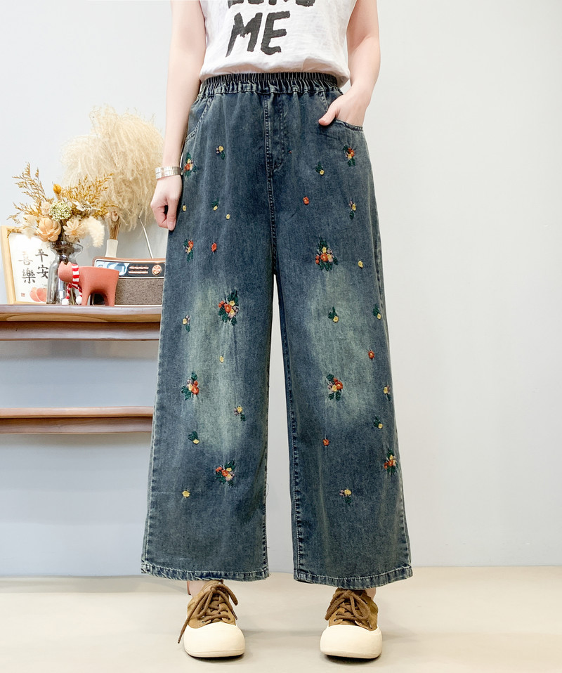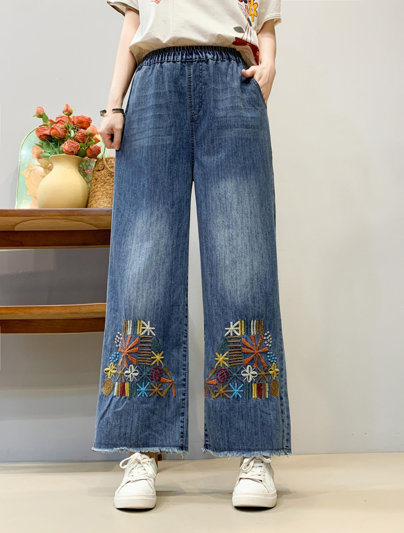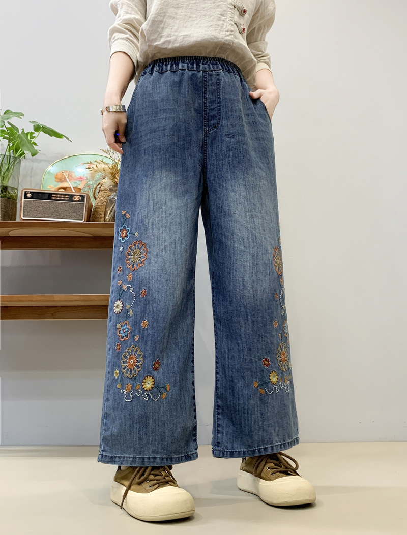2025 봄 새로운 느슨한 큰 자수 꽃 탄성 허리 흰색 씻은 데님 바지 도매 조수스토어 가기