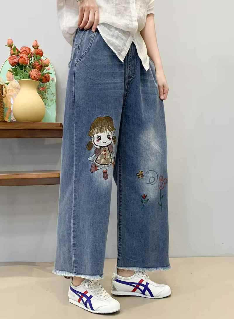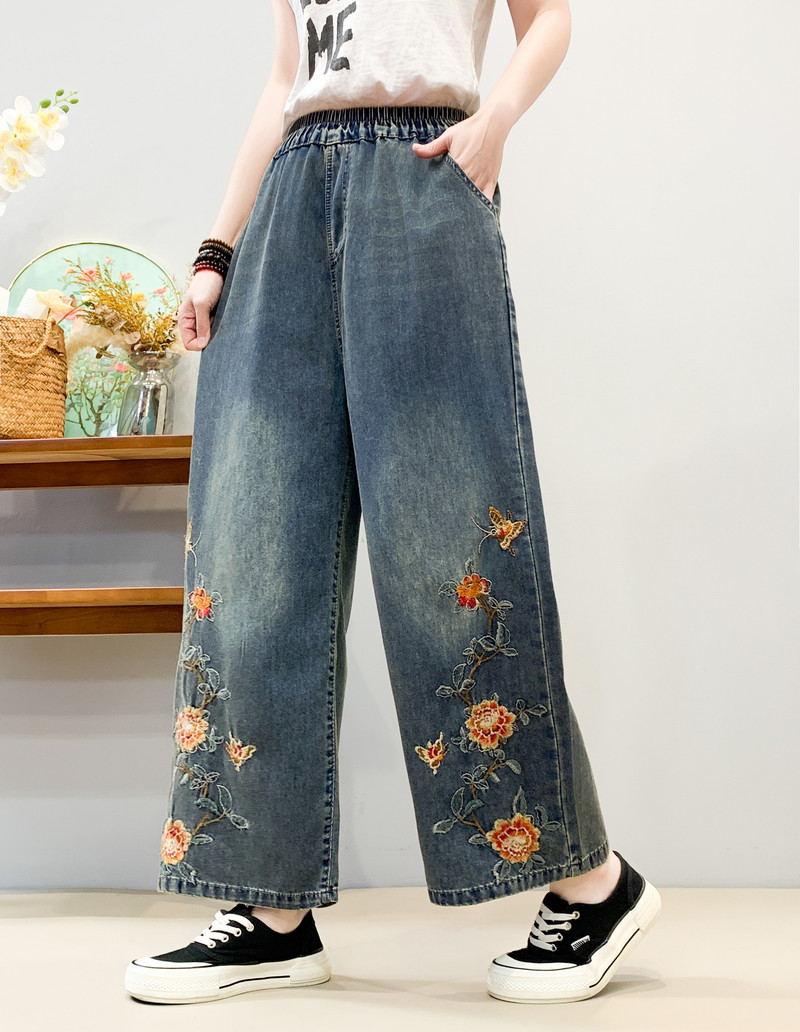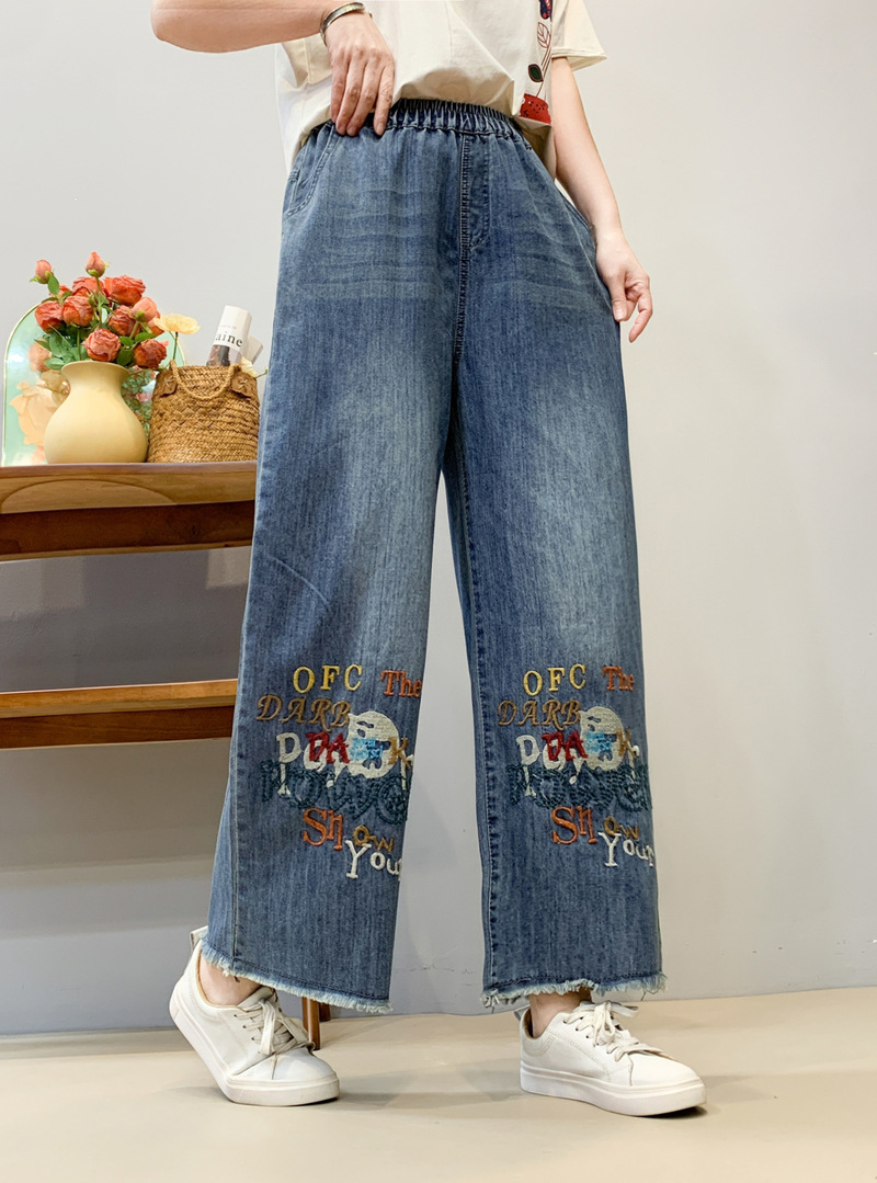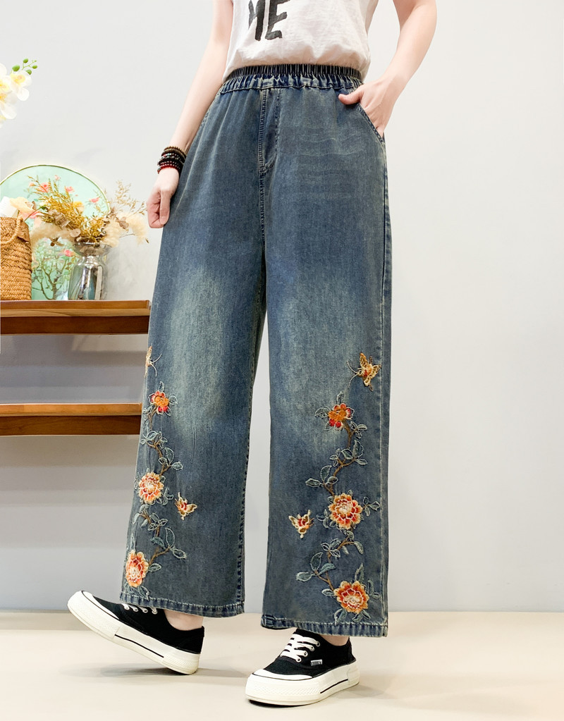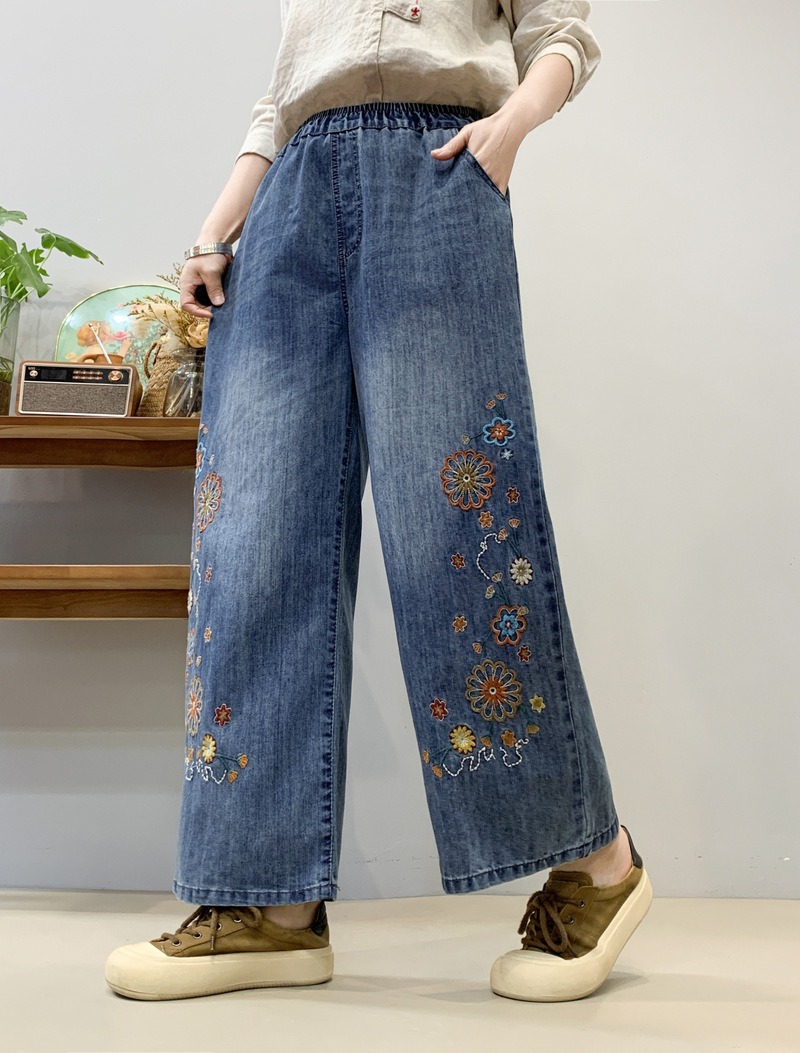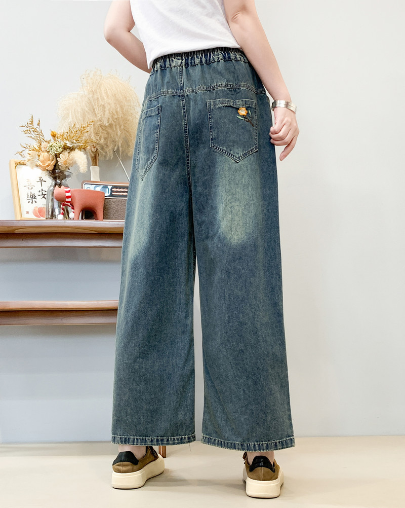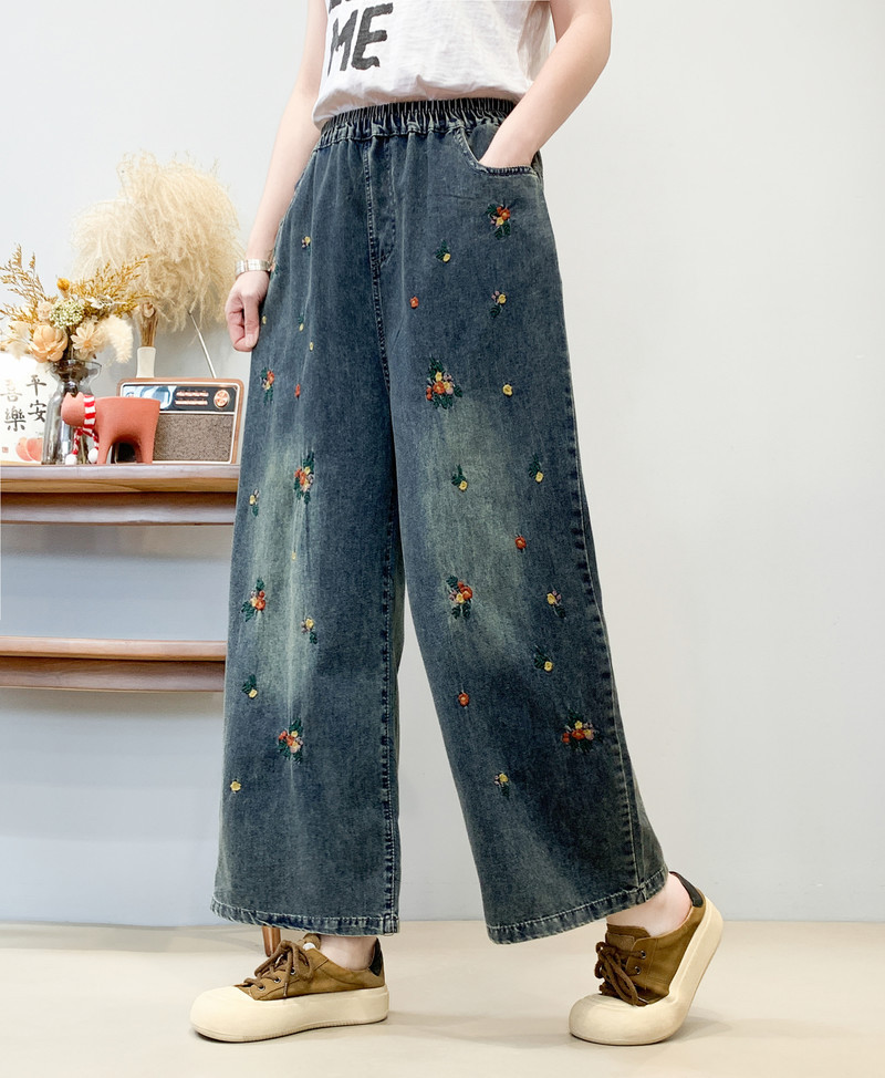 2025 봄 새로운 느슨한 큰 자수 꽃 탄성 허리 흰색 씻은 데님 바지 도매 조수스토어 가기