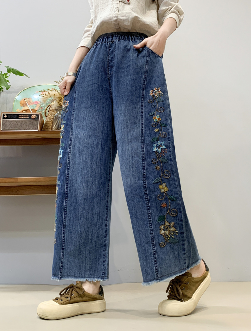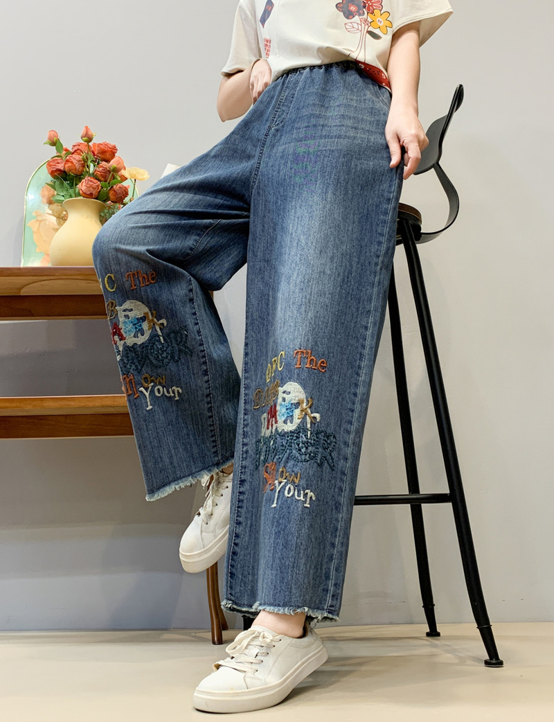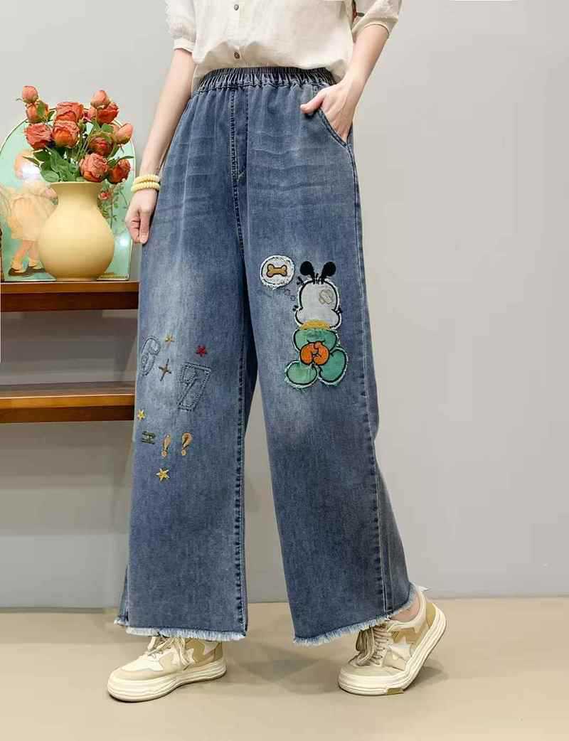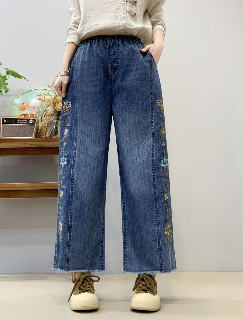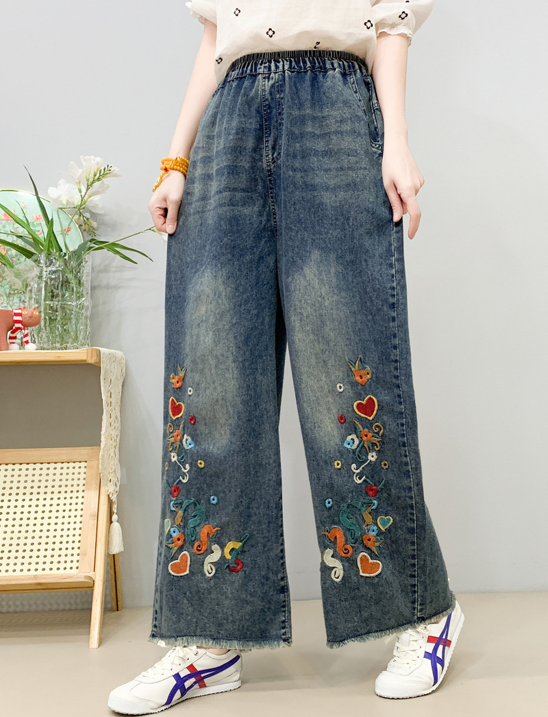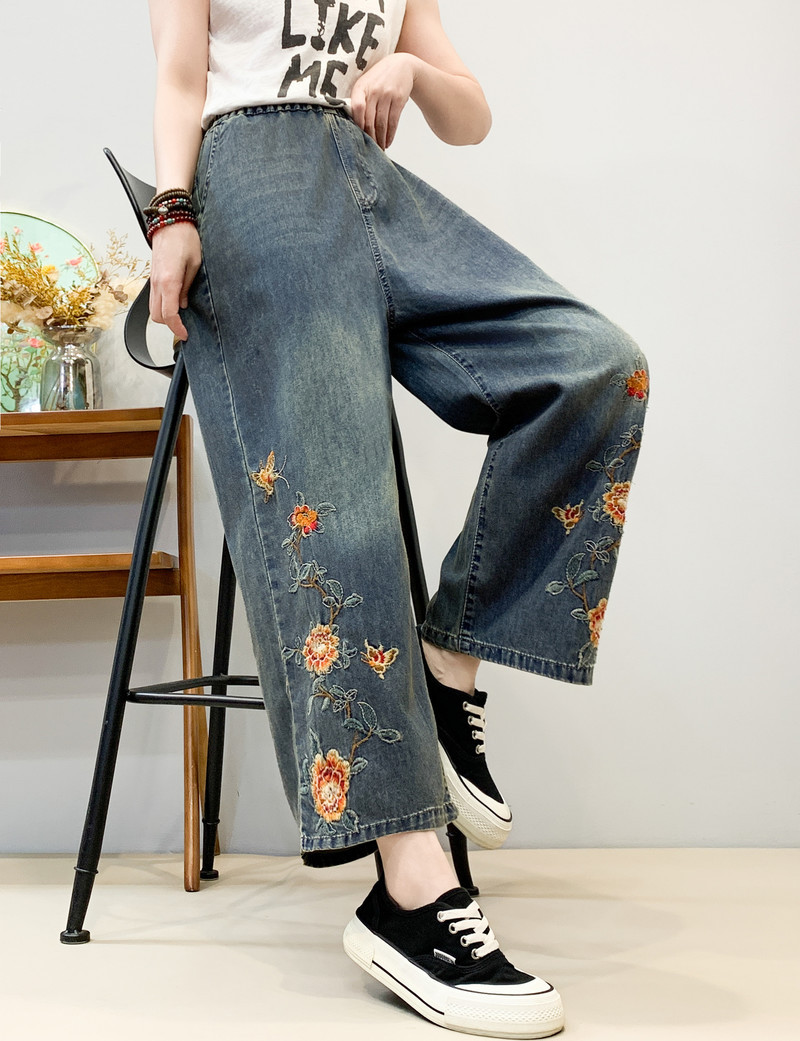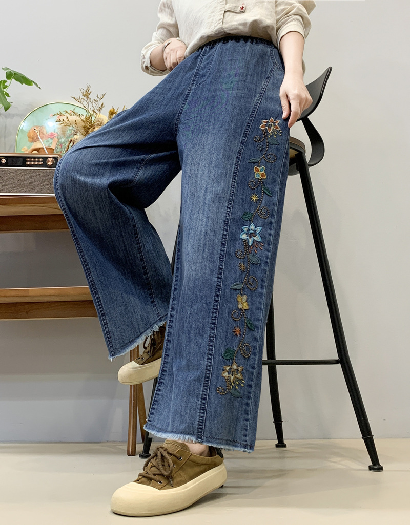2025 봄 새로운 느슨한 큰 자수 꽃 탄성 허리 흰색 씻은 데님 바지 도매 조수스토어 가기