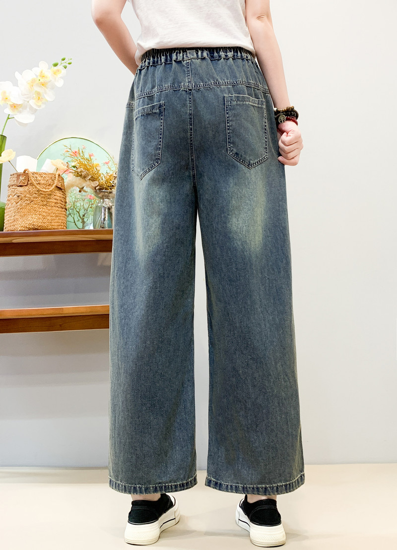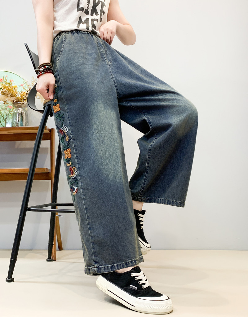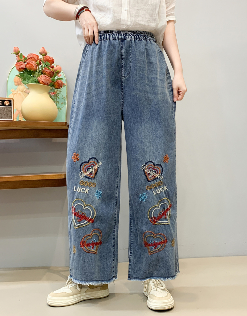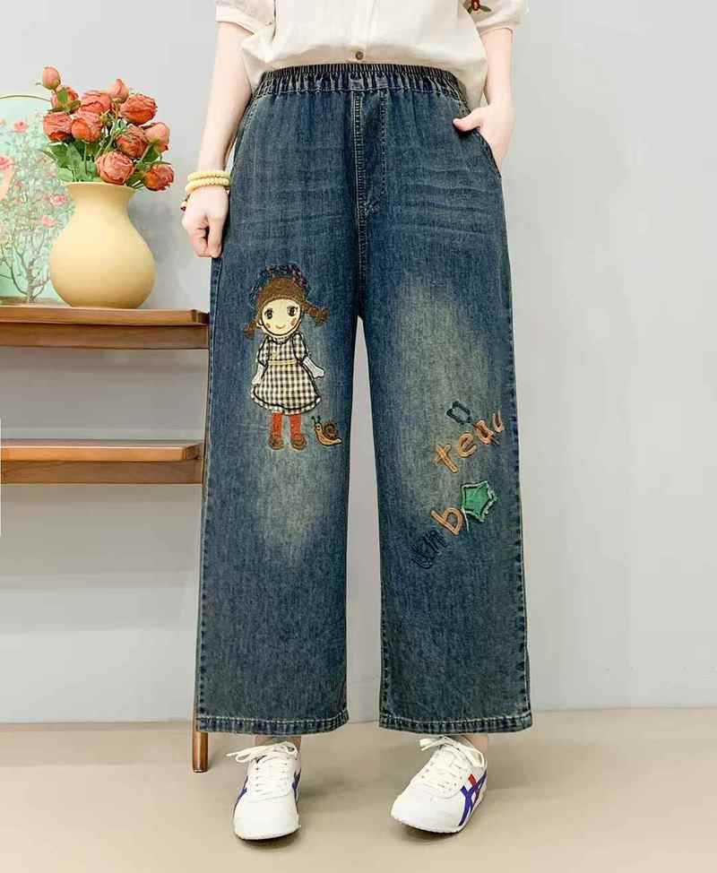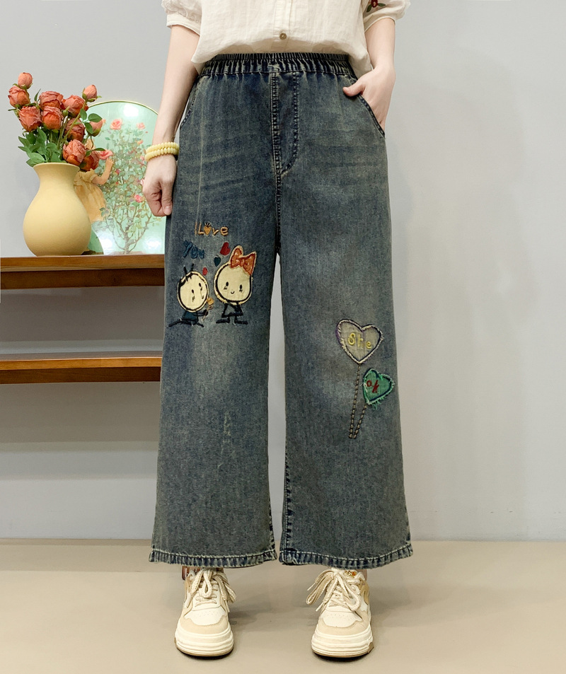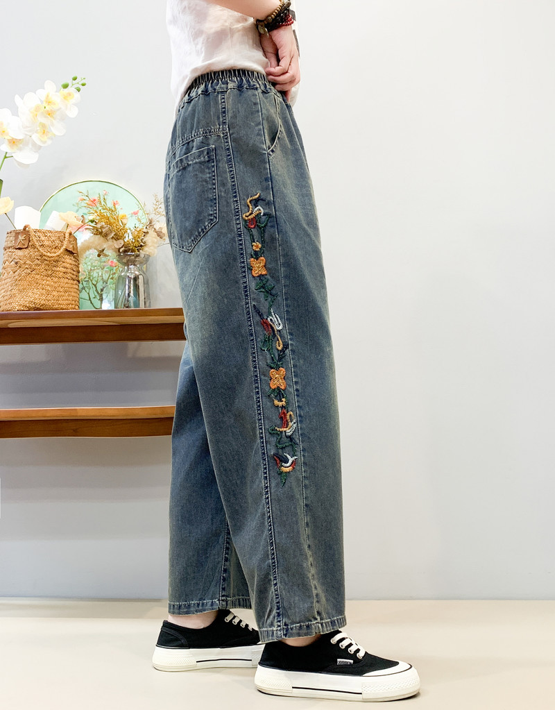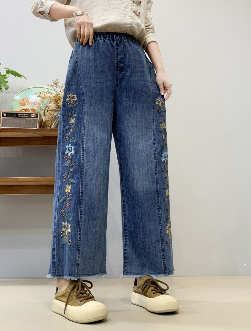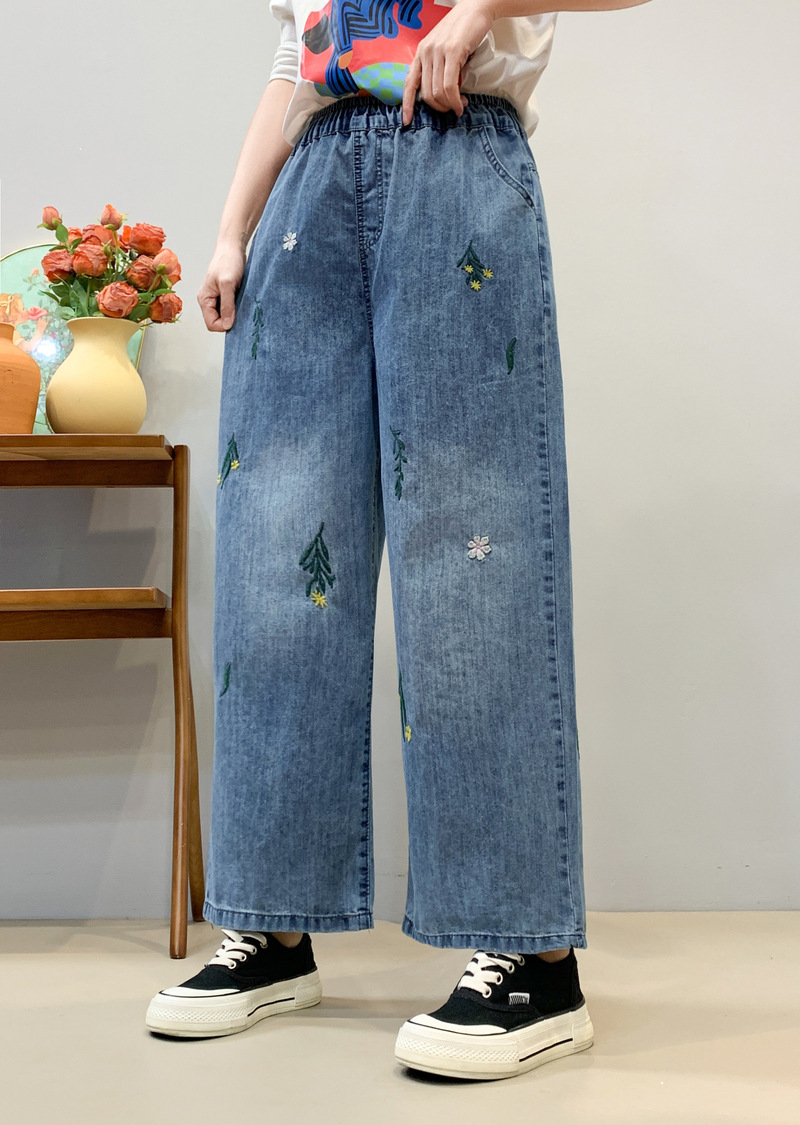 2025 봄 새로운 느슨한 큰 자수 꽃 탄성 허리 흰색 씻은 데님 바지 도매 조수스토어 가기