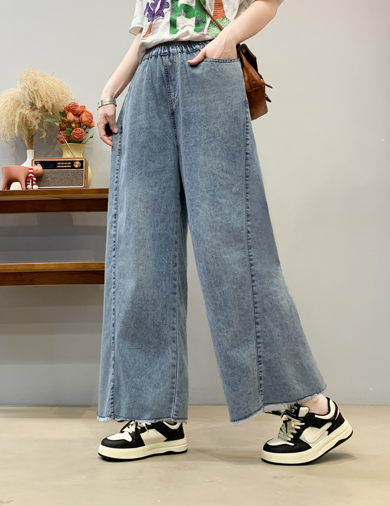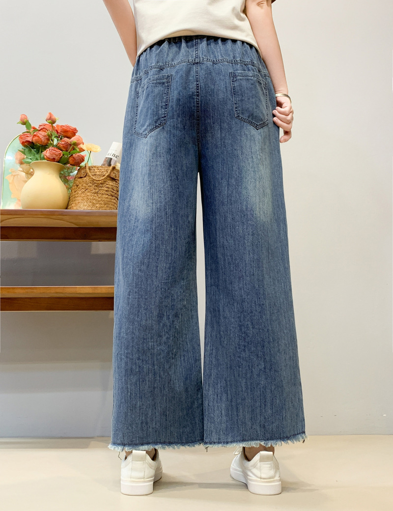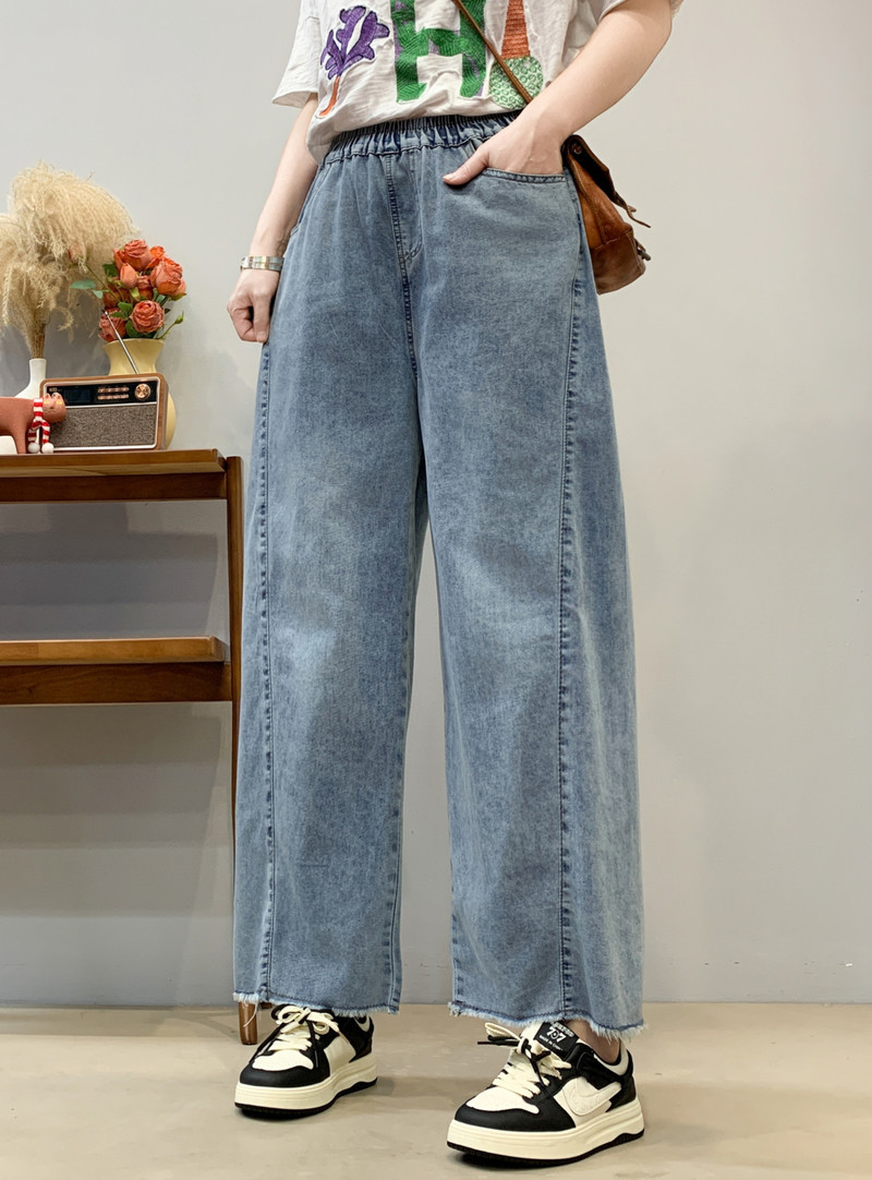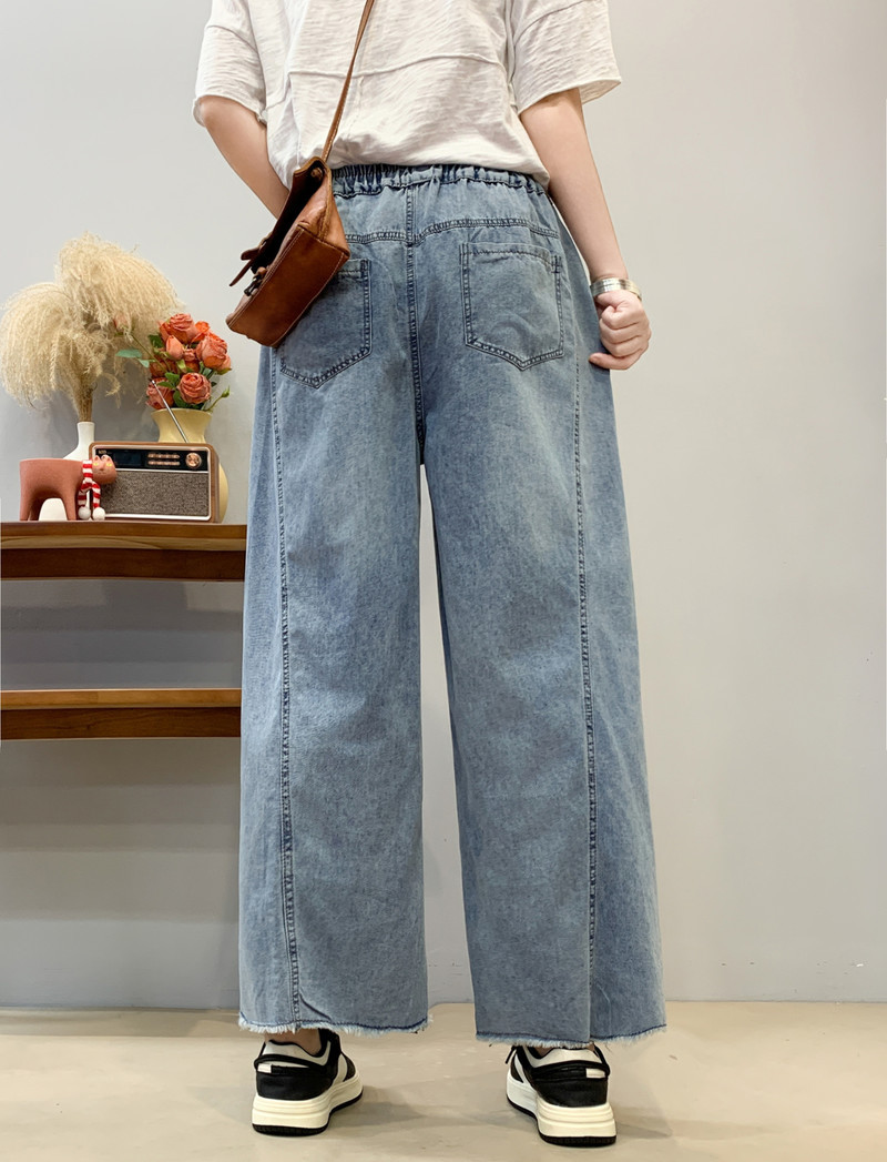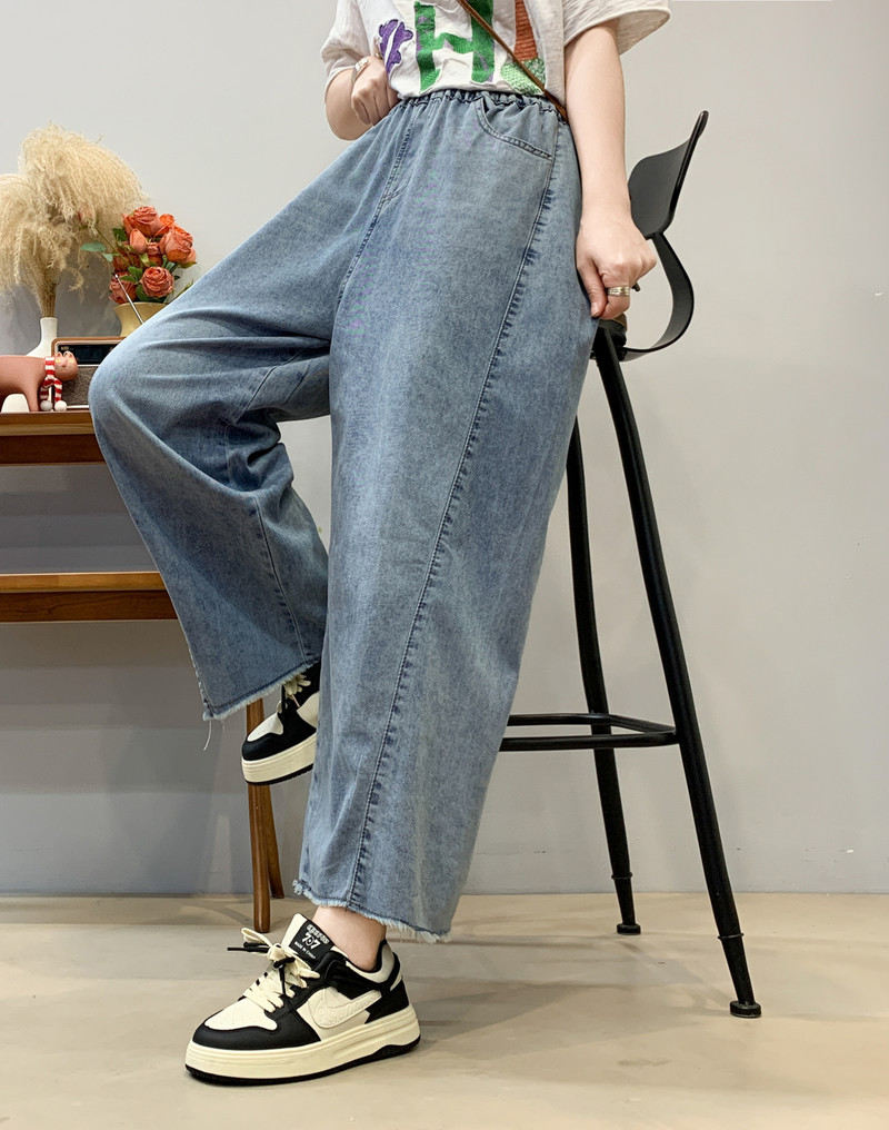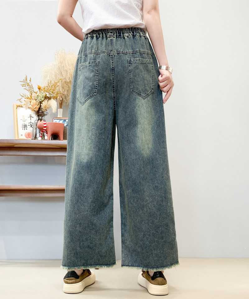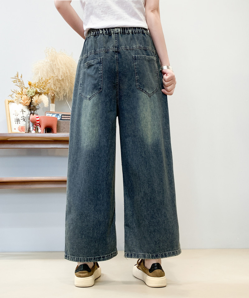 2025 봄 새로운 느슨한 큰 자수 꽃 탄성 허리 흰색 씻은 데님 바지 도매 조수스토어 가기