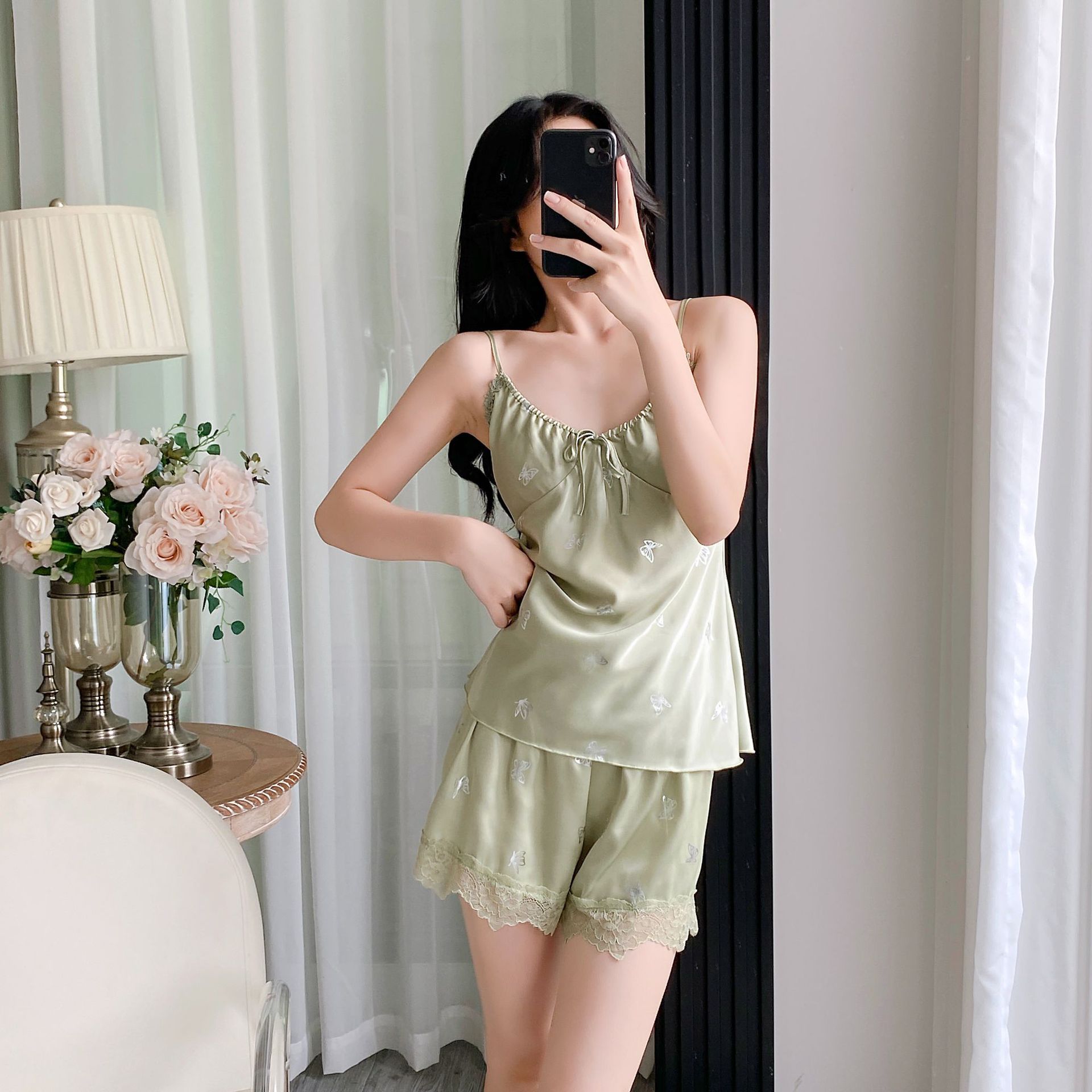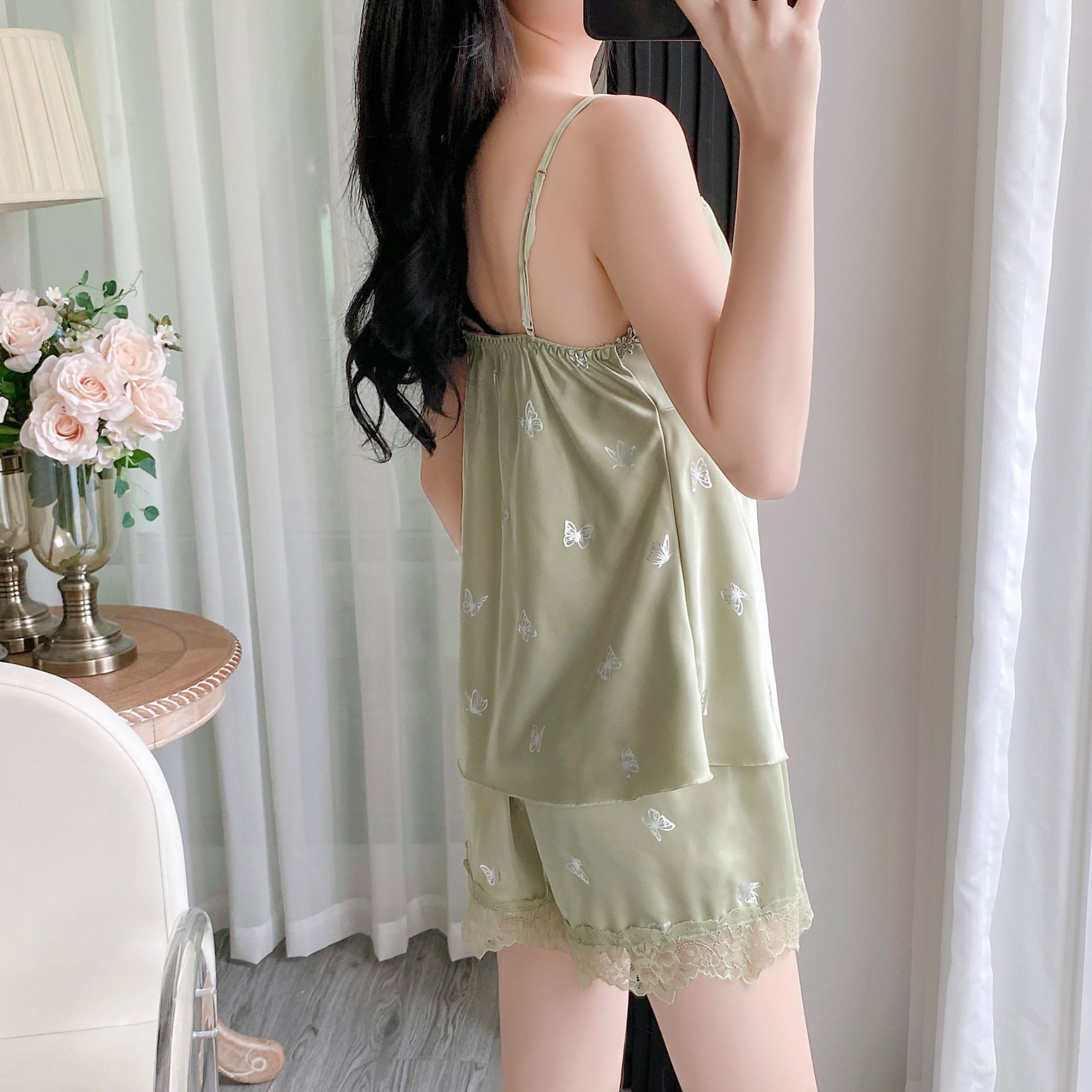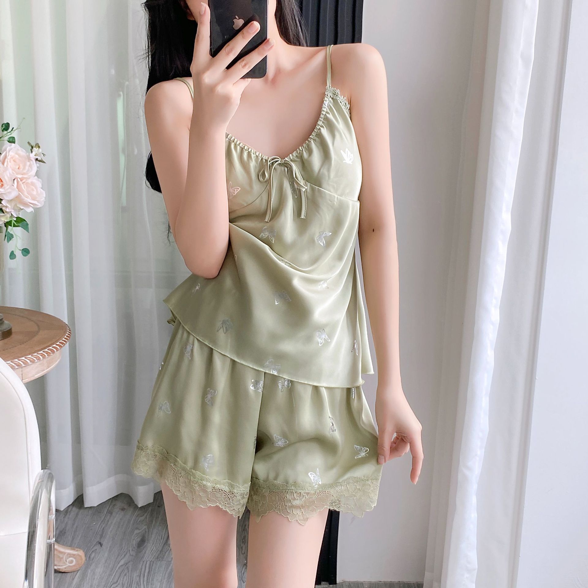 여름 섹시한 잠옷 여자 레이스 세트 실크 슬링 반바지 2 피스 분리 가능한 가슴 패드 녹색 나비
