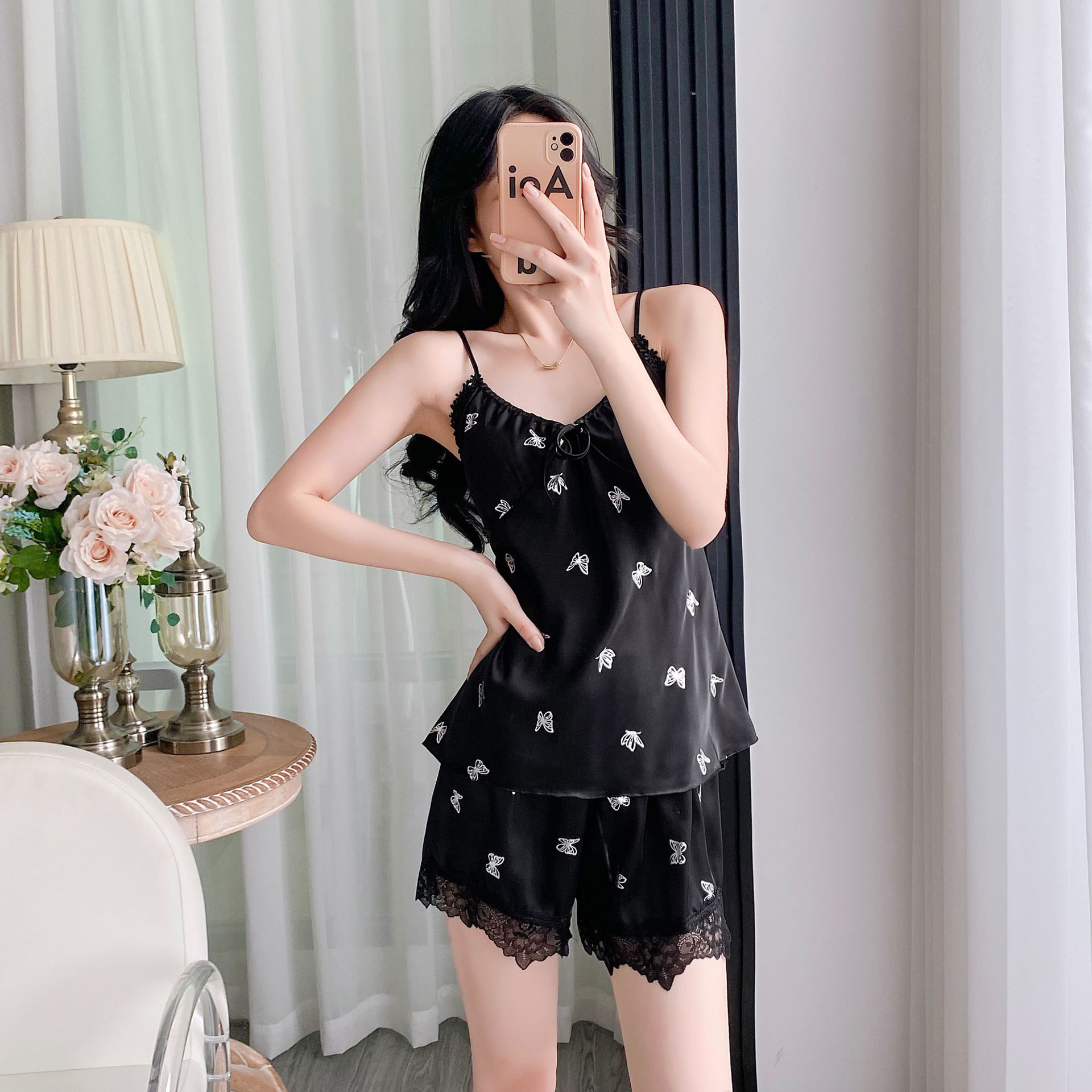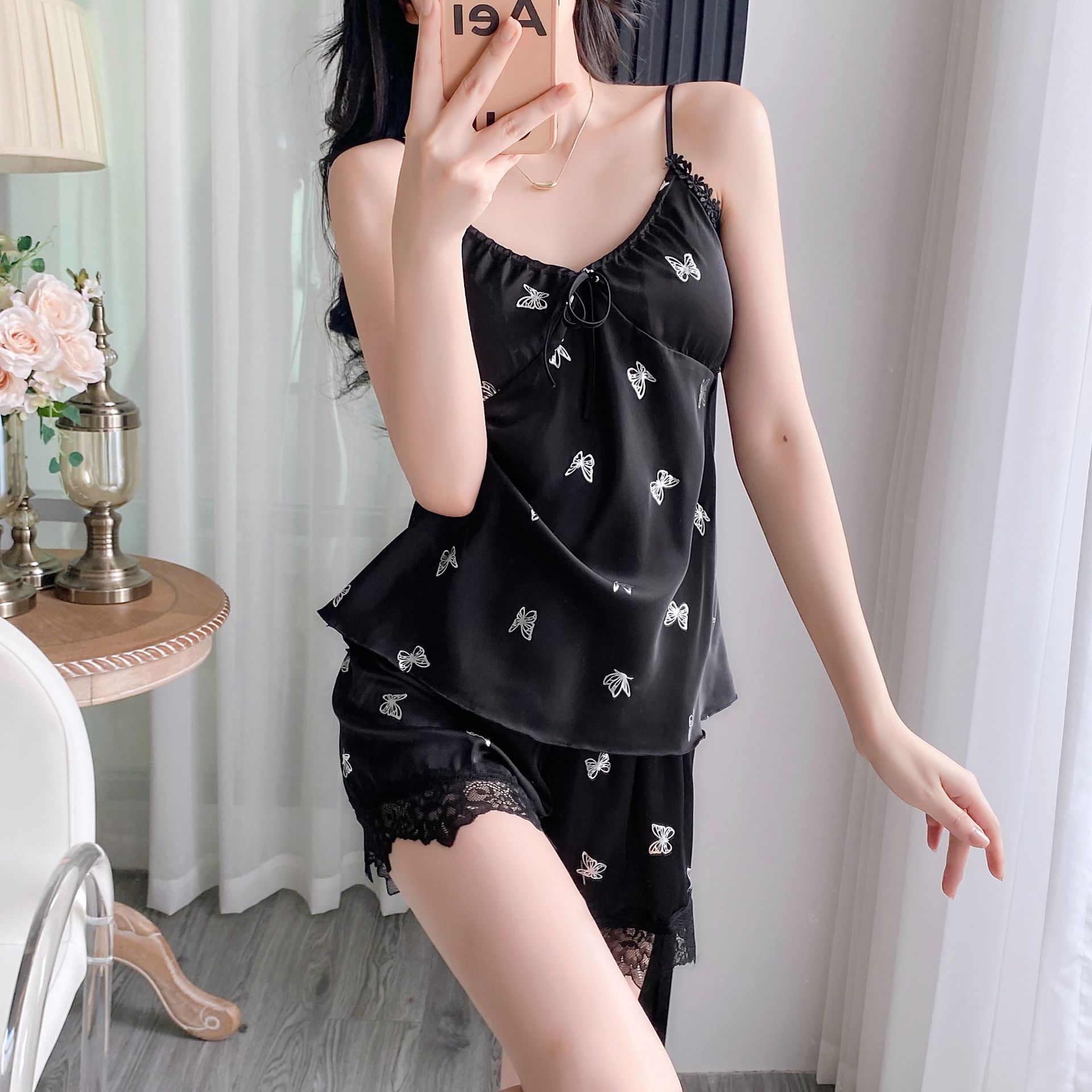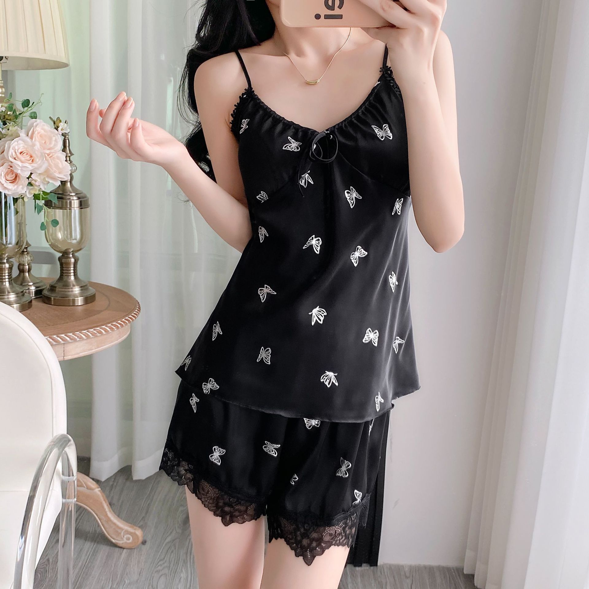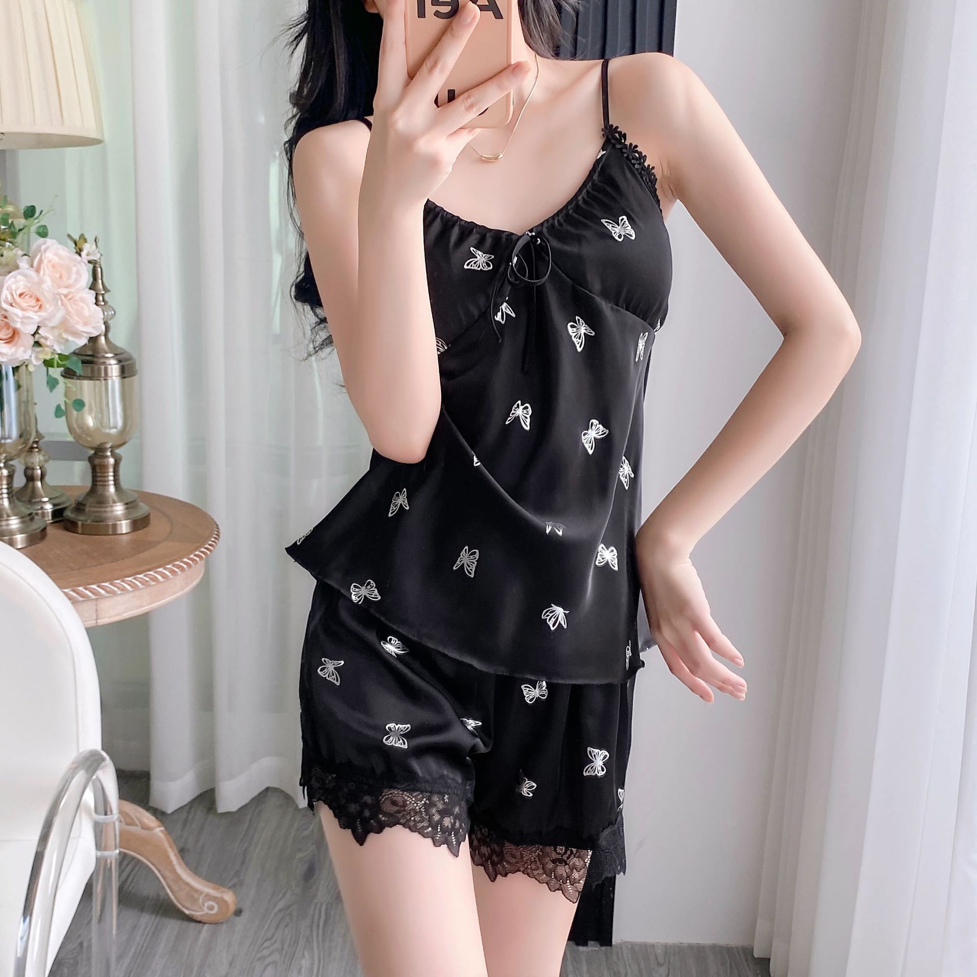 여름 섹시한 잠옷 여자 레이스 세트 실크 슬링 반바지 2 피스 분리 가능한 가슴 패드 녹색 나비