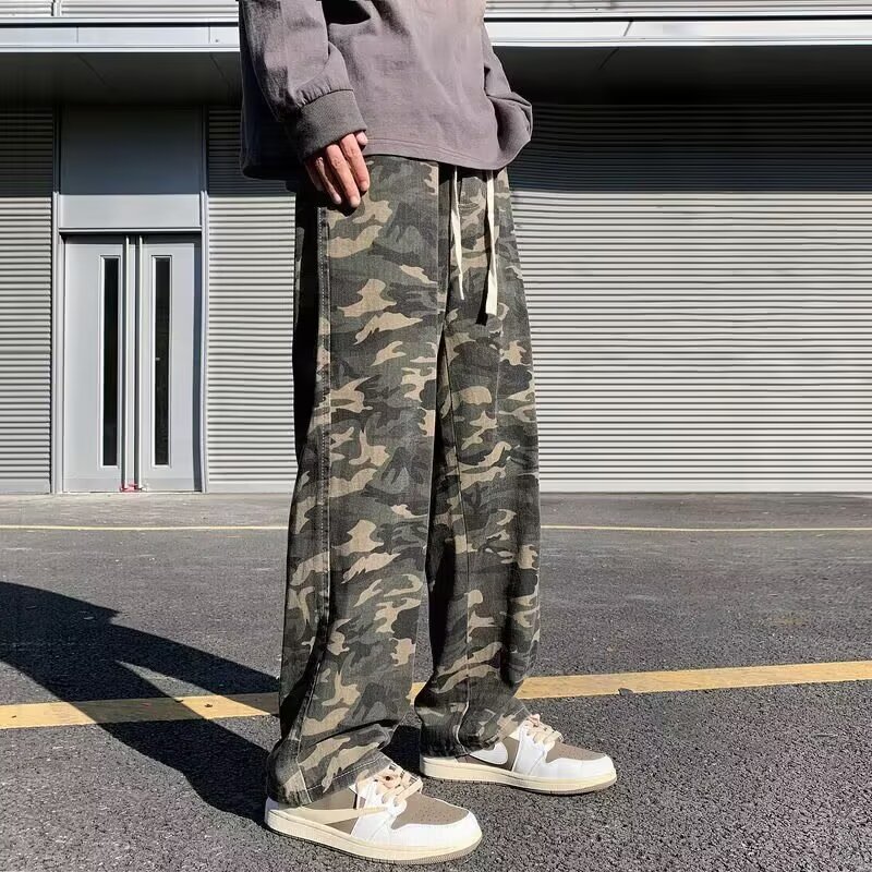 2025 봄과 가을 미국식 힙 위장 바지 남성용 Ins 하이 스트리트 트렌디 브랜드 남성용 루즈 스트레이트 와이드 레그 팬츠 남성용스토어 가기