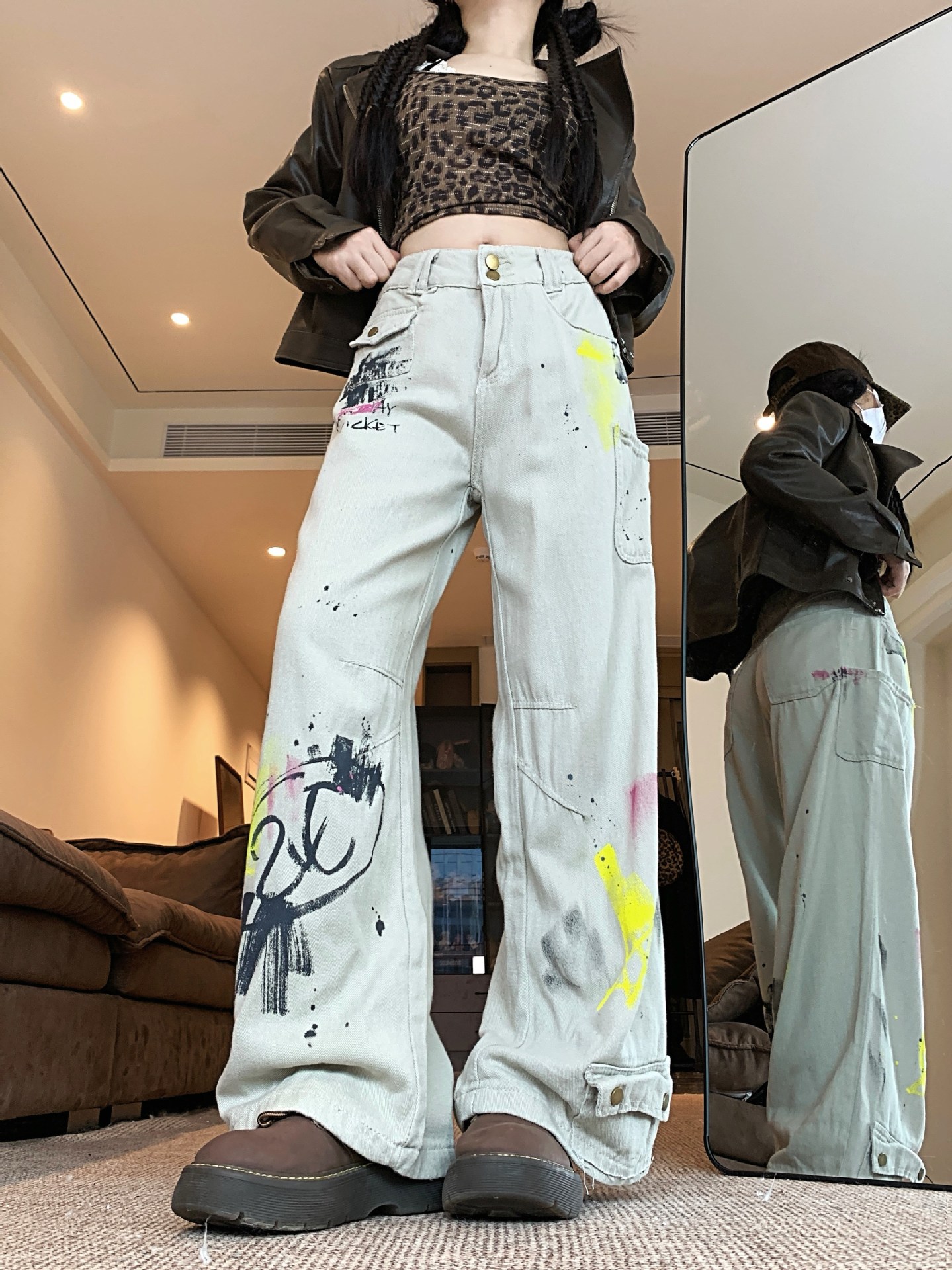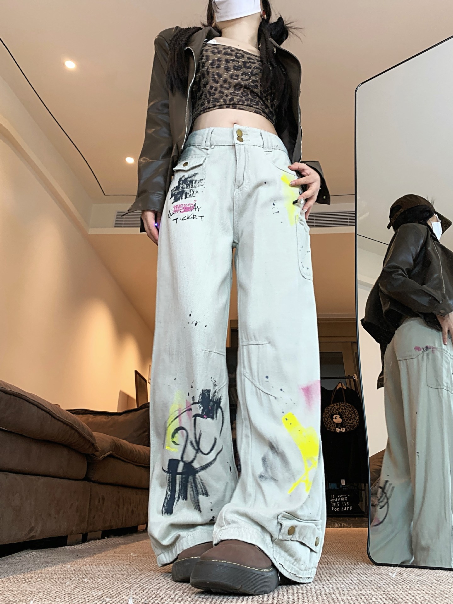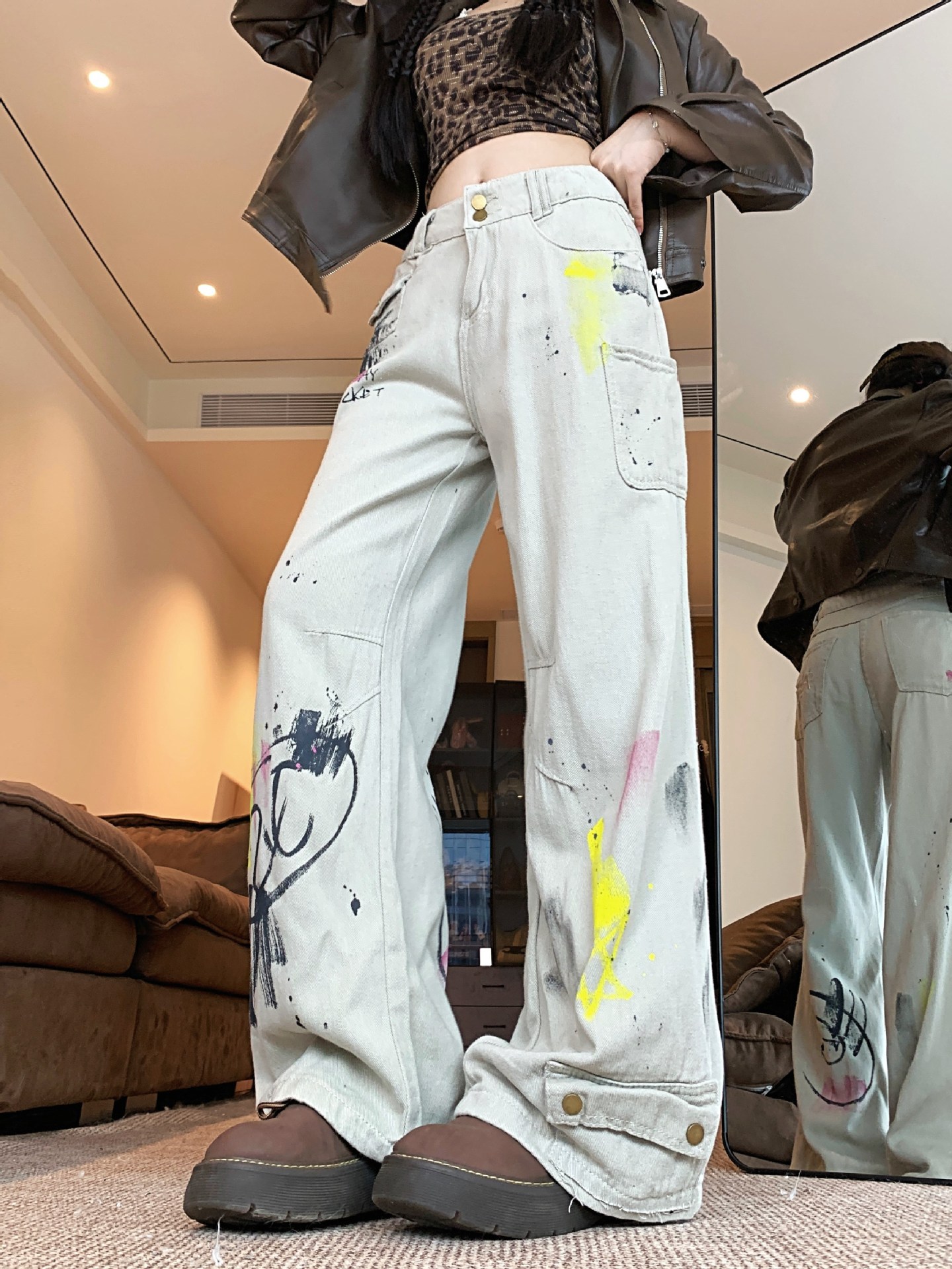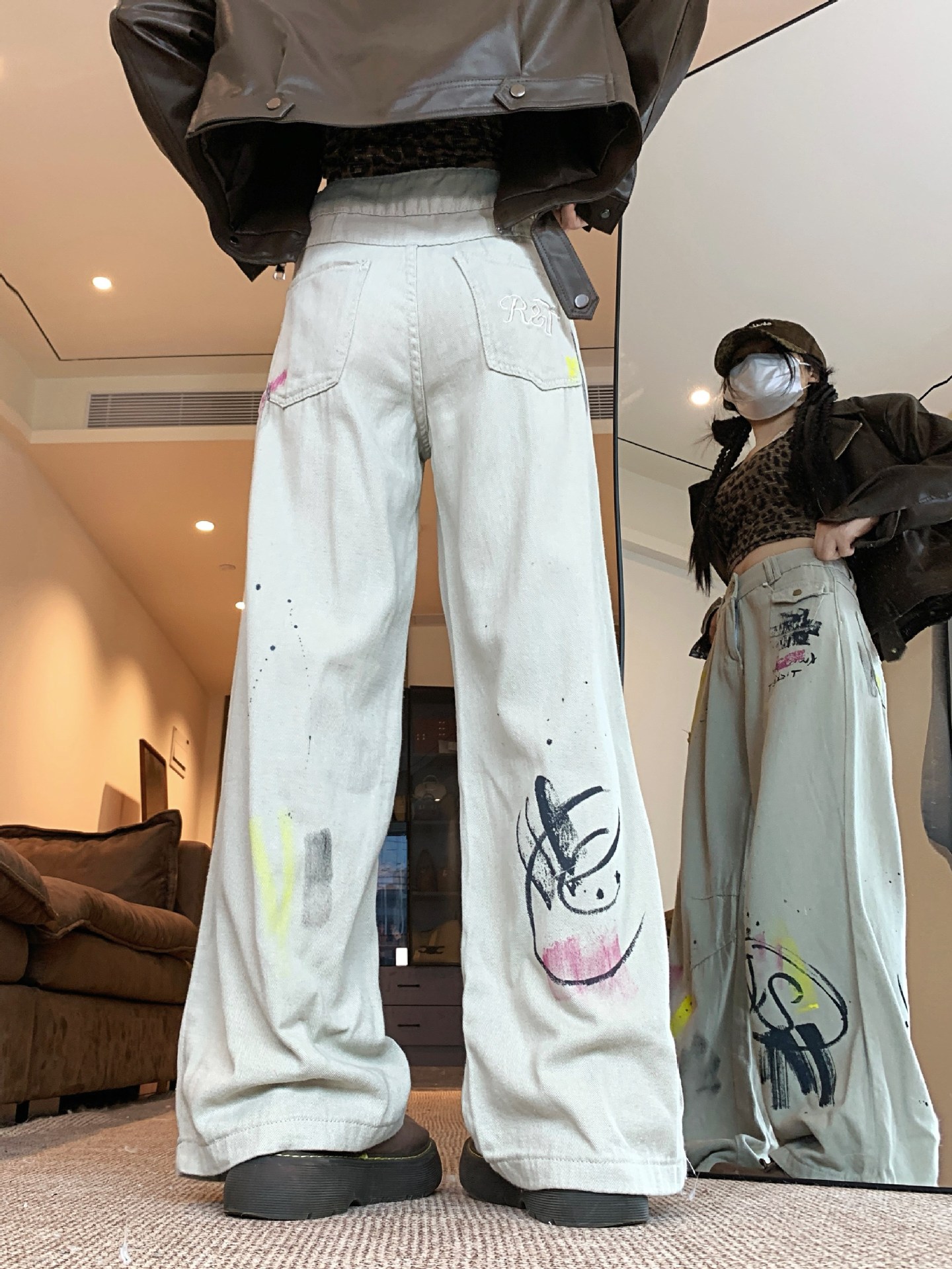 2025 디자인 센스 낙서 바지 느슨한 넓은 다리 청바지 여성의 봄 유럽 스트레이트 바지 특대 성격스토어 가기