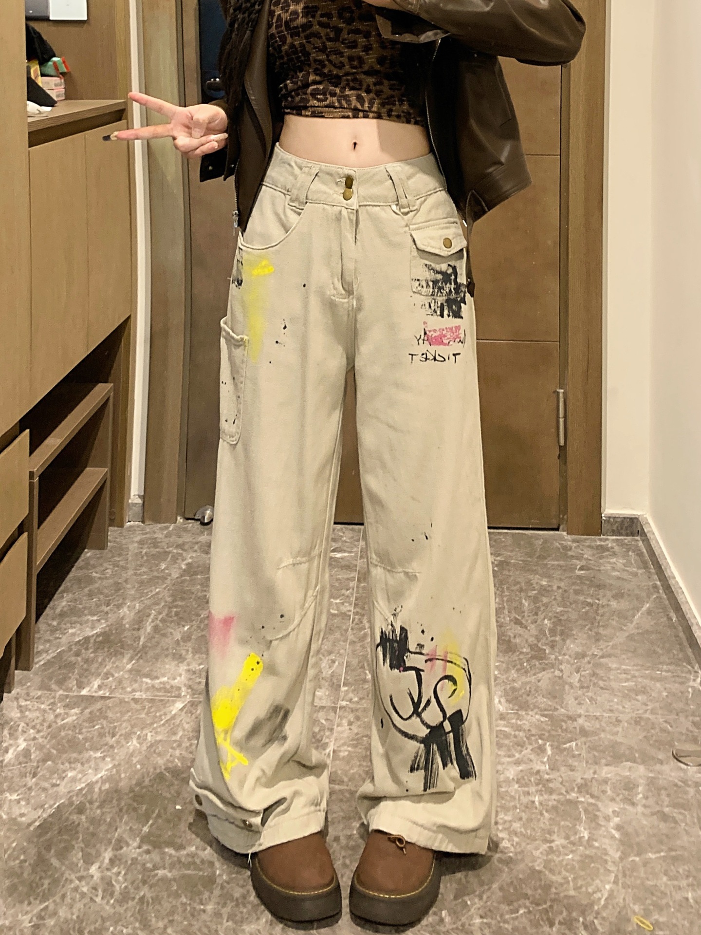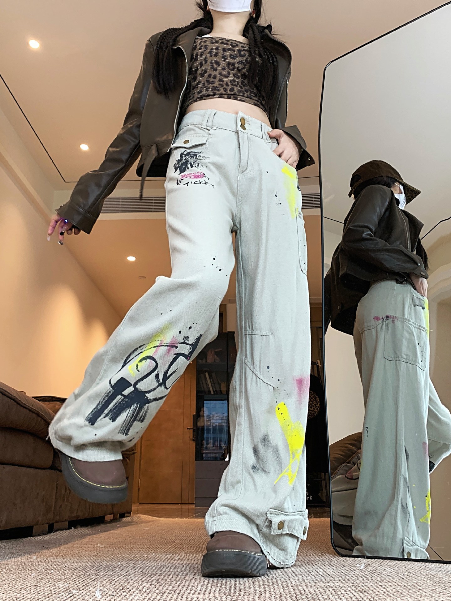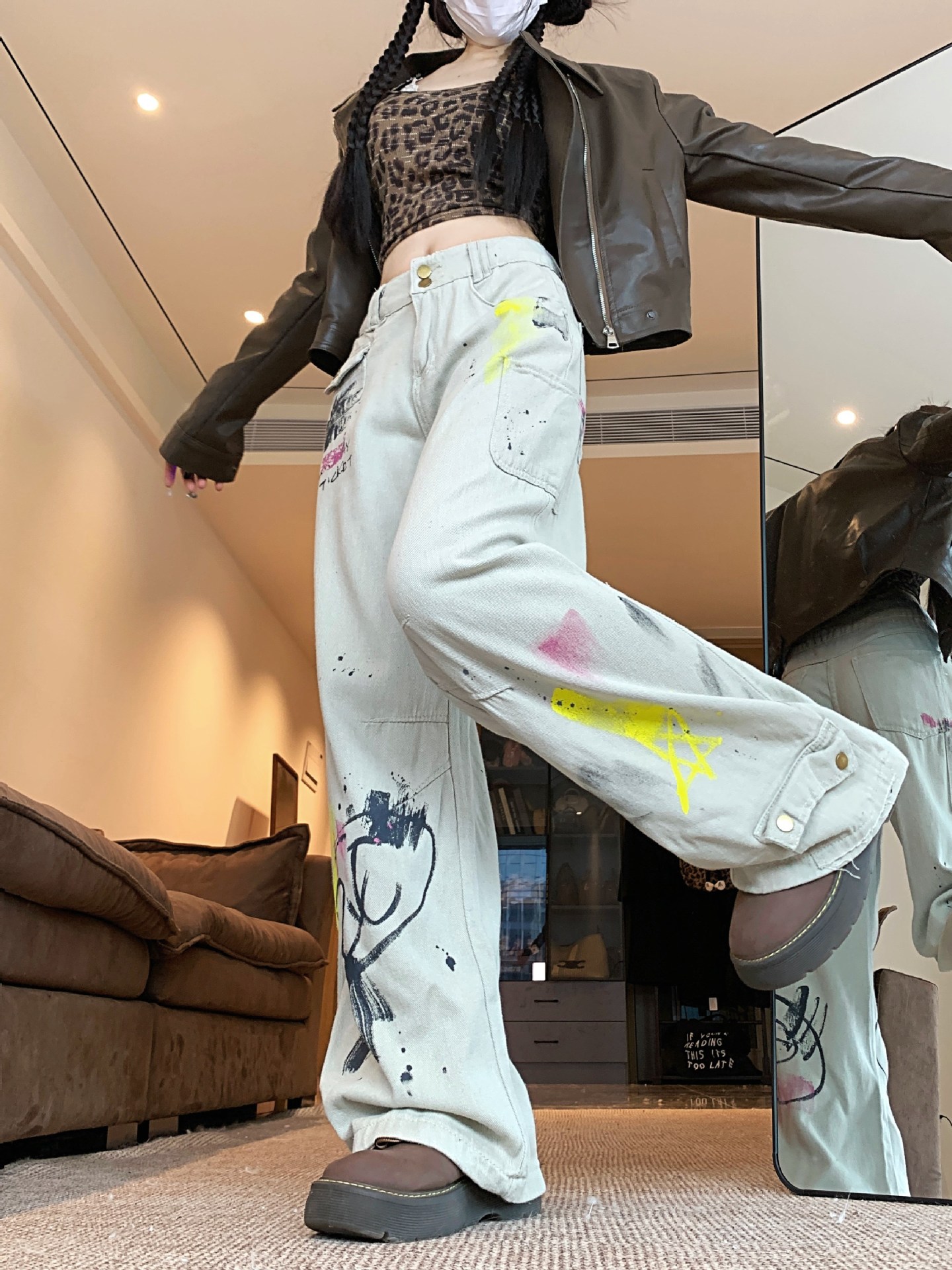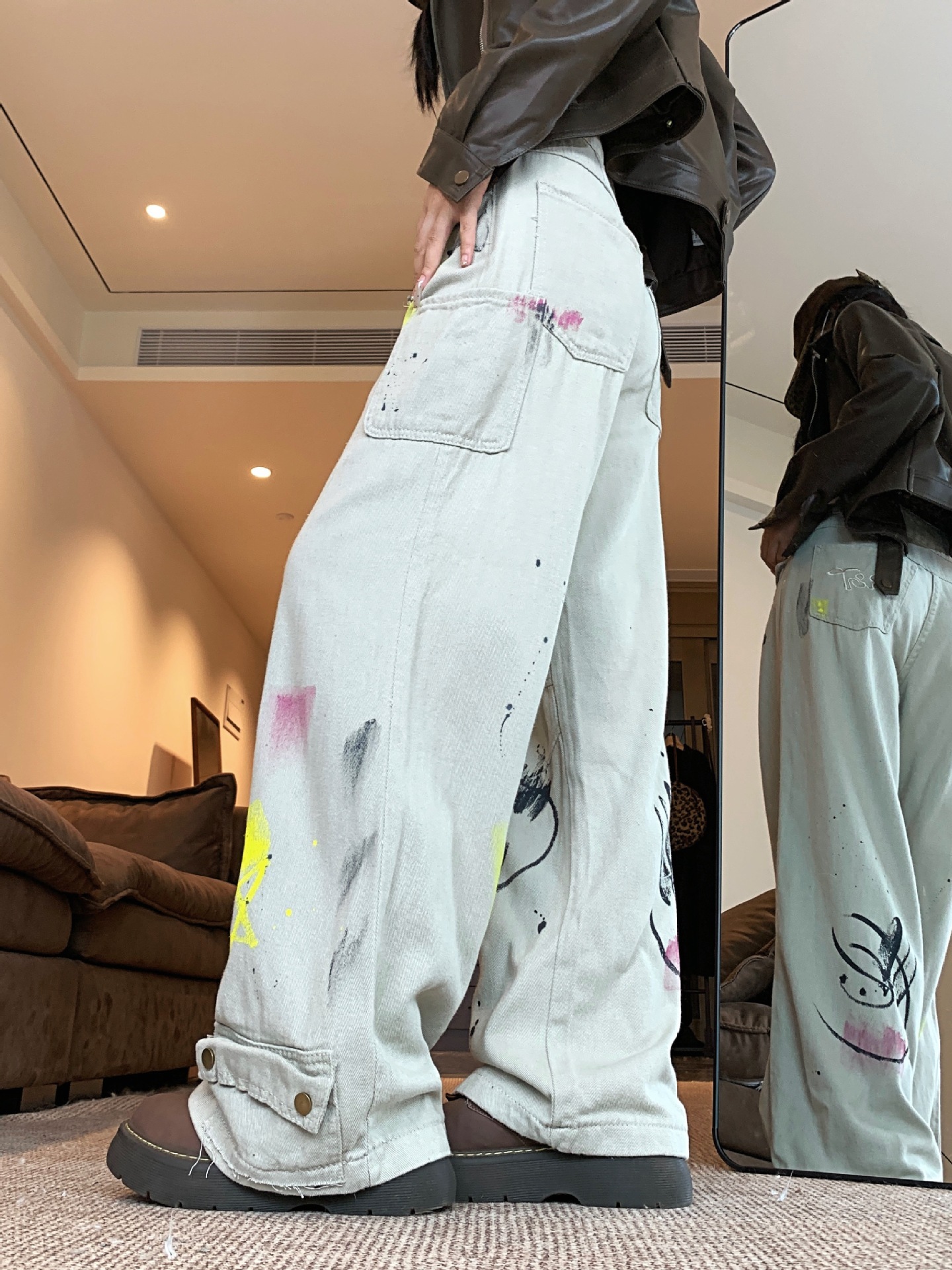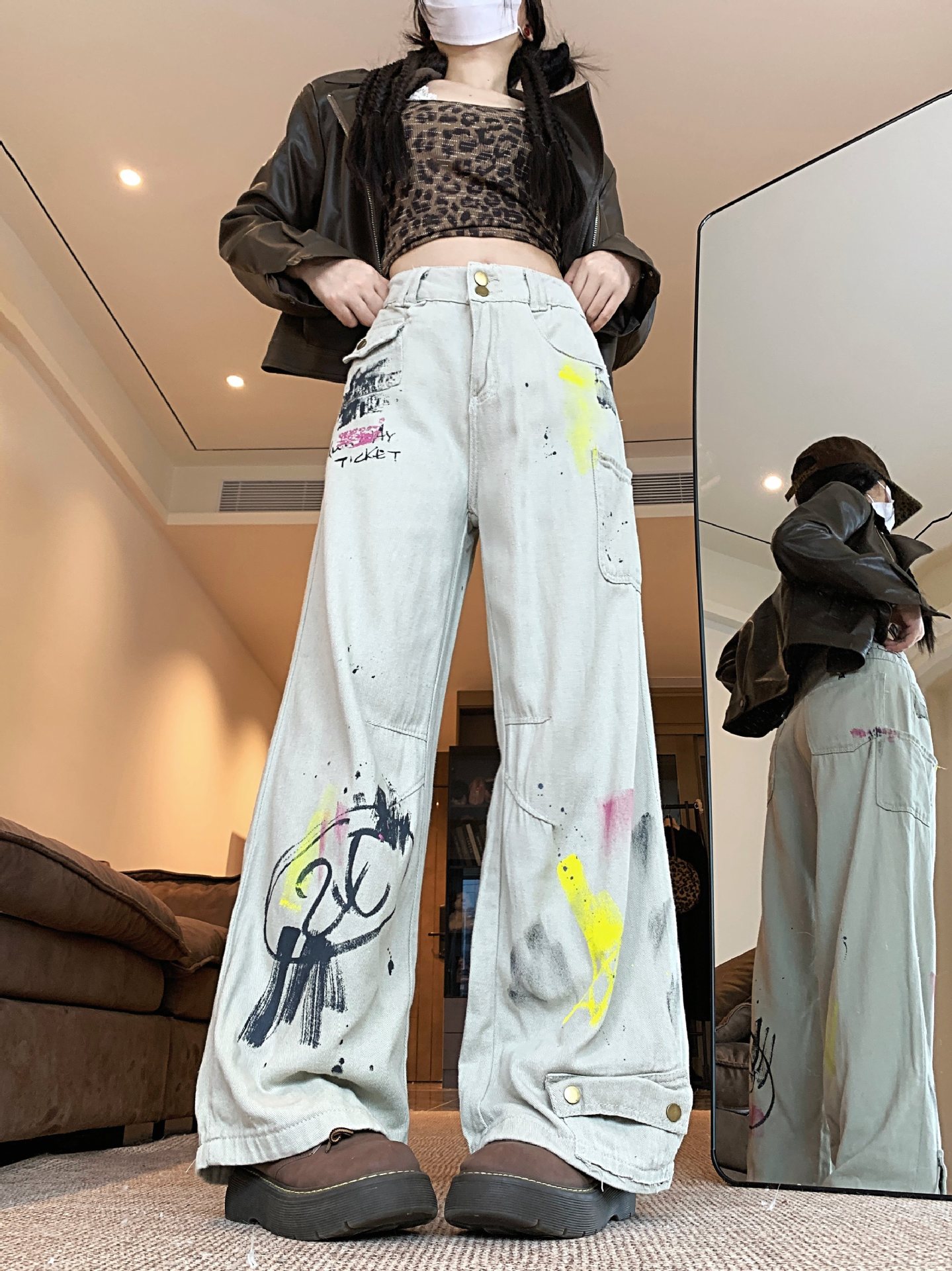 2025 디자인 센스 낙서 바지 느슨한 넓은 다리 청바지 여성의 봄 유럽 스트레이트 바지 특대 성격스토어 가기