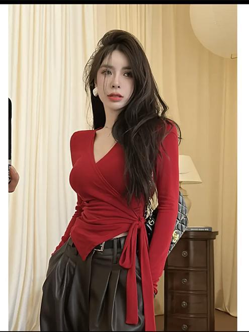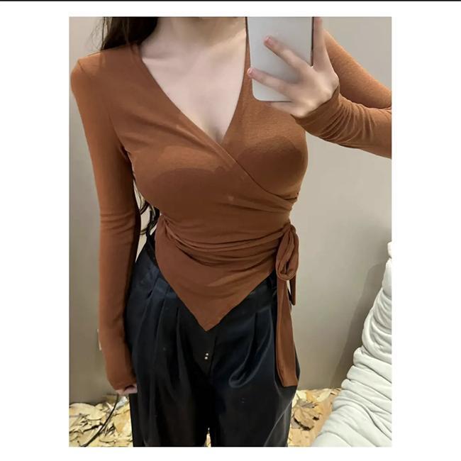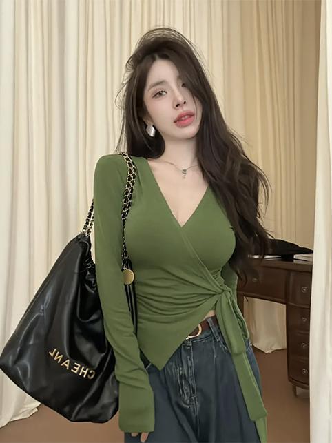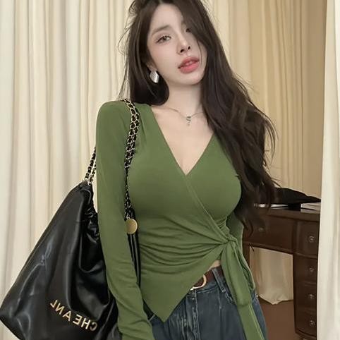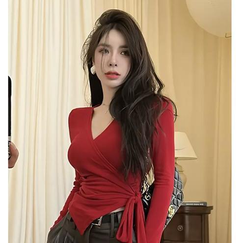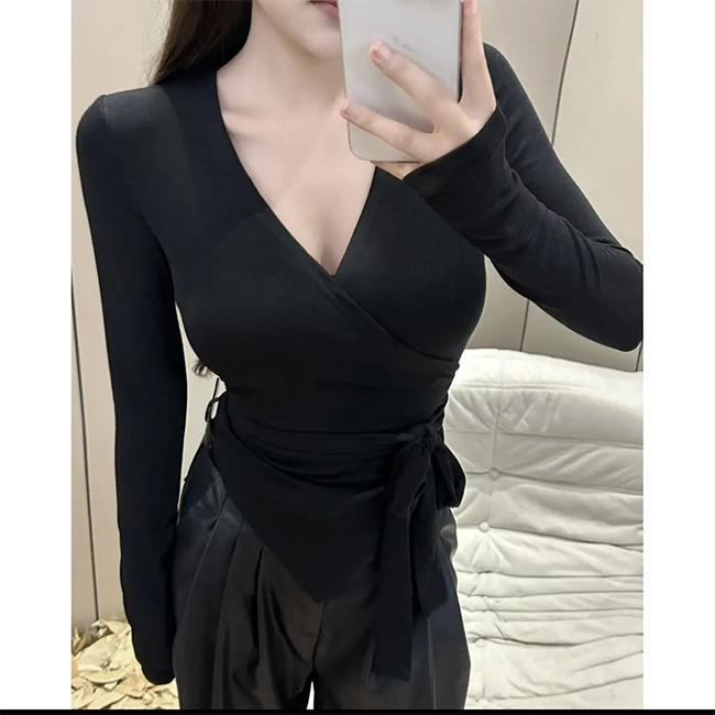 타이트 웨이스트 스트랩 초가을 가을베이스 셔츠 새로운 디자인 센스 올매치 니치 아이레귤러 V 넥 긴팔 티셔츠스토어 가기