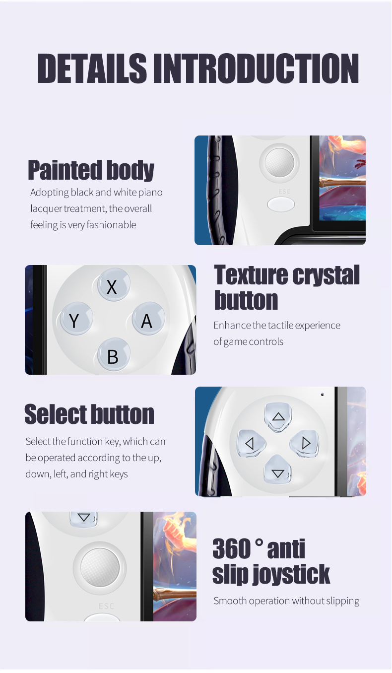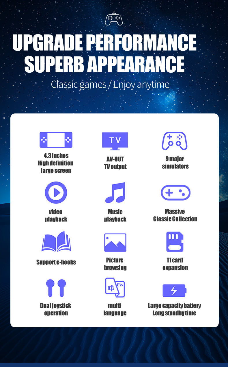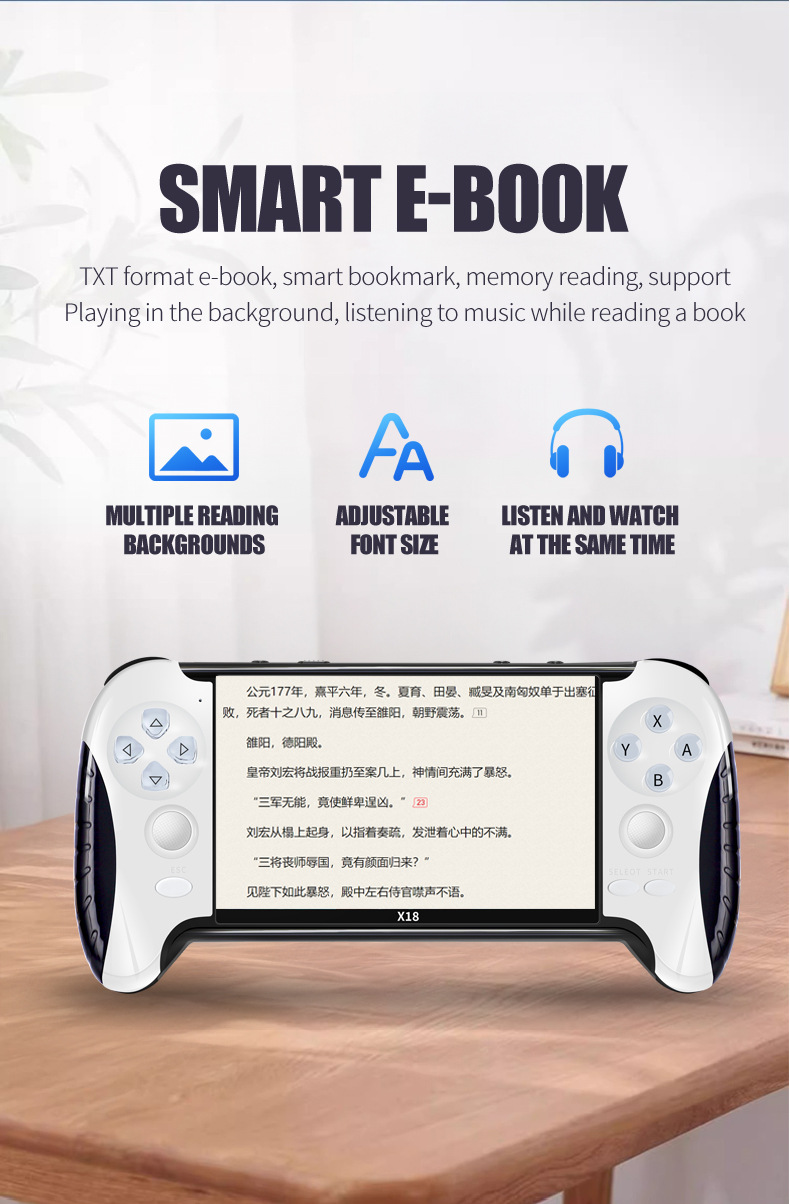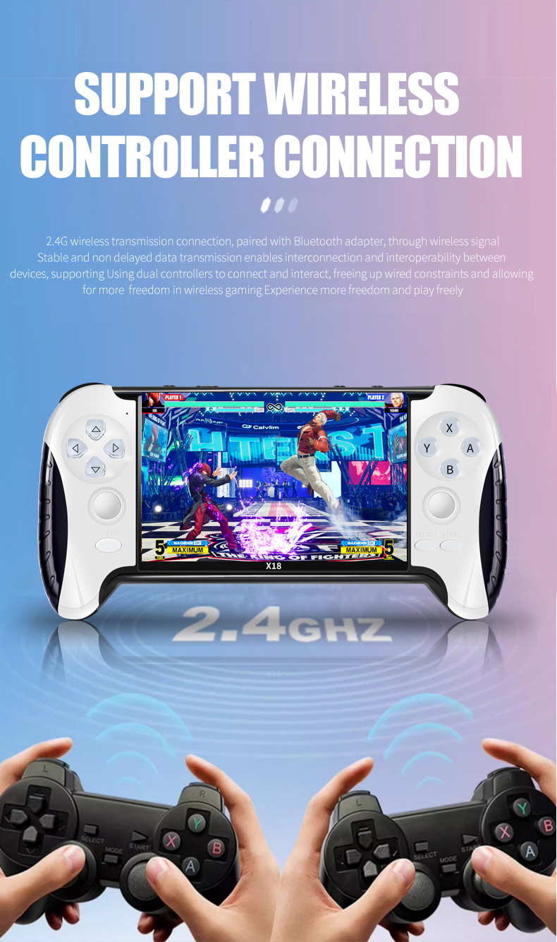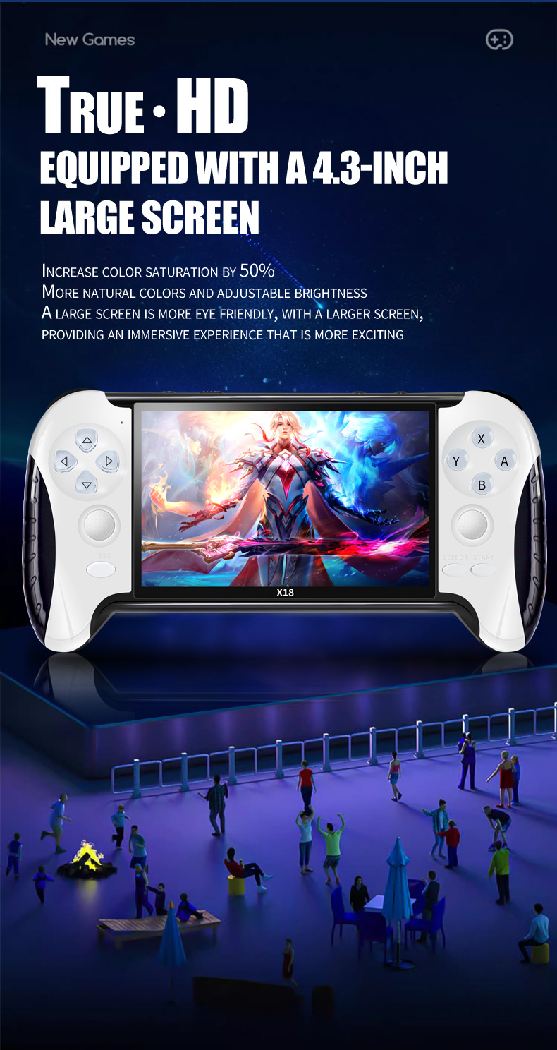 국경을 넘는 새로운 X18 핸드 헬드 게임기 4.3 인치 HD 대형 스크린은 9 개의 시뮬레이터와 수천 개의 클래식 게임을 지원합니다.스토어 가기