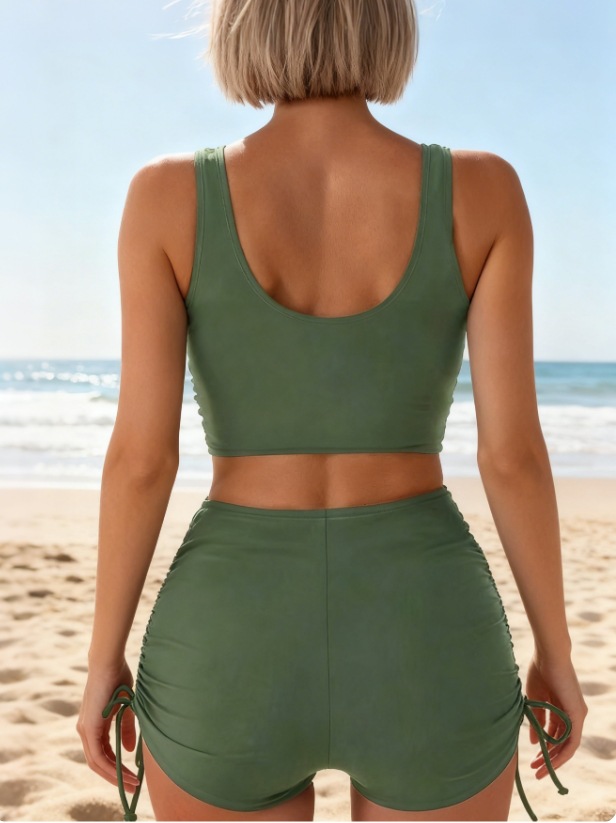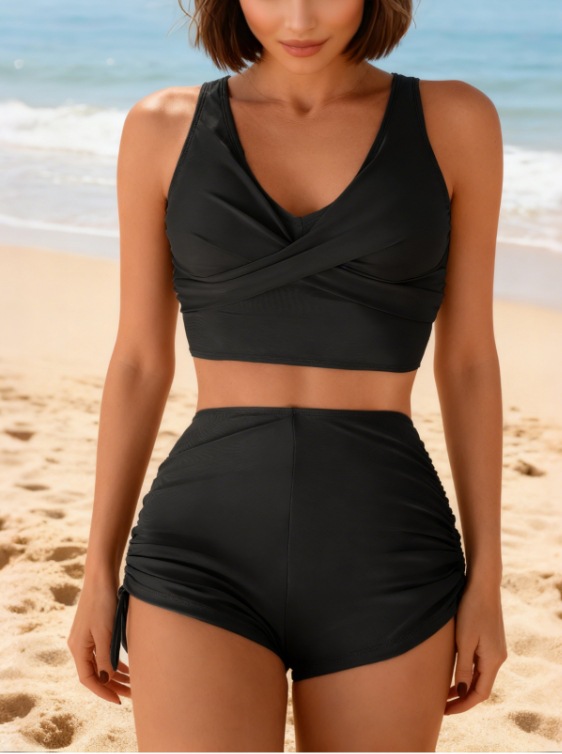 유럽풍 여성용 투피스 수영복, 고급스럽고 보수적이며 배를 가려주는 슬림핏, 크로스 플리츠 디자인, 하이웨이스트 드로스트링 비키니