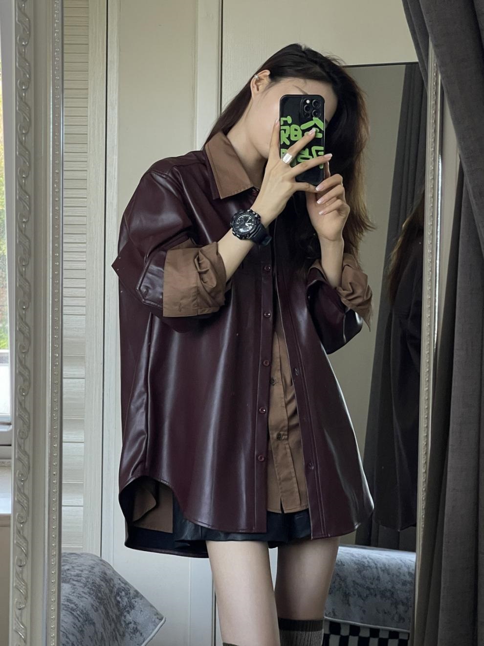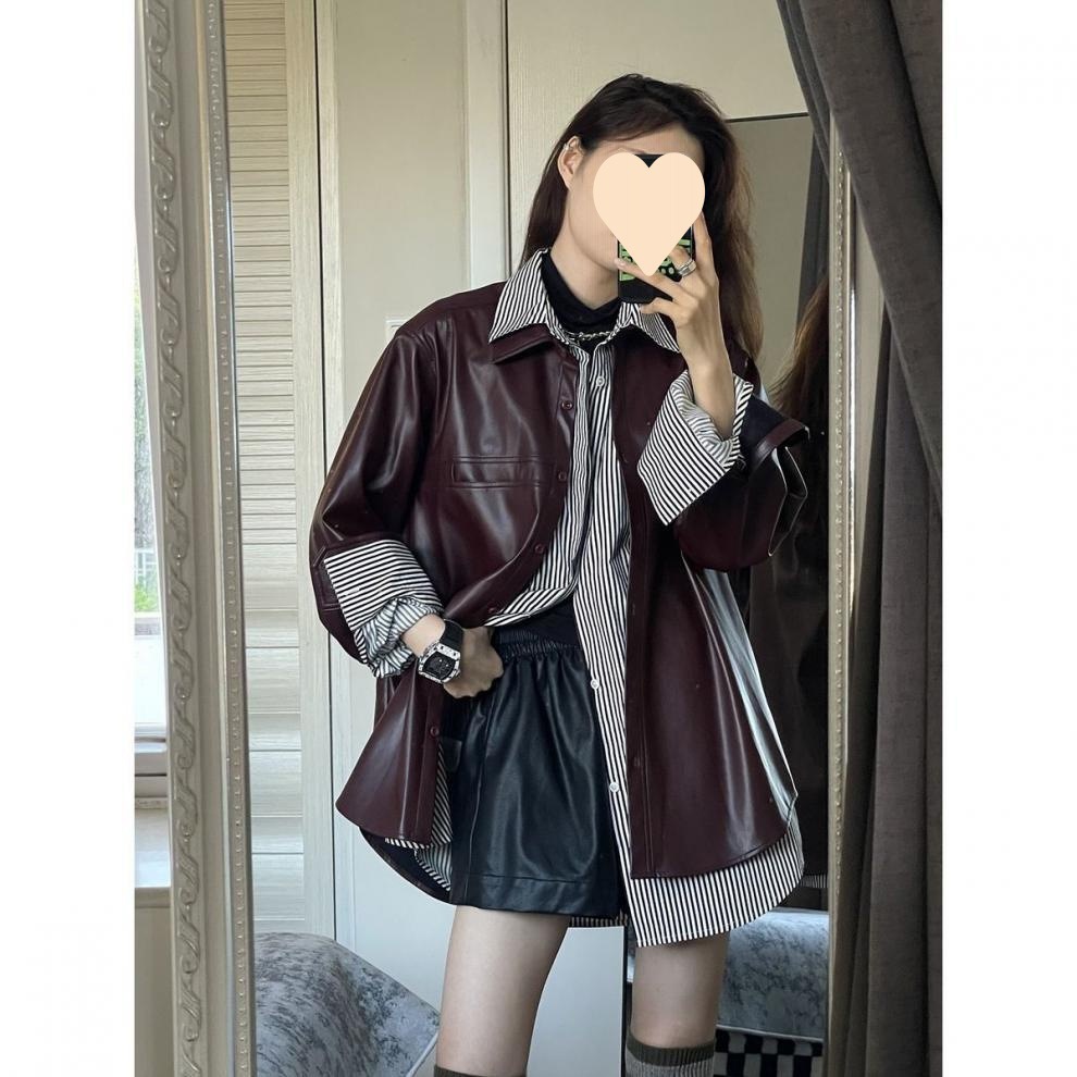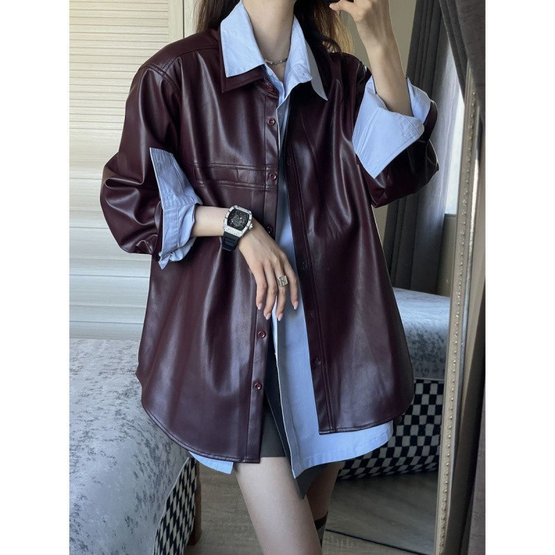 빈티지 포도 퍼플 PU 가죽 자켓 여성 가을 2024 패션 새로운 미국 패션 재킷 올 매치 셔츠스토어 가기