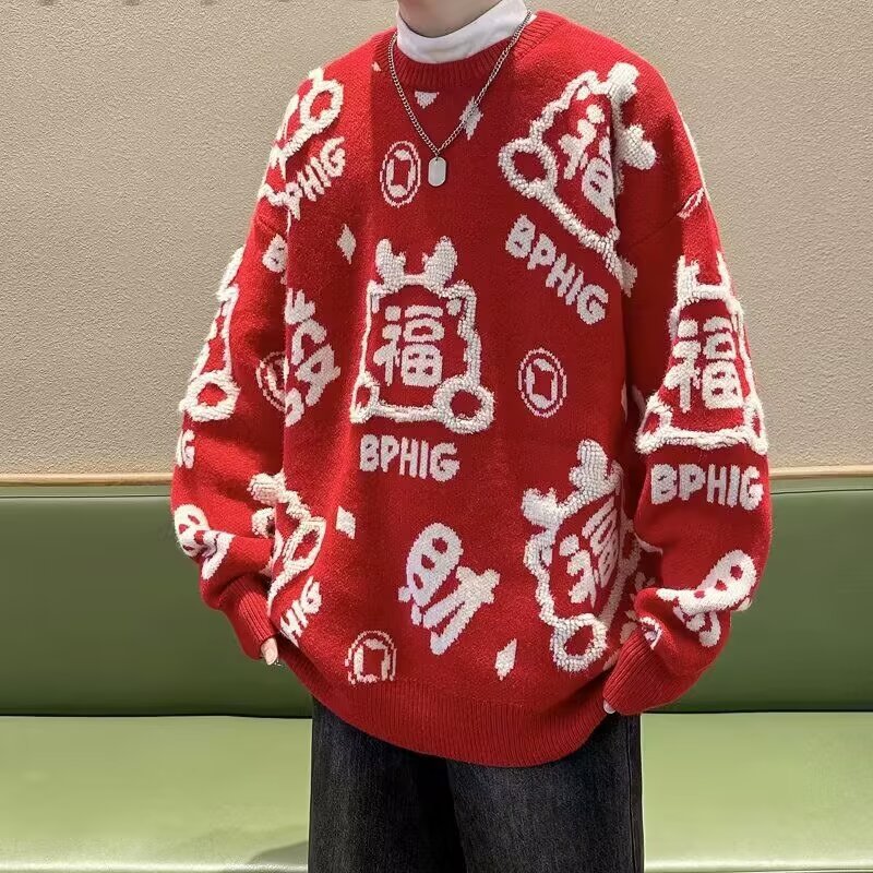 붉은 새해 축제 스웨터 남자 포춘 자카드 2024 새로운 느슨한 니트 스웨터 독특한 트렌디 한 따뜻한 스웨터