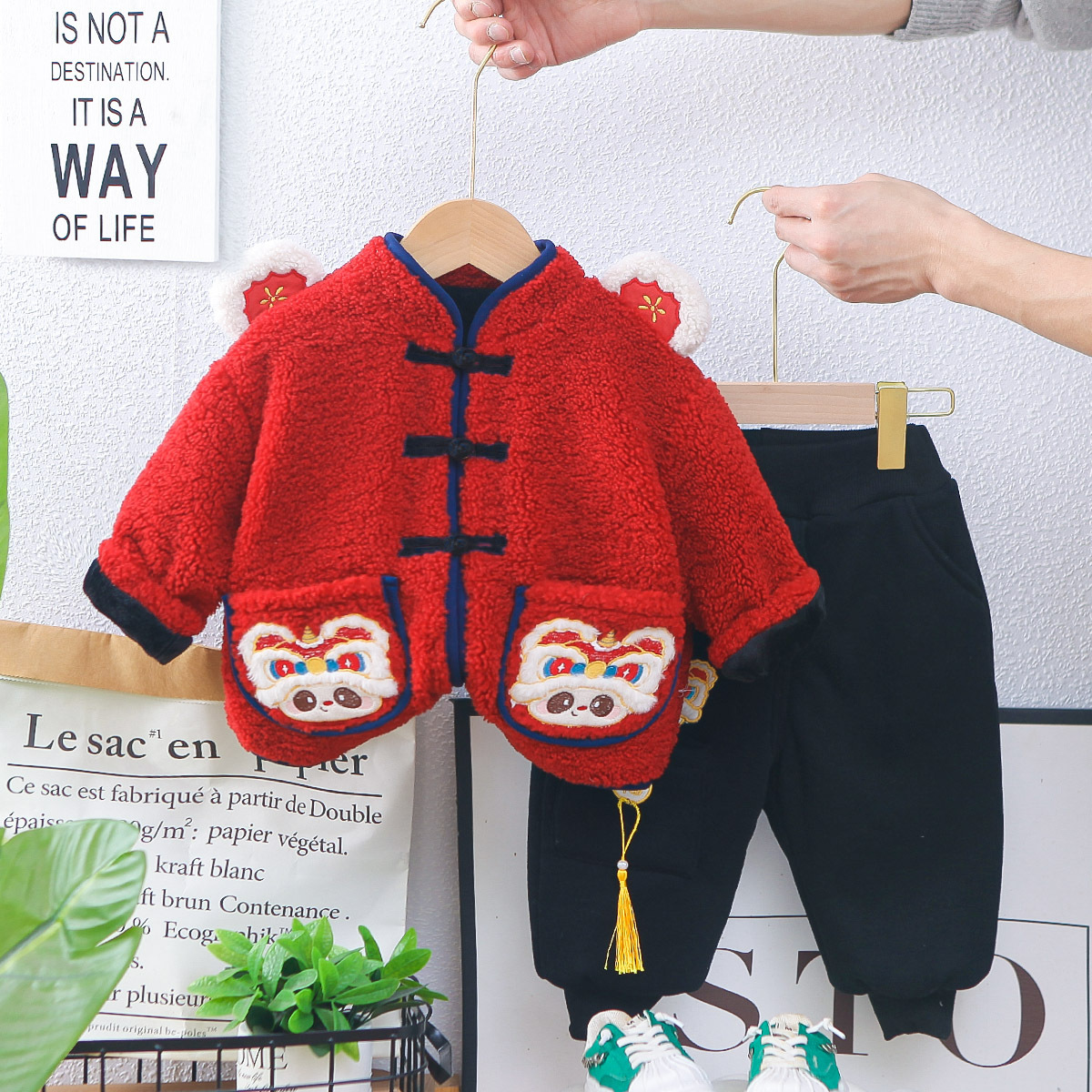 케케마오자자 어린이 설날 의상 겨울 아기 세트 빨간색 남아용 설날 바지 여아용 코트 축제 의상스토어 가기