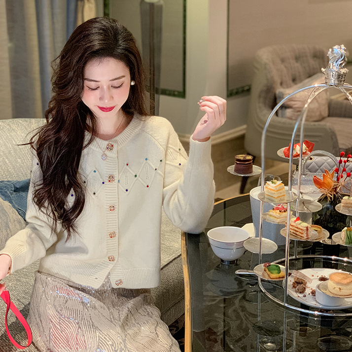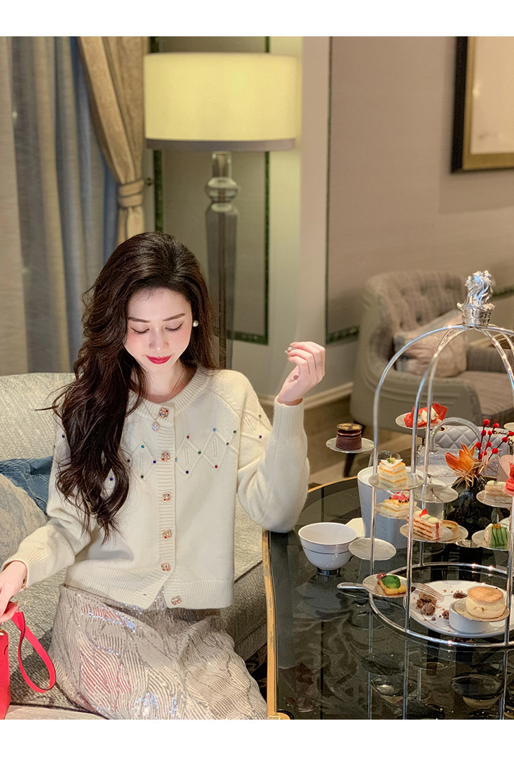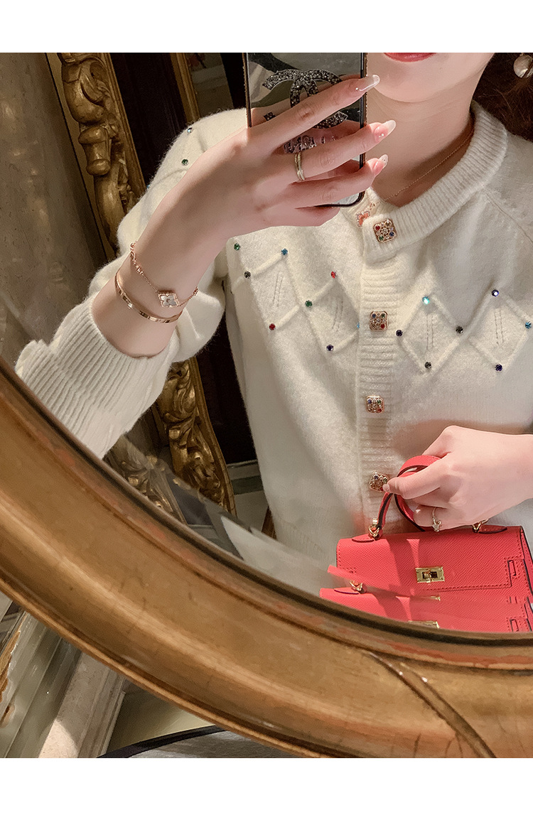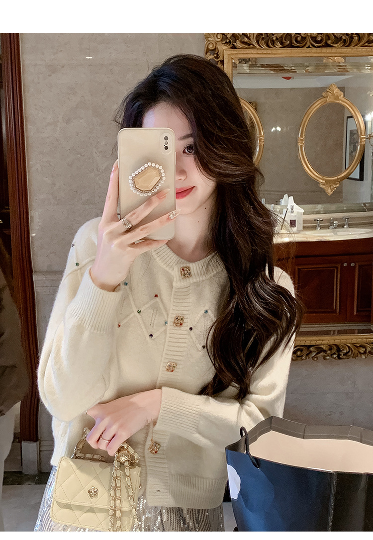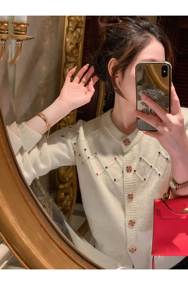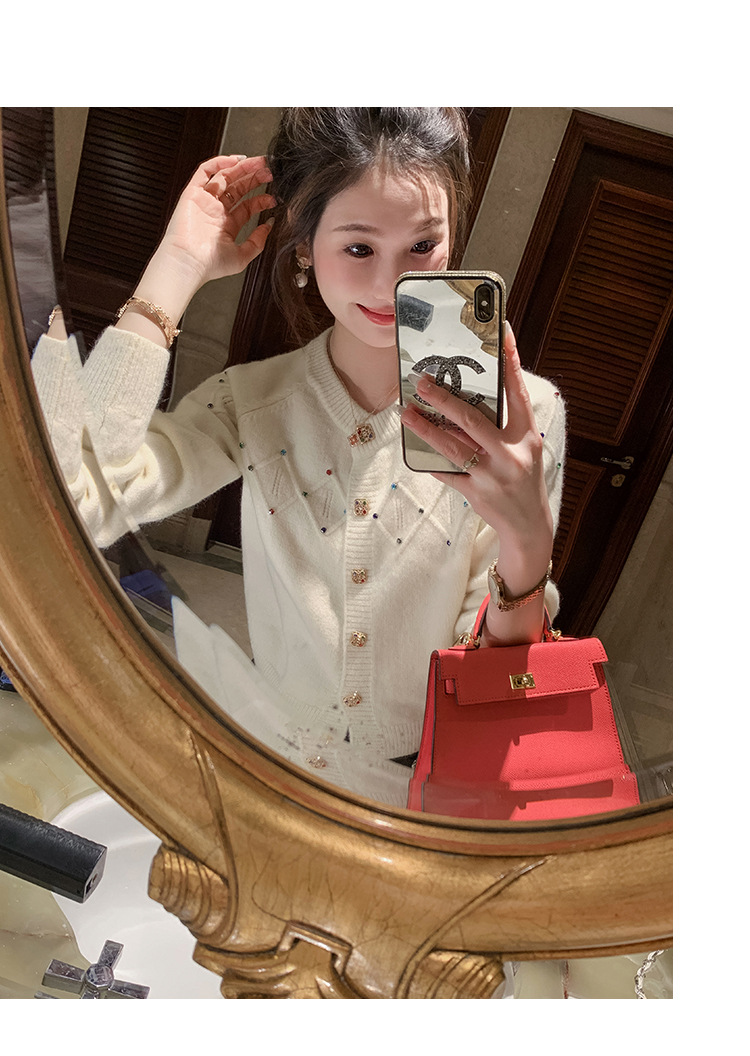 화이트 샤넬 크루 넥 스웨터 카디건 여성의 2024 가을과 겨울 새로운 독특한 세련된 디자인 감각 긴 소매 탑스토어 가기