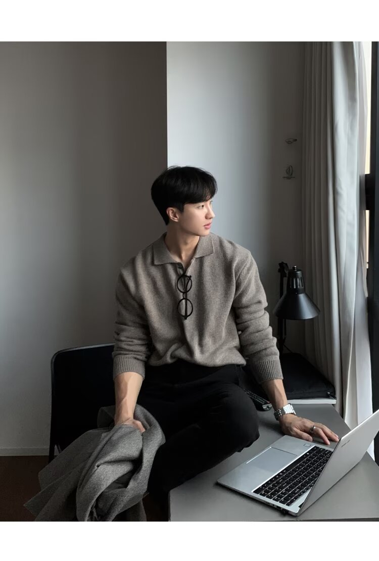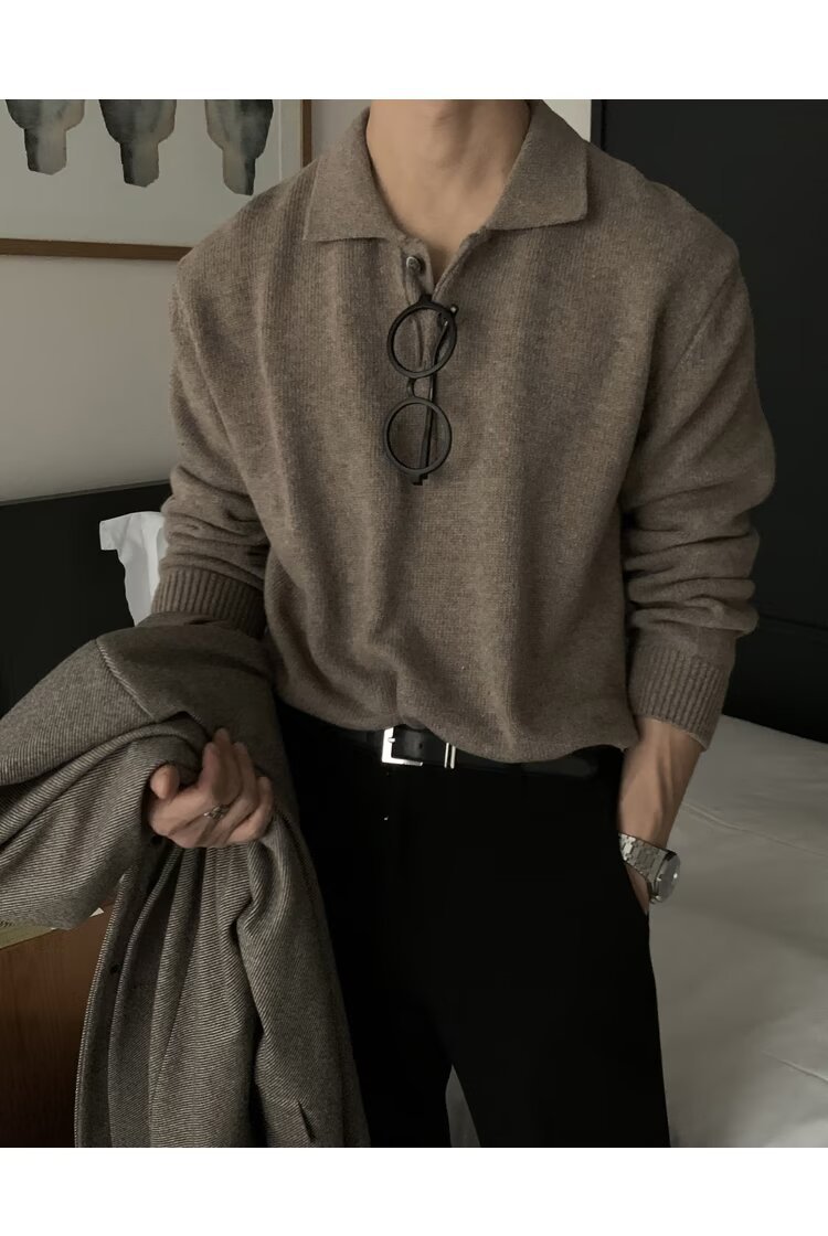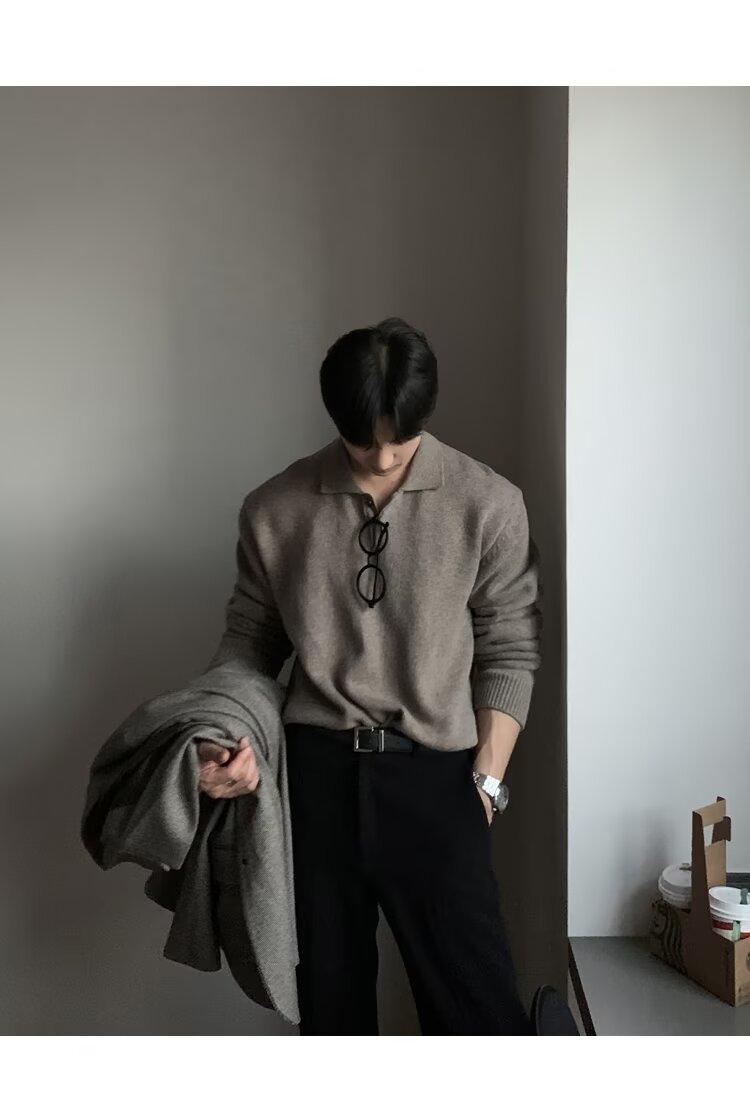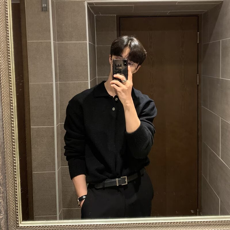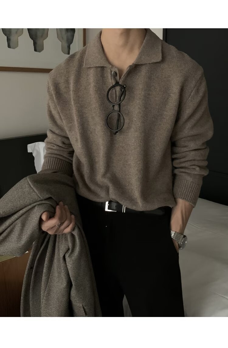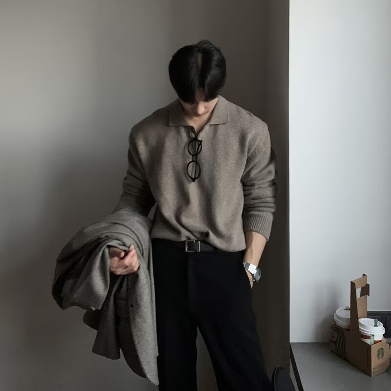 트렌디 한 새로운 동대문 한국 남성용 레이저 스웨터 남성 디자이너 폴로 칼라 피부 친화적 인 느슨한 니트 스웨터