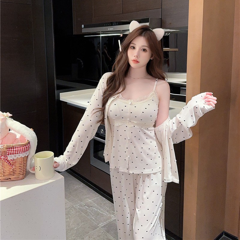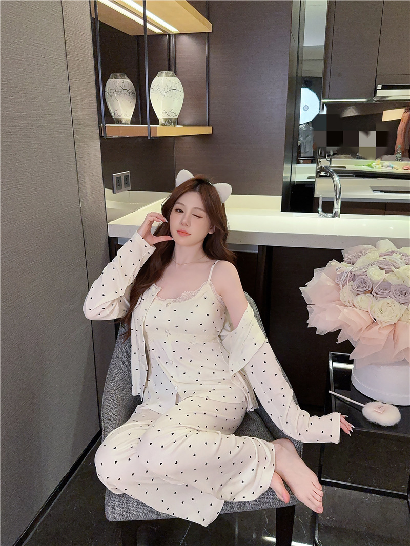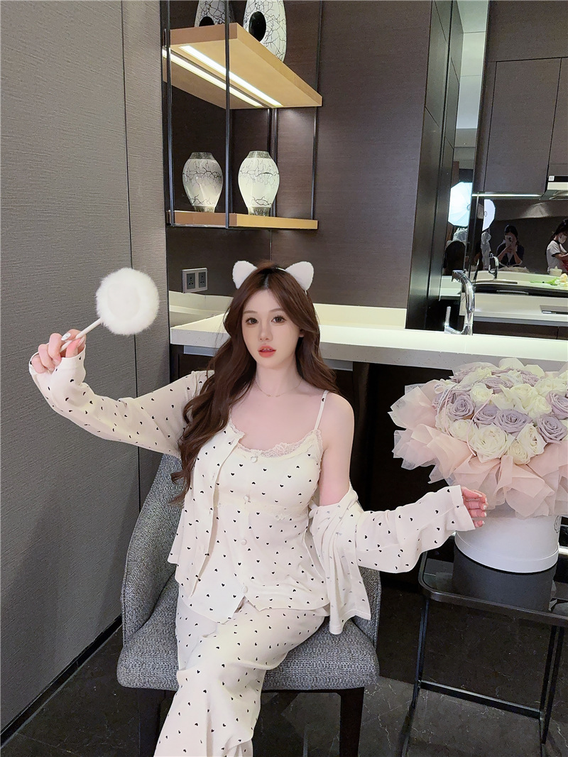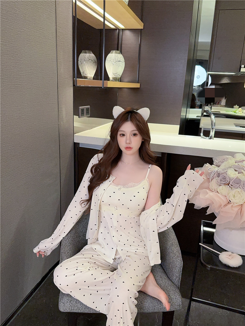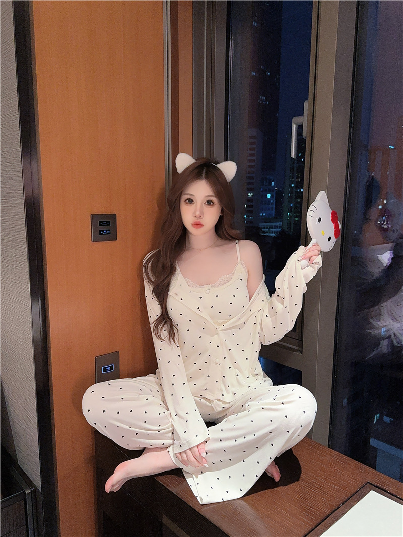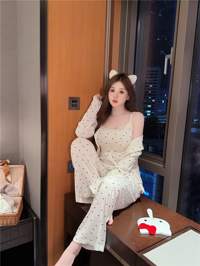 잠옷 여성의 봄과 가을 모달 양면 복숭아 하트 인쇄 긴 소매 바지 슬링 3 피스 세트 플러스 유방면 헤어 벨트