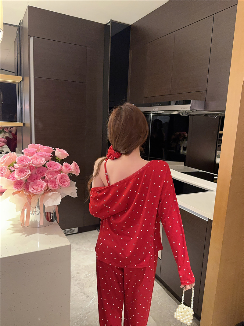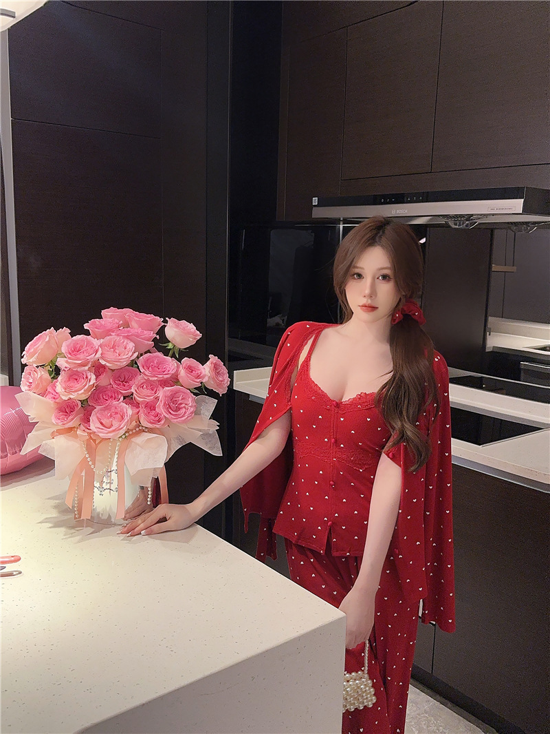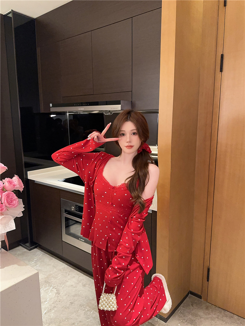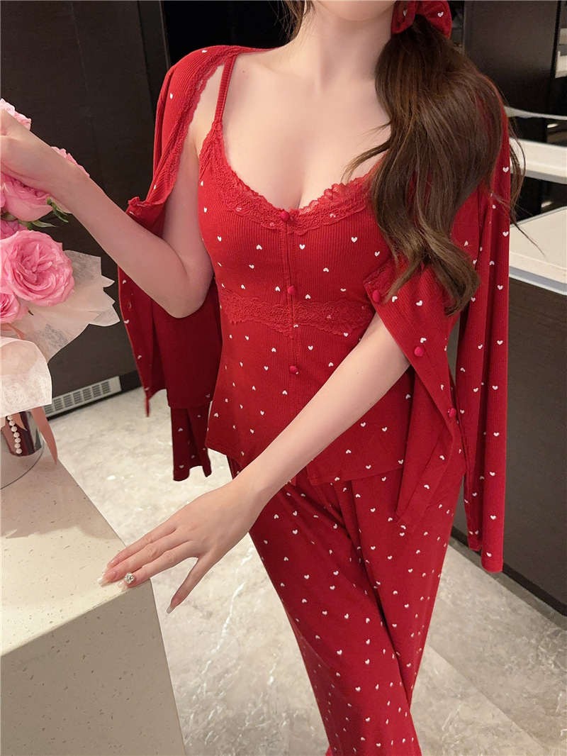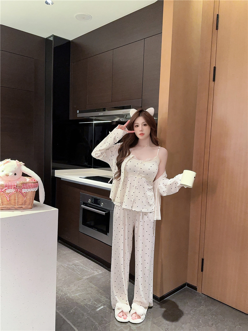 잠옷 여성의 봄과 가을 모달 양면 복숭아 하트 인쇄 긴 소매 바지 슬링 3 피스 세트 플러스 유방면 헤어 벨트